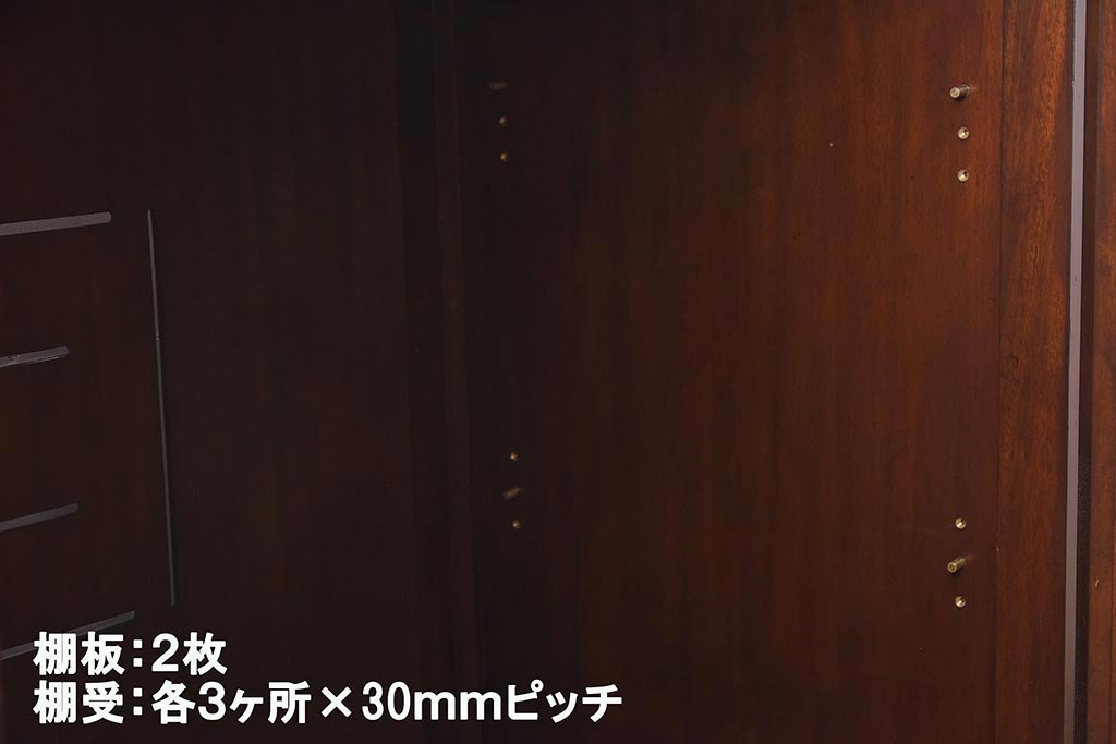 棚板は取り外しできます。棚板は2枚あります。棚受けは各3ヶ所、30mmピッチで調整できます。棚幅サイズのものが1枚の作りです。