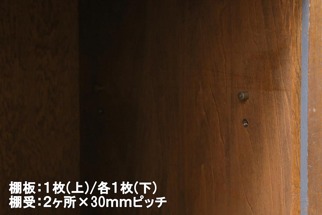 棚板は取り外しできます。棚板は上:1枚、下:各1枚あります。棚受けは上下各2ヶ所、30mmピッチで調整できます。棚幅サイズのものが1枚の作りです。
