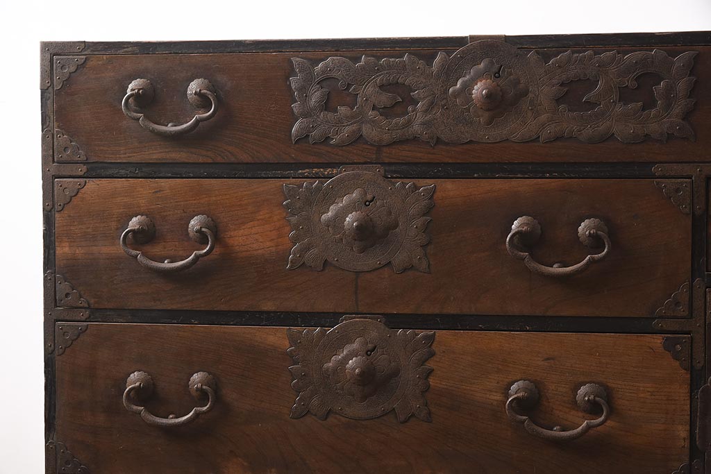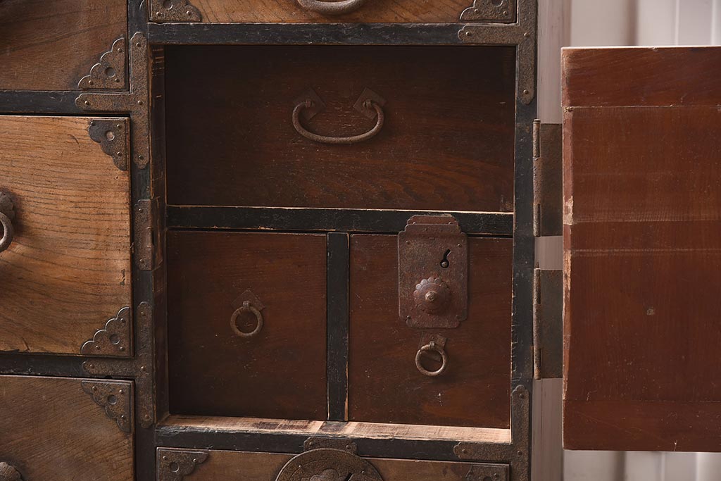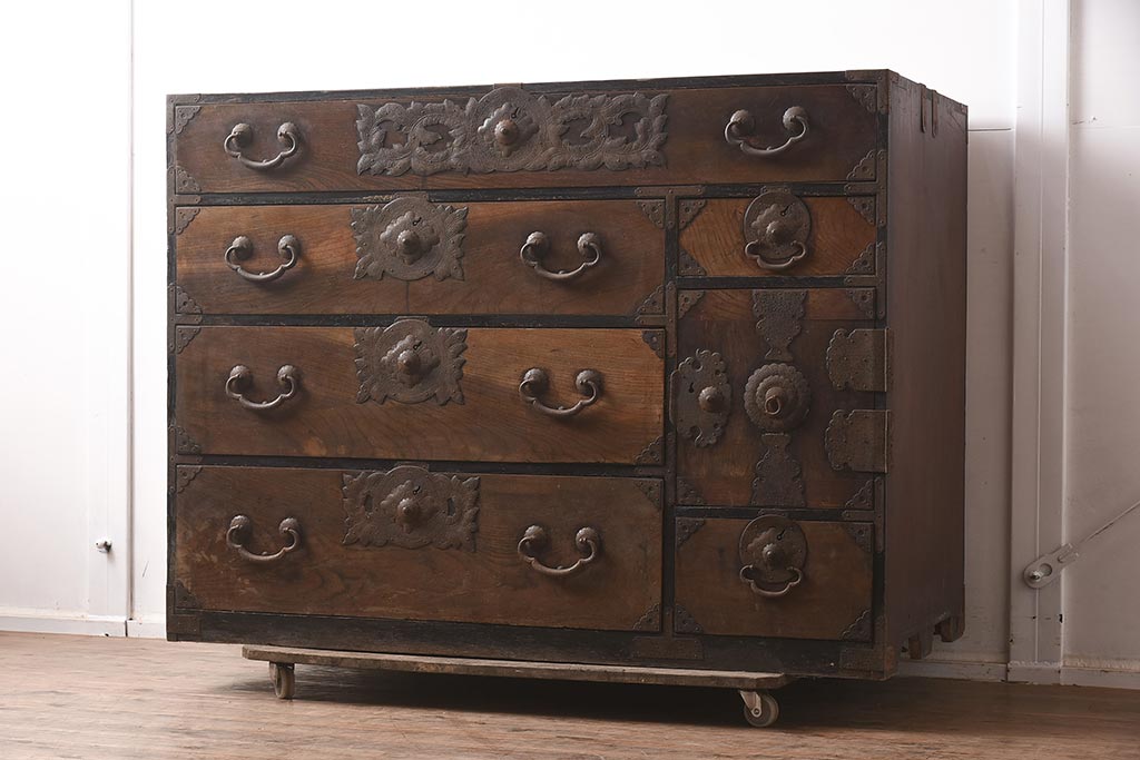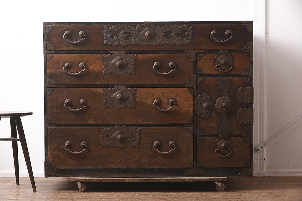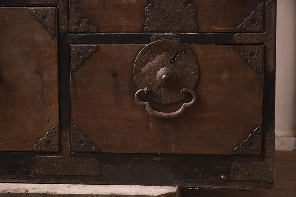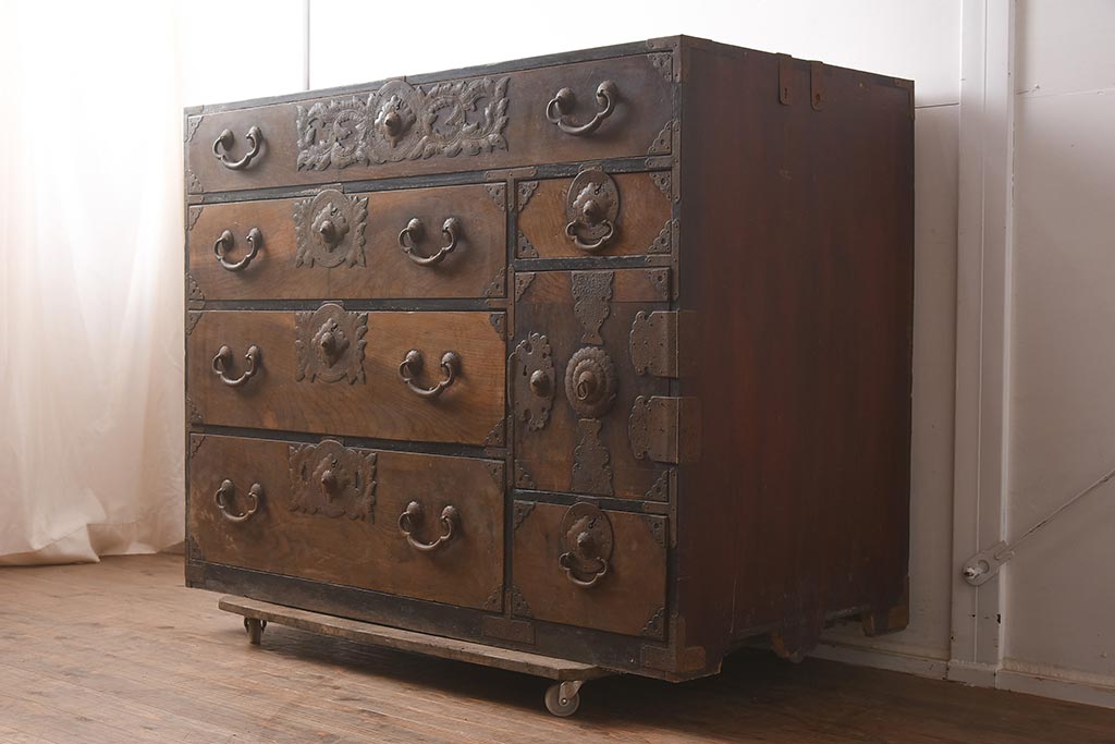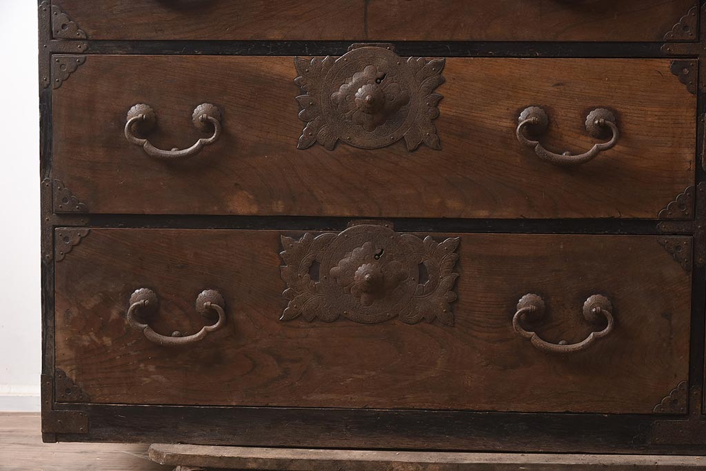 和箪笥 > アンティーク家具 明治期 前面欅(ケヤキ)材 堂々とした金具が魅力の仙台箪笥(時代箪笥、衣装箪笥)(R-042961)