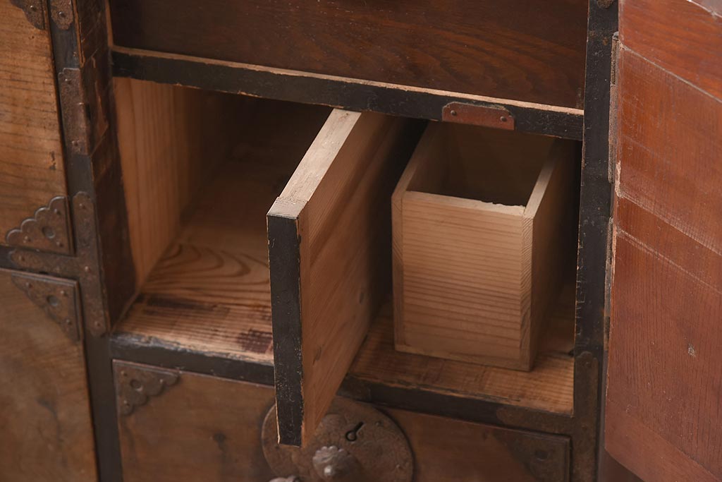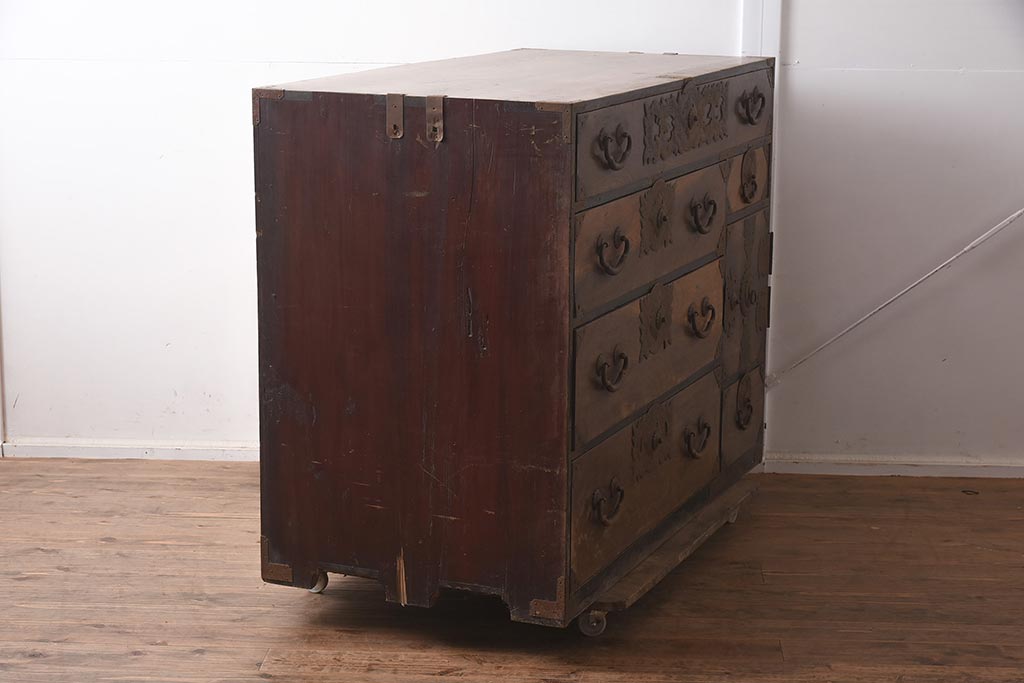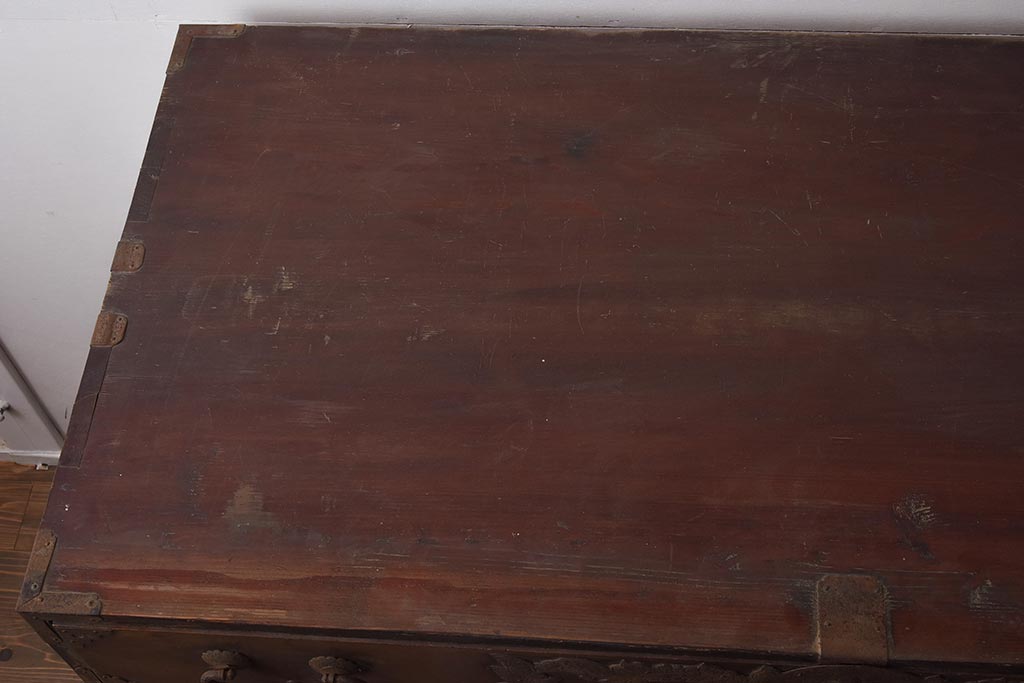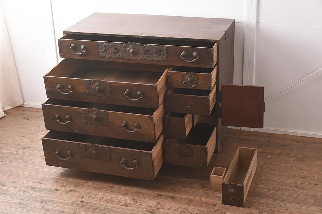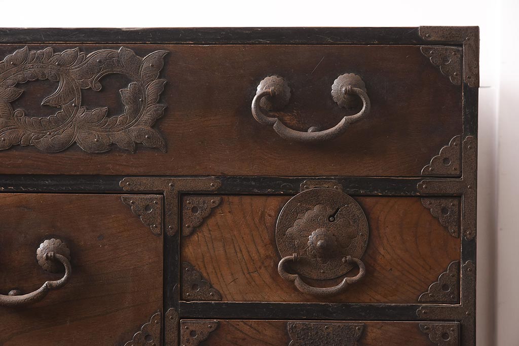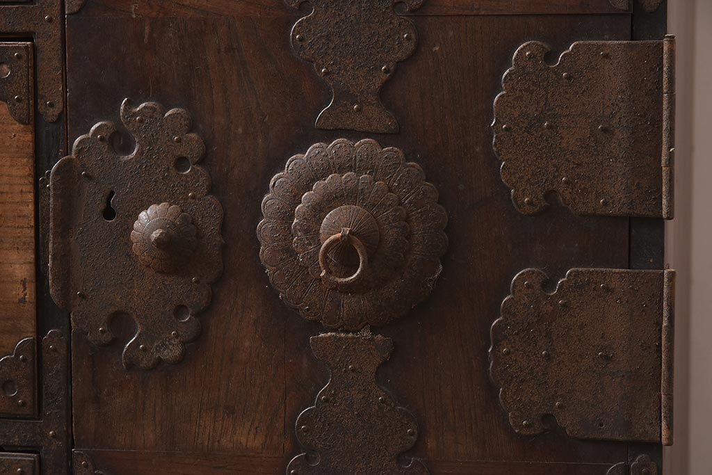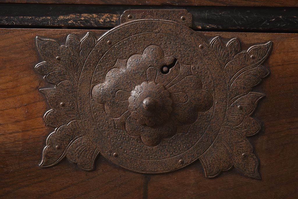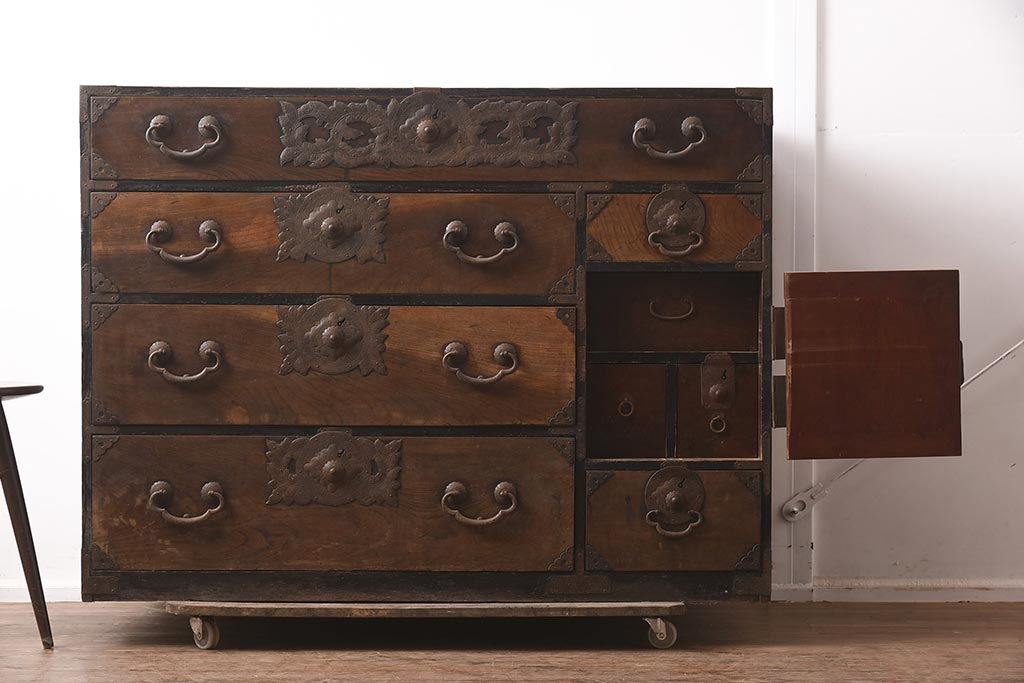 和箪笥 > アンティーク家具 明治期 前面欅(ケヤキ)材 堂々とした金具が魅力の仙台箪笥(時代箪笥、衣装箪笥)(R-042961)