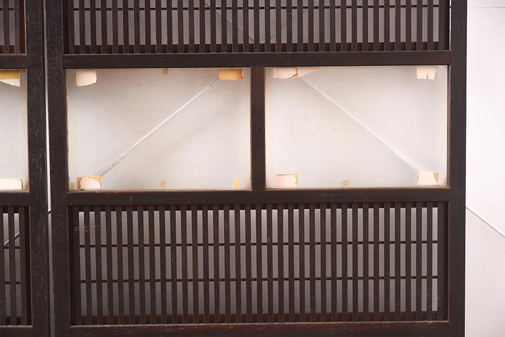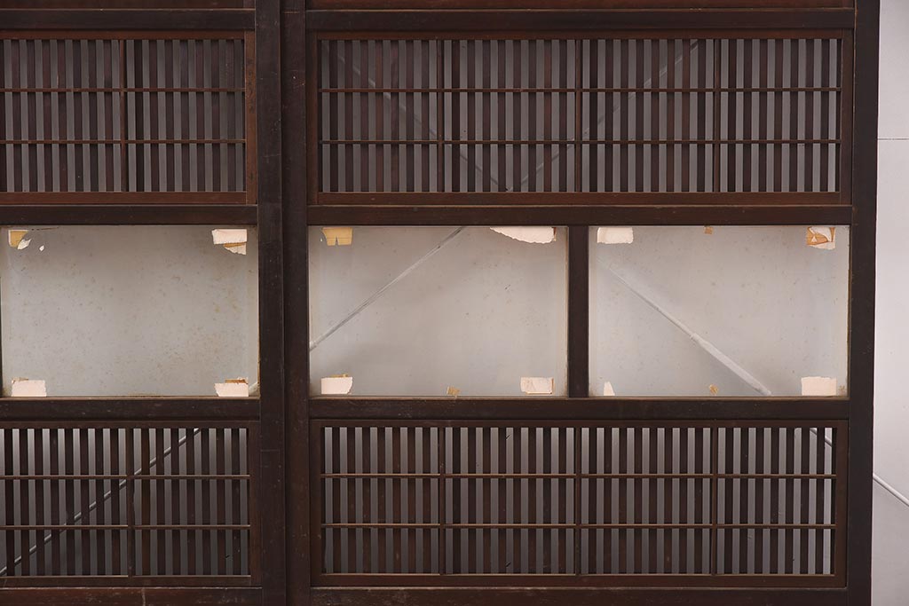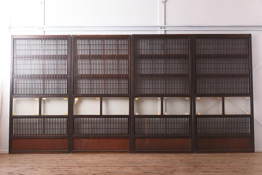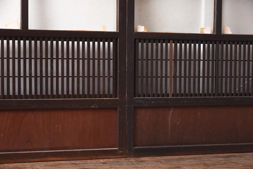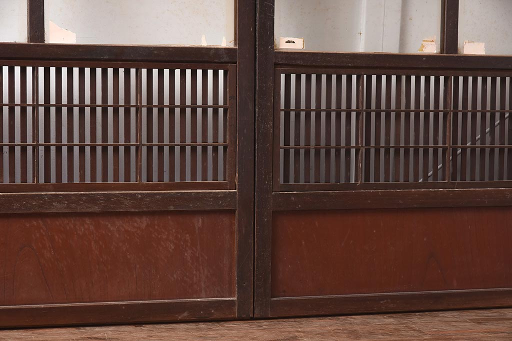 ラフジュ工房> ドア・建具> 引き戸 > アンティーク建具 昭和初期 裏障子付き 腰板欅(ケヤキ)材 格子戸4枚セット(ガラス帯戸、引き戸)(R-042970)