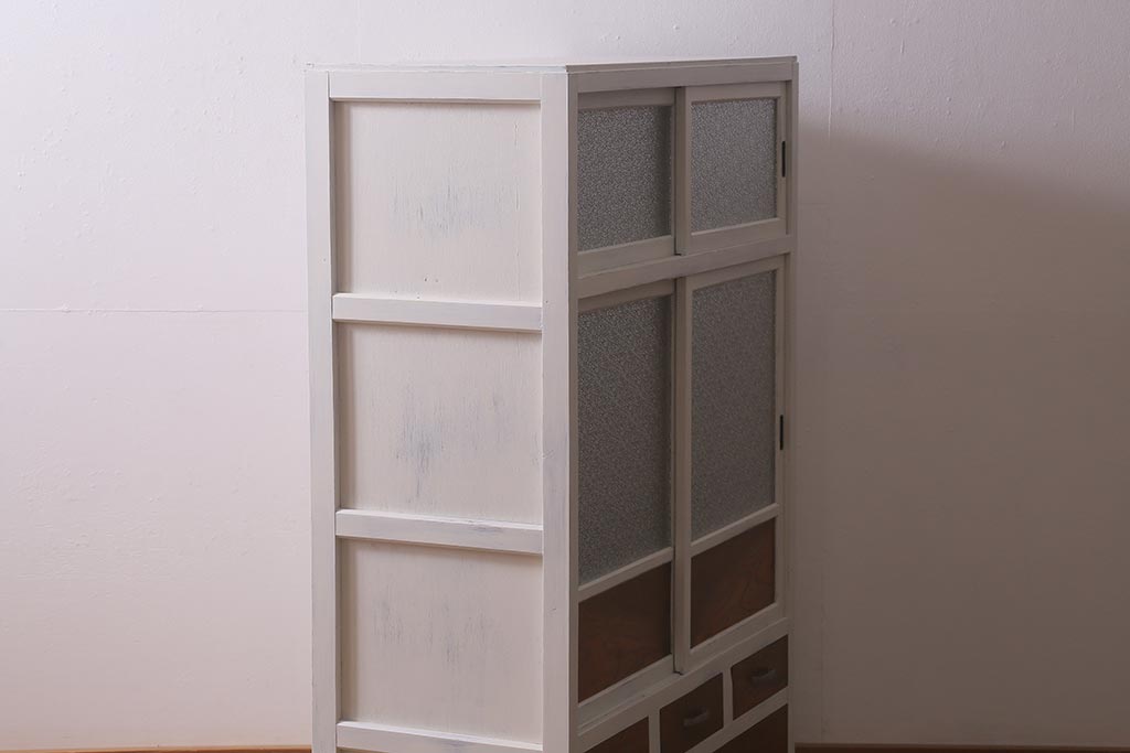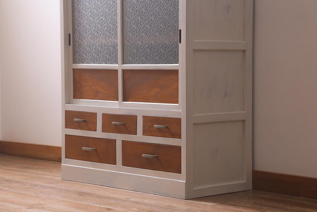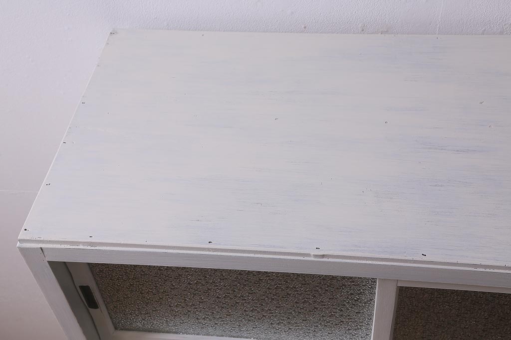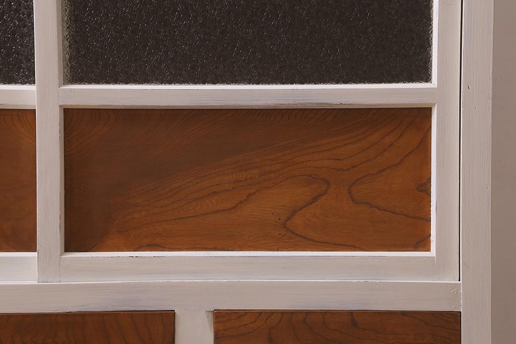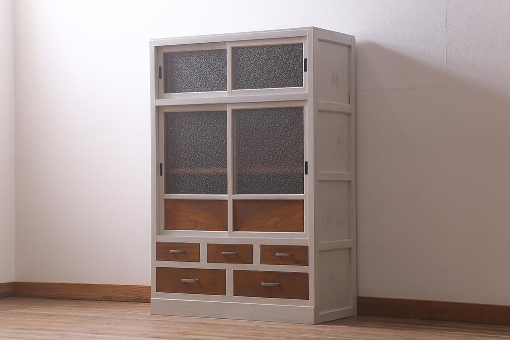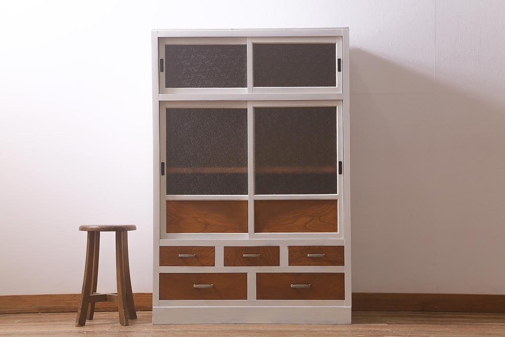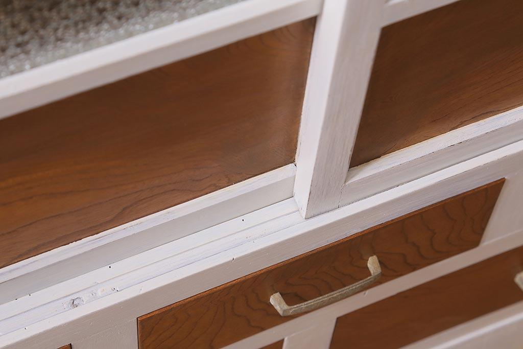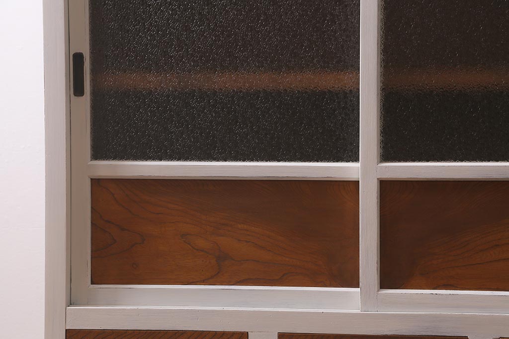 アンティーク家具 昭和中期 ペイント ダイヤガラス入り ツートンカラーがおしゃれなガラス戸棚(収納棚、キャビネット)(R-042907)です。