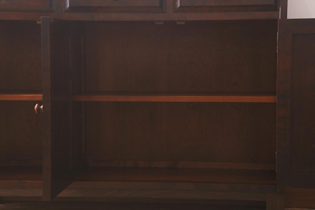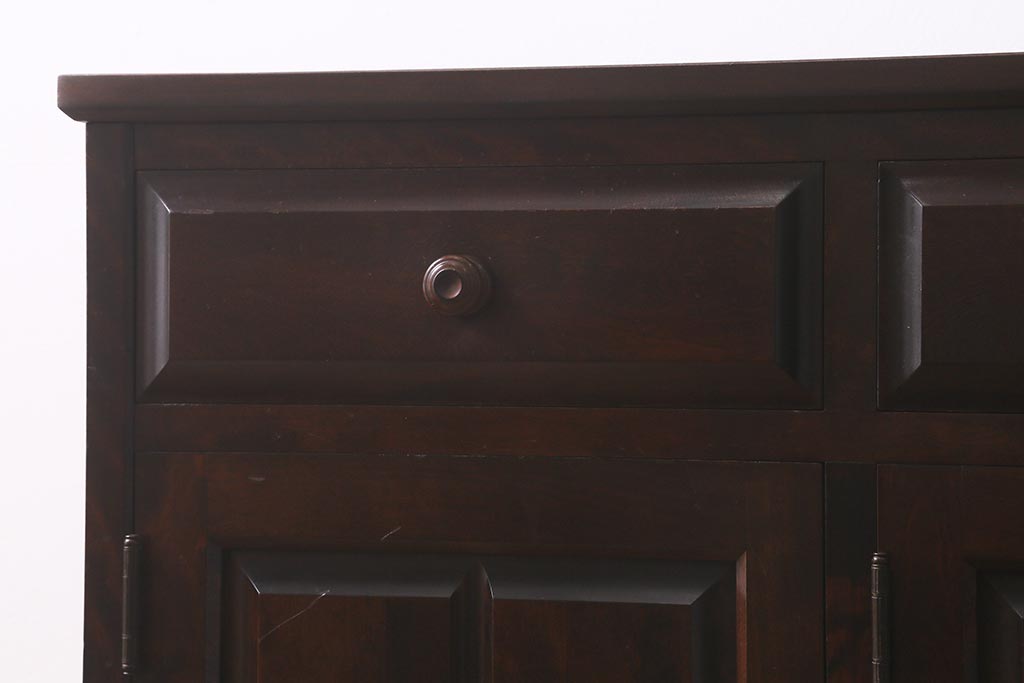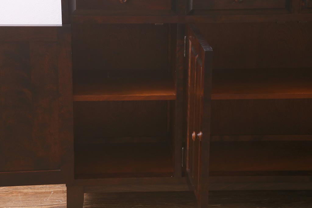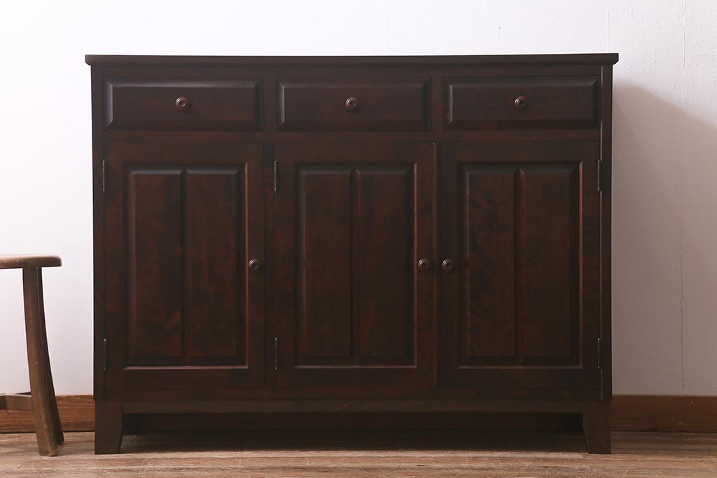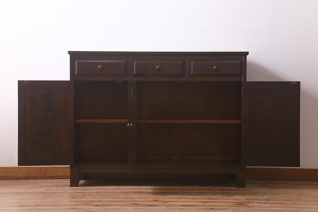 民芸家具 > 中古 リメイク 北海道民芸家具 モダンなデザインで使いやすい脚付きサイドボード(収納棚、戸棚)(R-042935)
