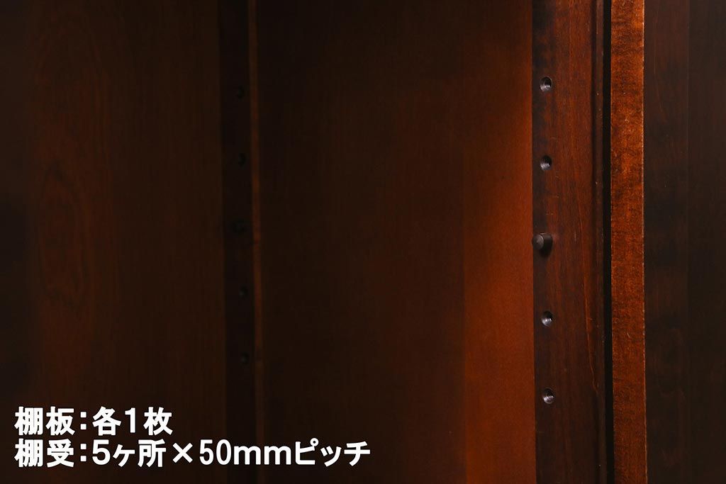 棚板は取り外しできます。棚板は各1枚あります。棚受けは5ヶ所、50mmピッチで調整できます。棚幅サイズのものが1枚の作りです。