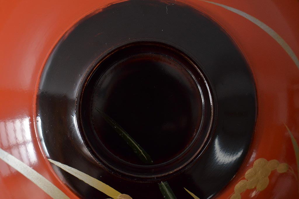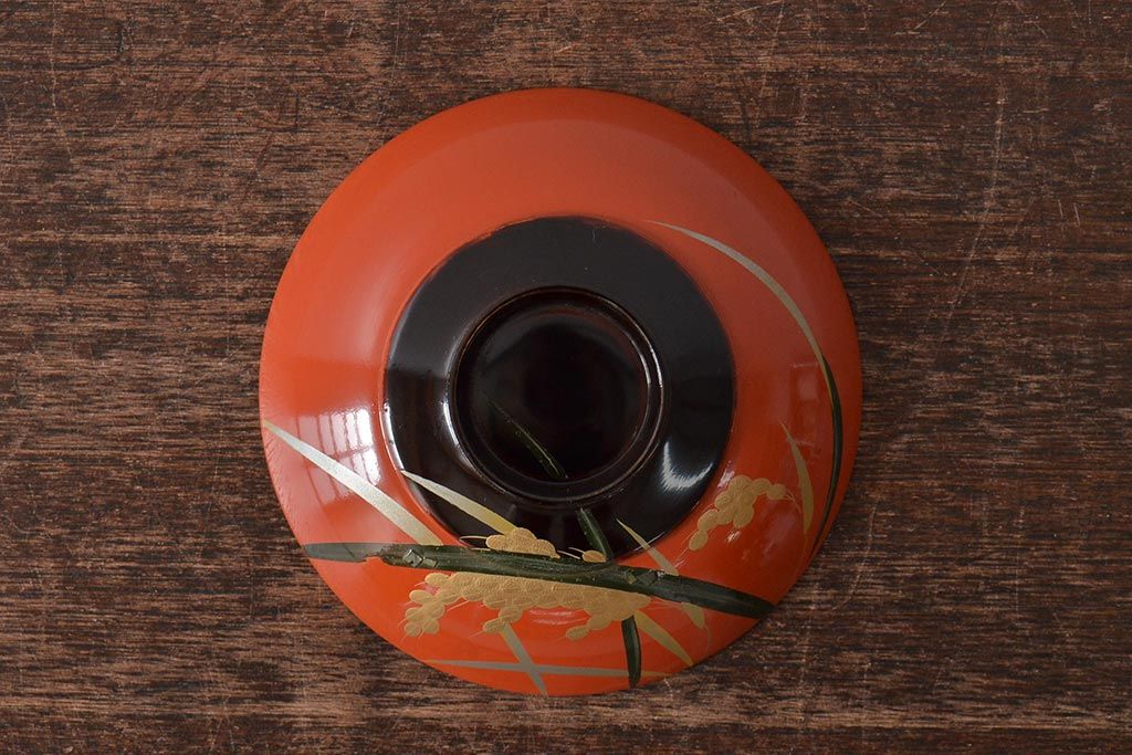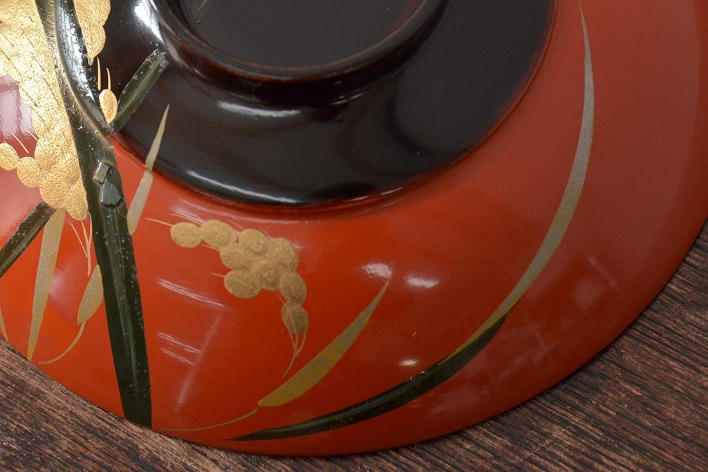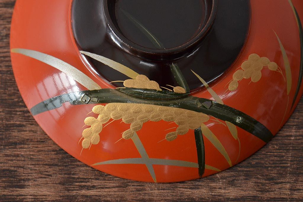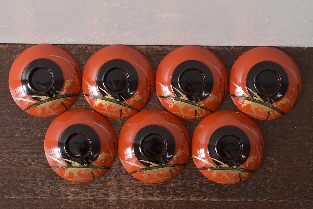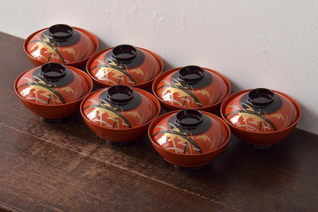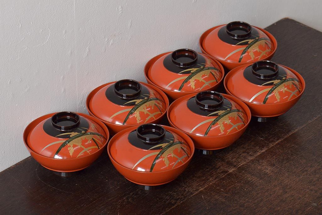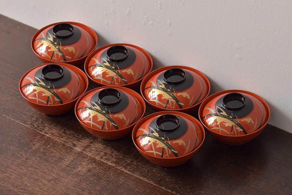 アンティーク雑貨 大正昭和初期 朱塗稲穂蒔絵木製椀7客セット(漆器、お椀)(R-043092)