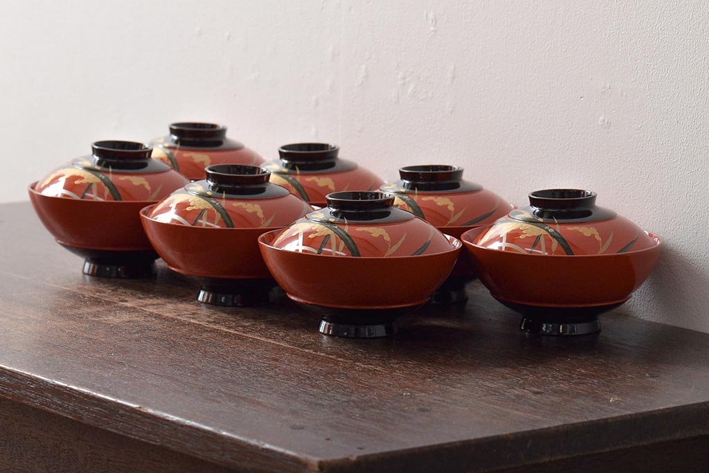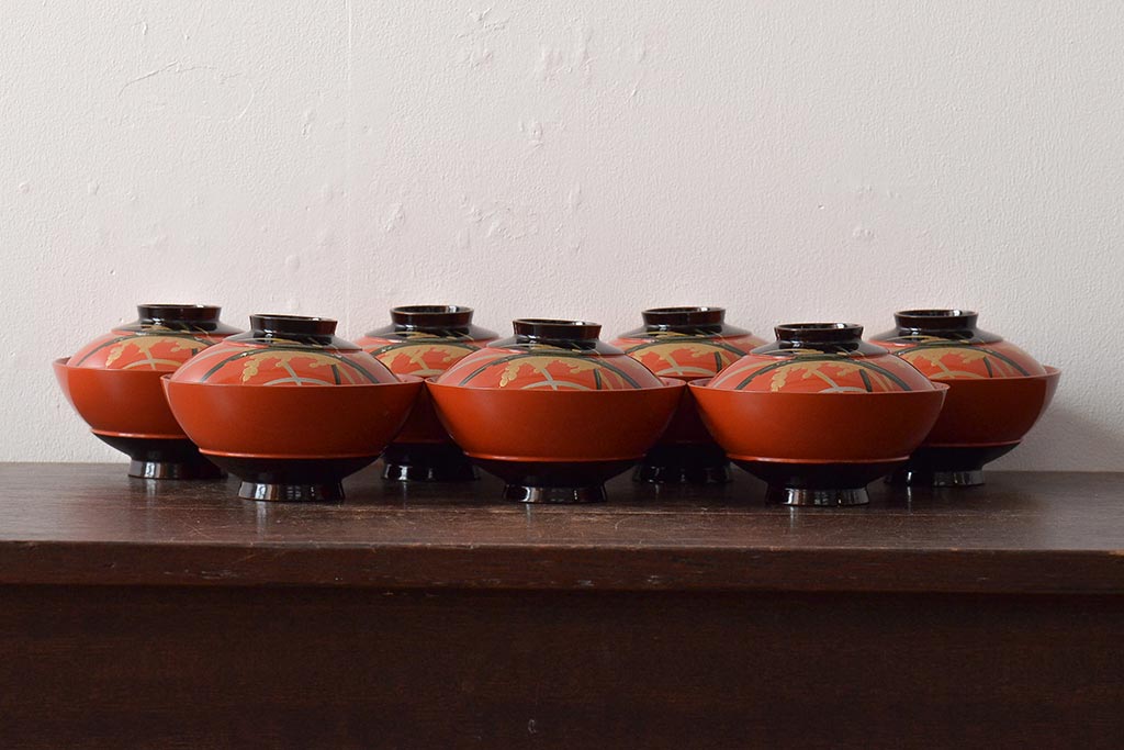 ラフジュ工房> 和食器・茶道具> お椀・茶碗 > アンティーク雑貨 大正昭和初期 朱塗稲穂蒔絵木製椀7客セット(漆器、お椀)(R-043092)