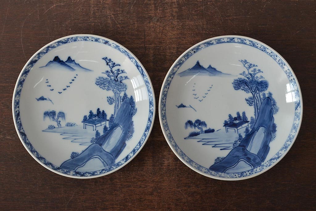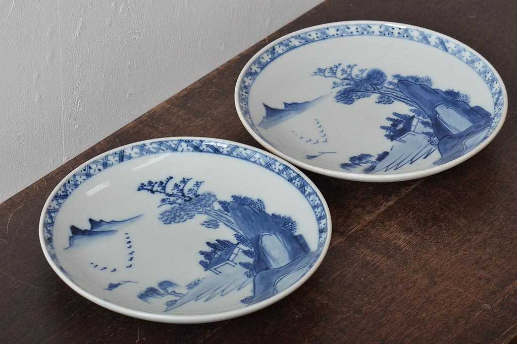 アンティーク雑貨 明治期 山水図 九谷 8寸染付皿2枚セット(和食器、中皿)(R-043106)