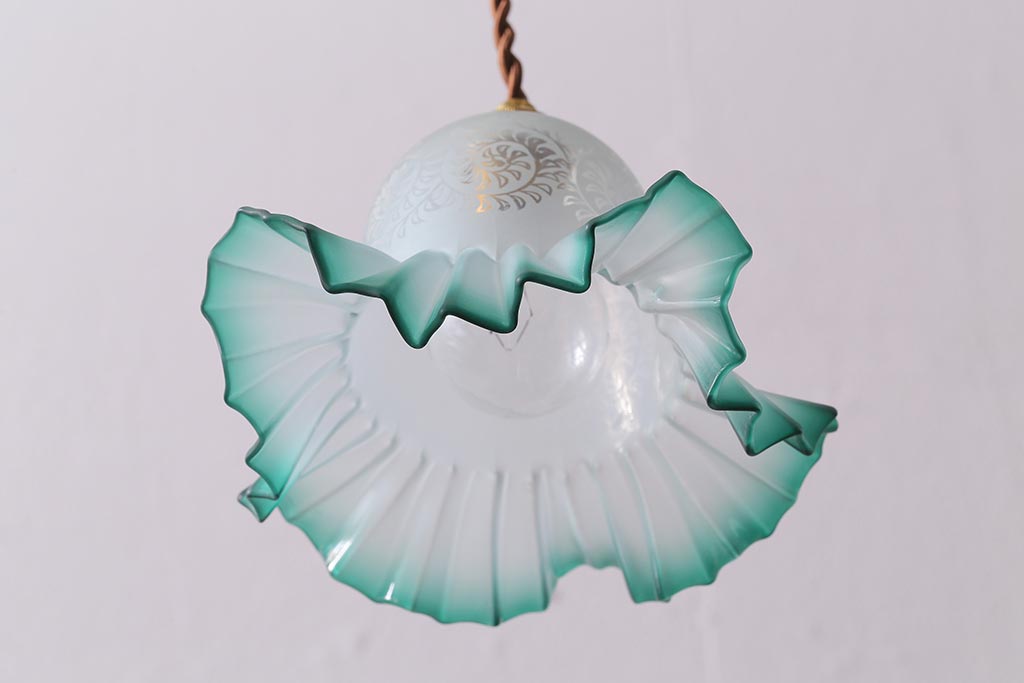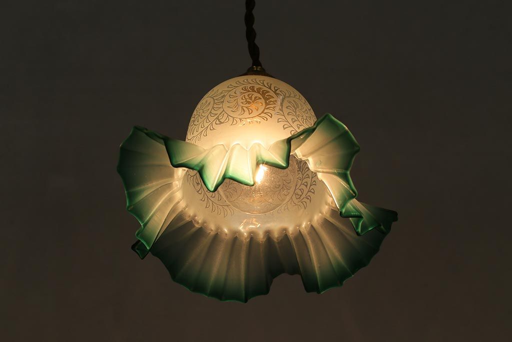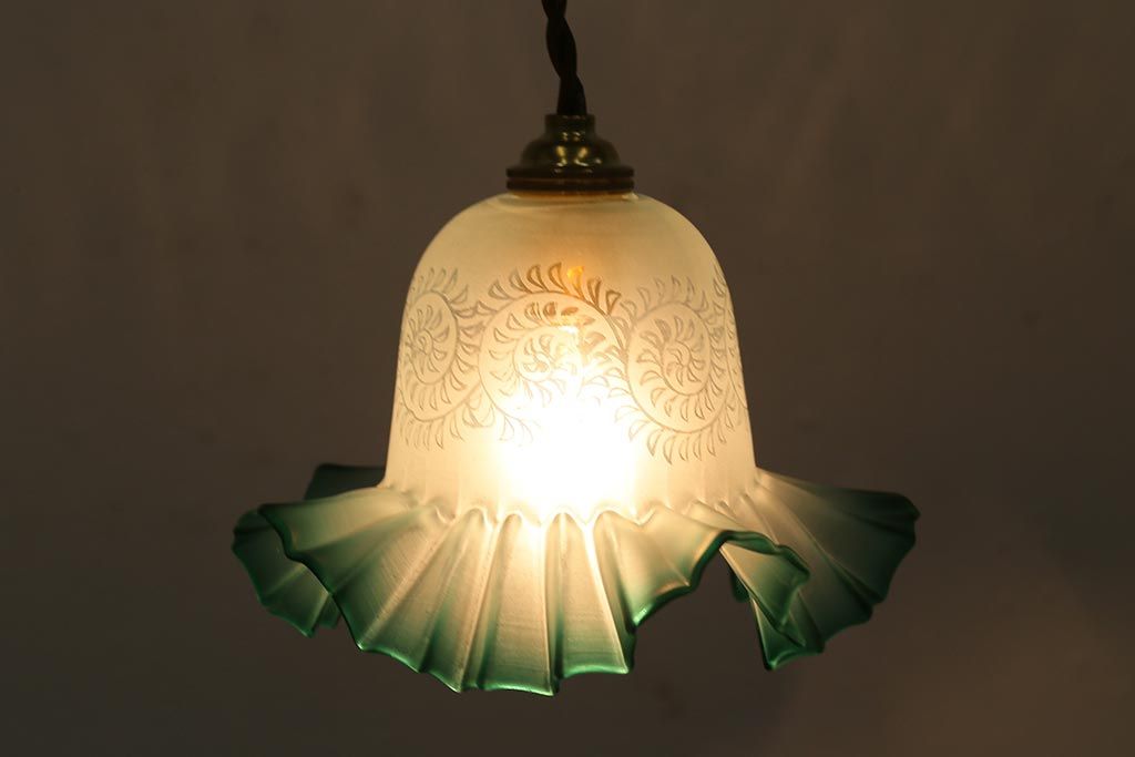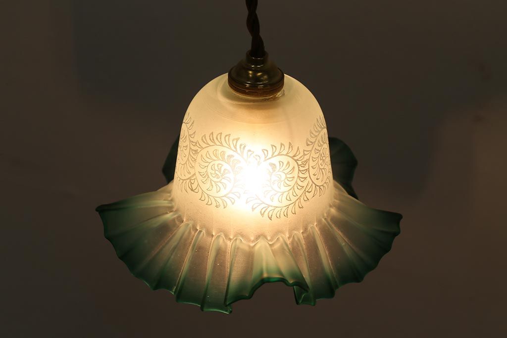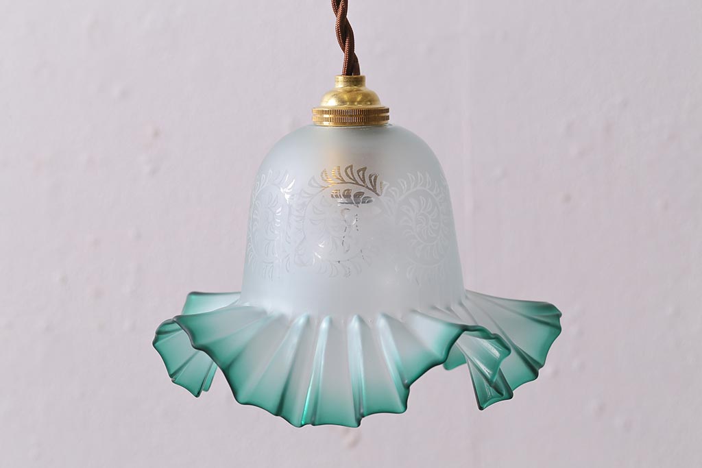 ヴィンテージ照明 イギリスビンテージ エッチングガラスとフリルシェードがお洒落なペンダントライト(ランプシェード、天井照明)(R-043118)です。