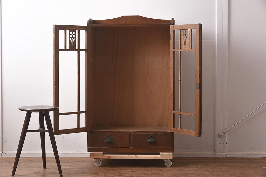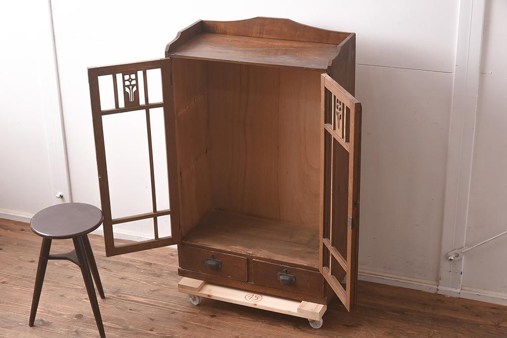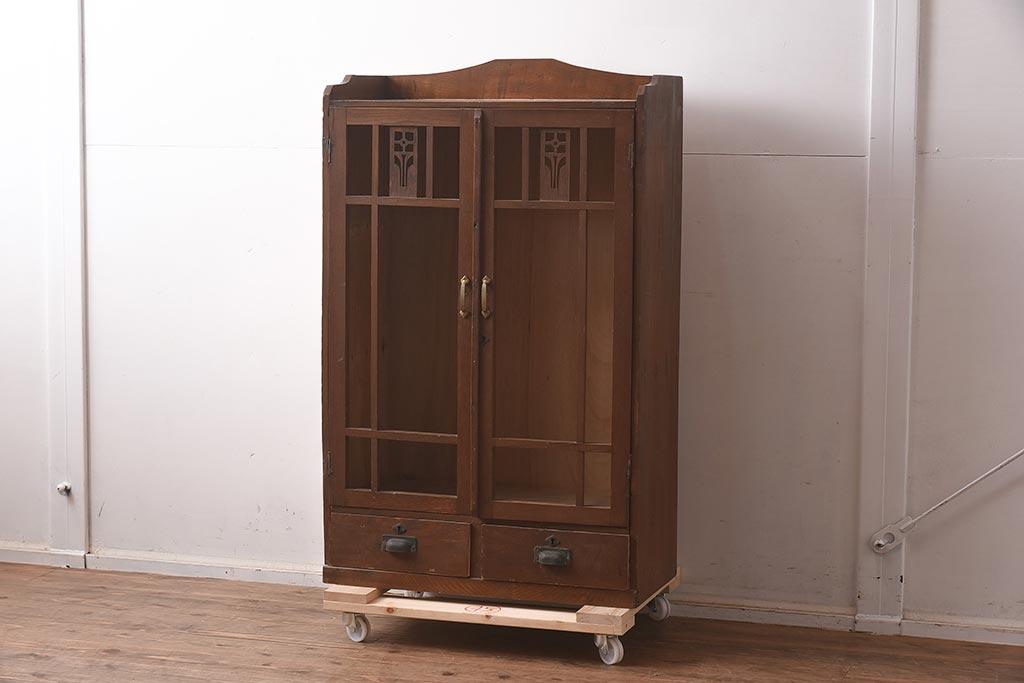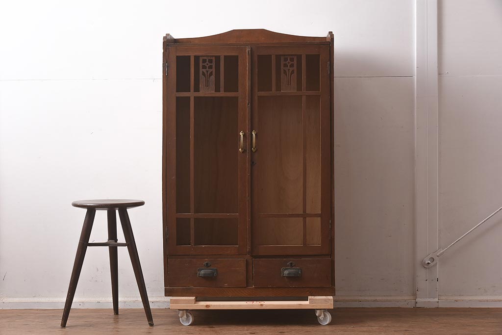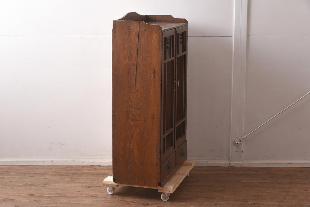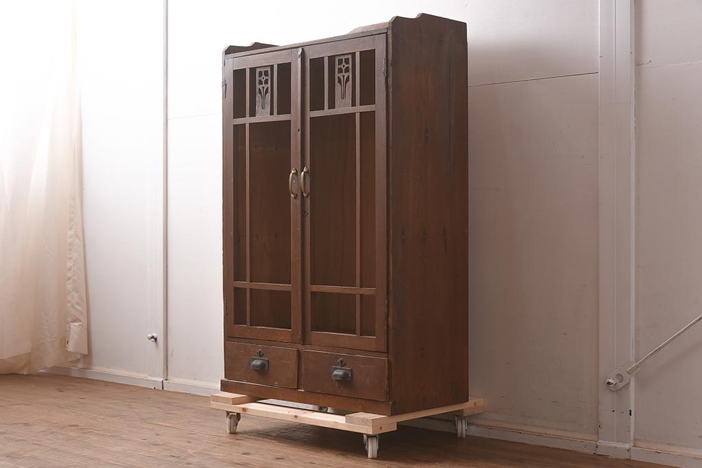 和製アンティーク 大正昭和初期 栓材 大正ロマン 花の透かし彫りが可愛い本箱(ブックケース、収納棚、飾り棚、キャビネット)(R-042904)