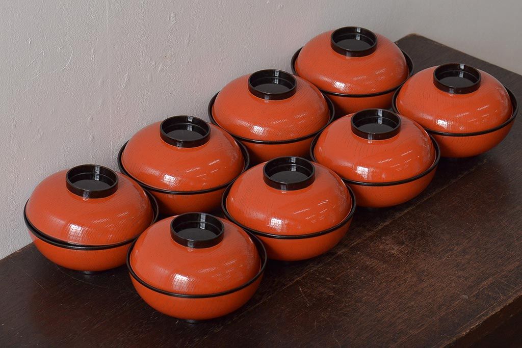 アンティーク雑貨 明治大正期 欅製朱塗椀8客セット(漆器、お椀、和食器)(R-043090)