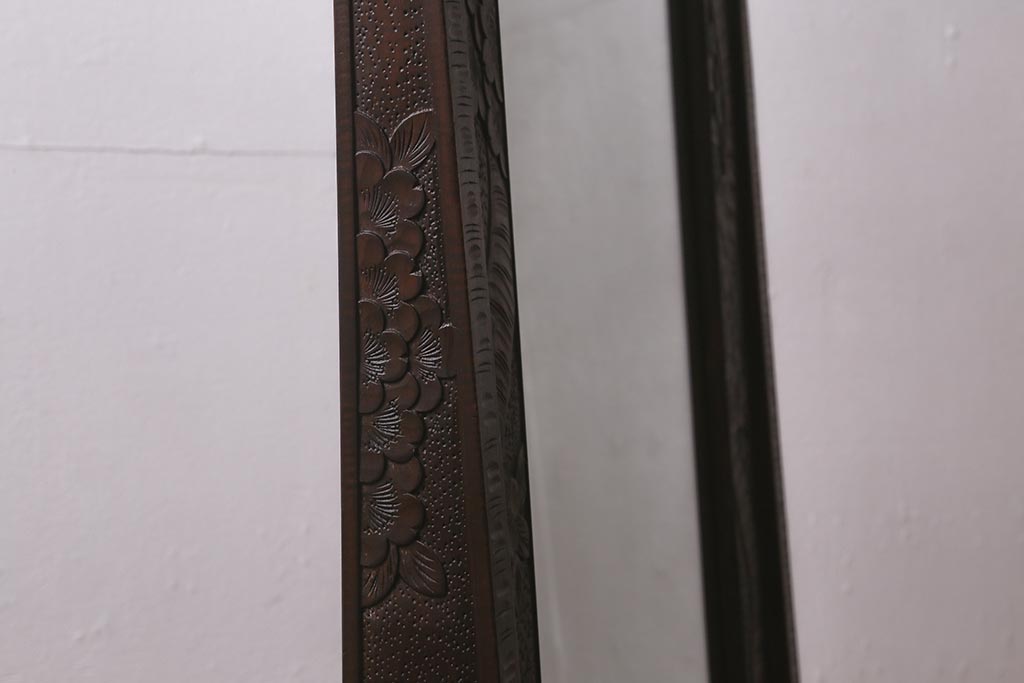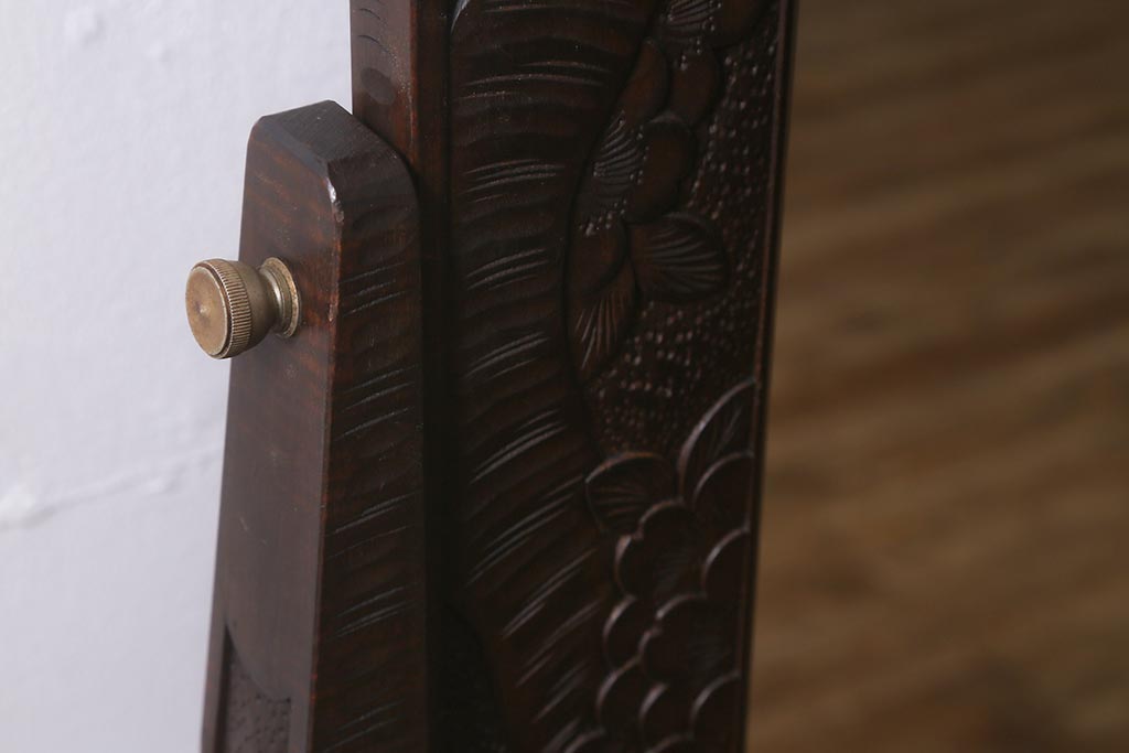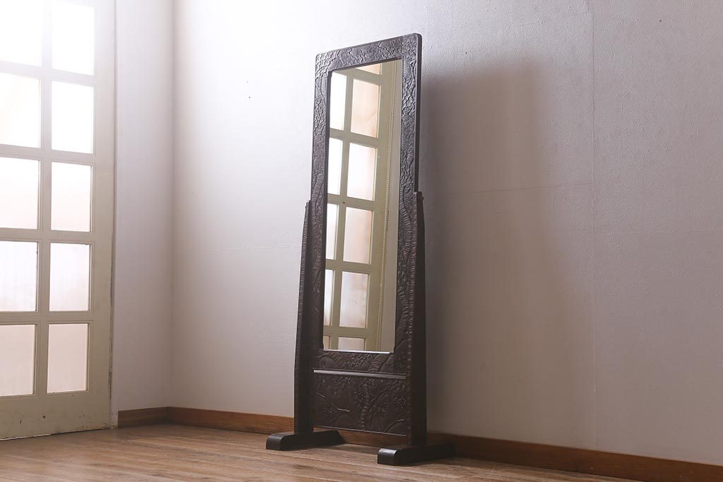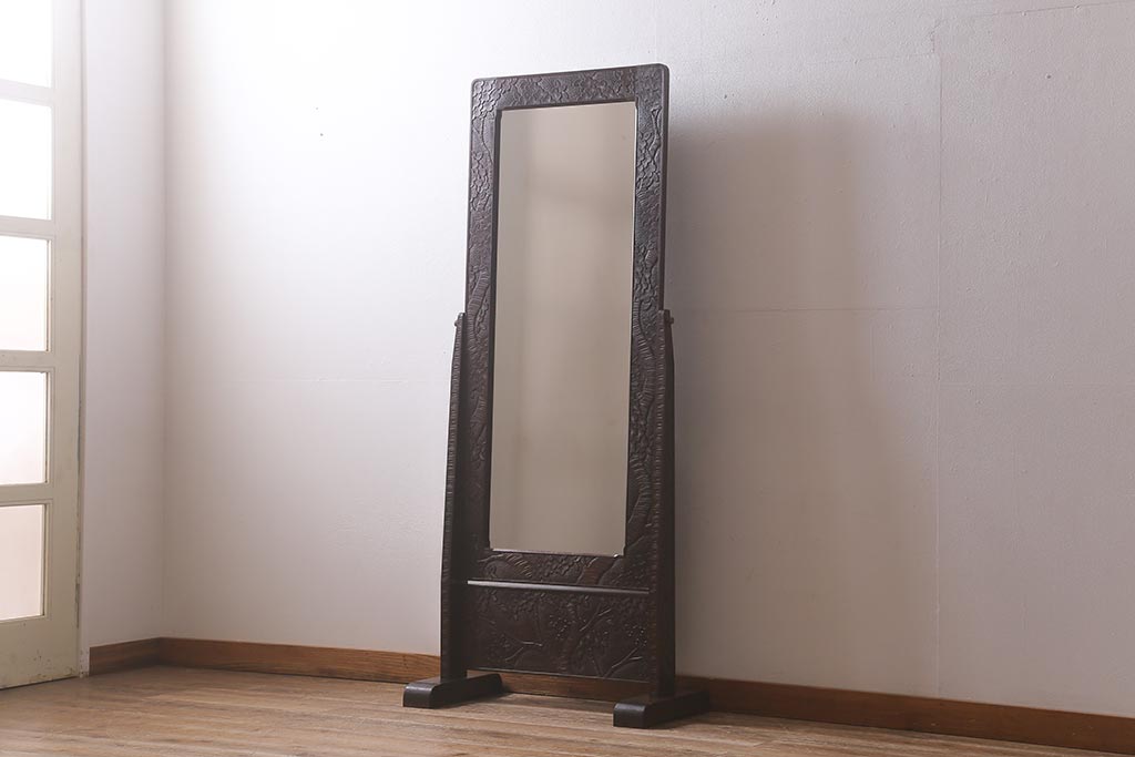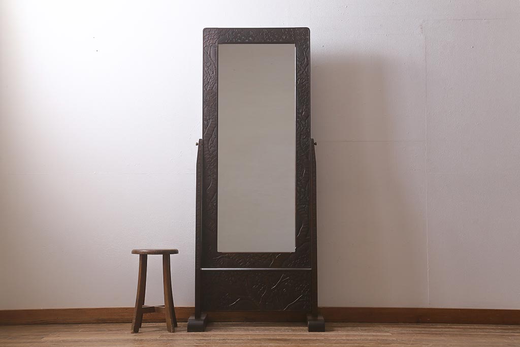 民芸家具 > ビンテージ家具 伝統工芸 軽井沢彫り 桜の彫りが目を引く姿見(鏡、ミラー、ヴィンテージ)(R-043126)