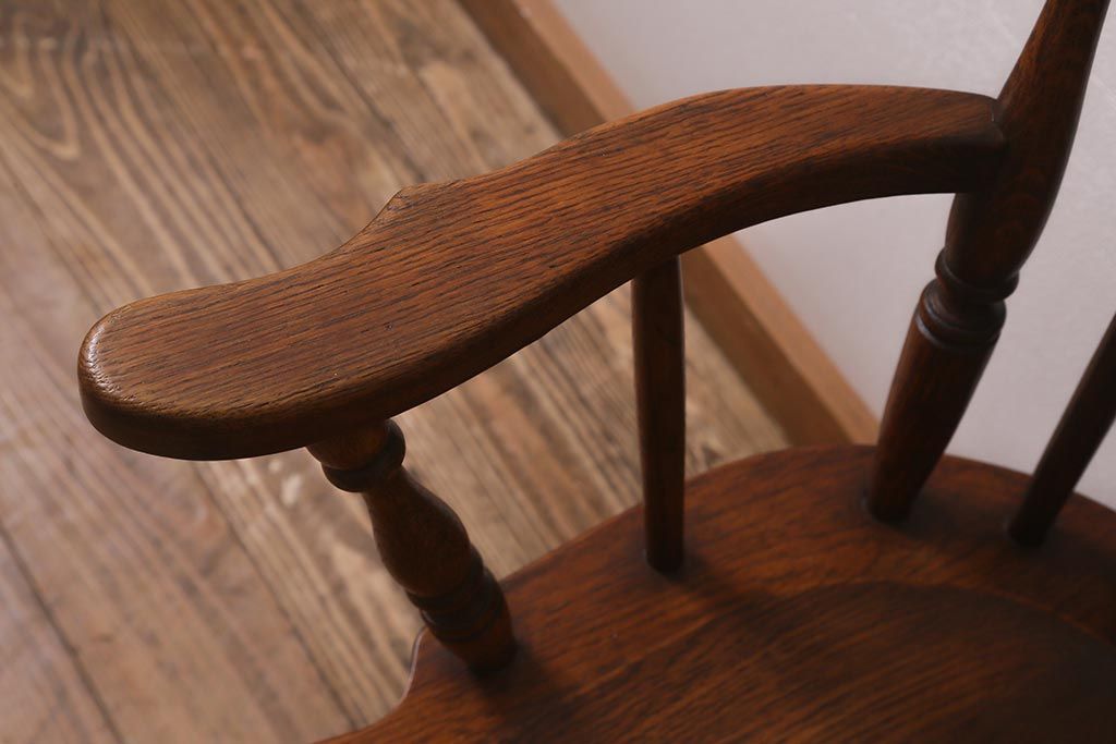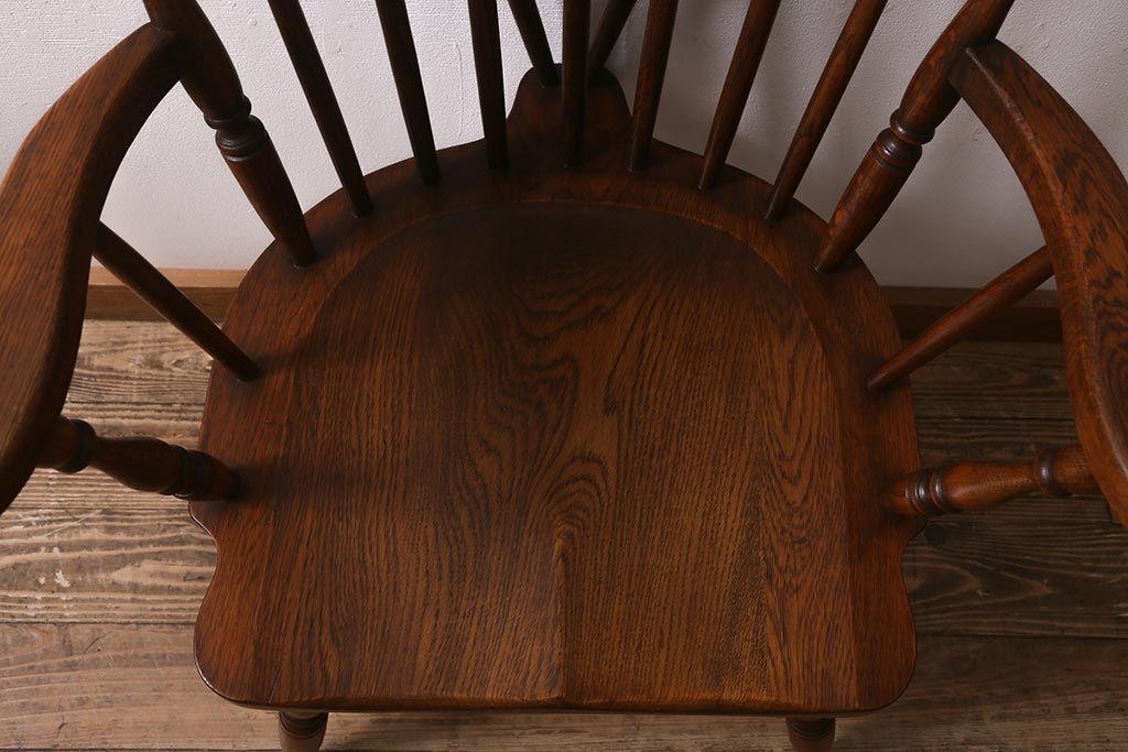 イギリスビンテージ オーク材 脚の挽き加工が上品なアームチェア(ダイニングチェア、板座チェア、ウィンザーチェア、ウインザーチェア)(R-043275)