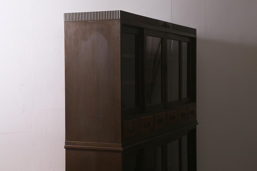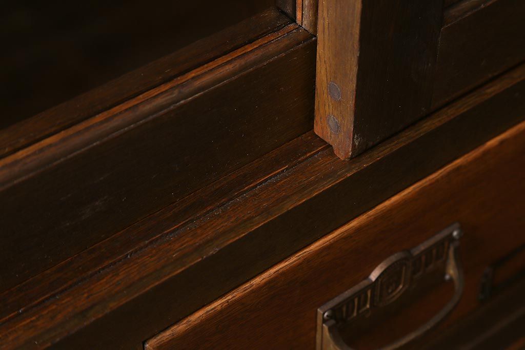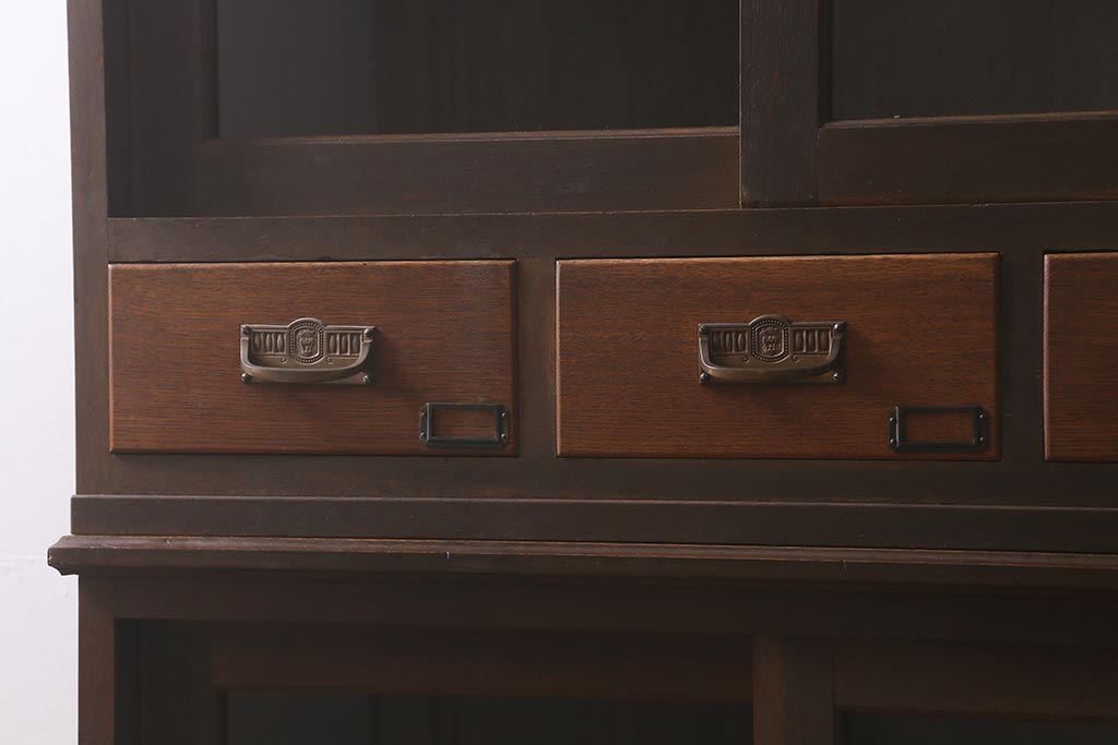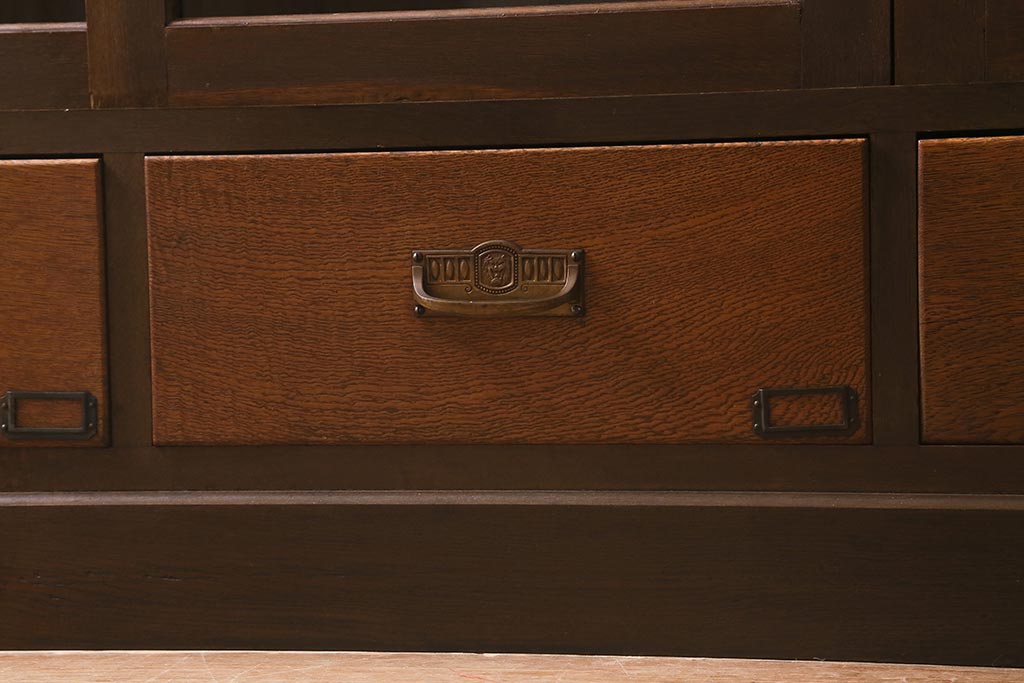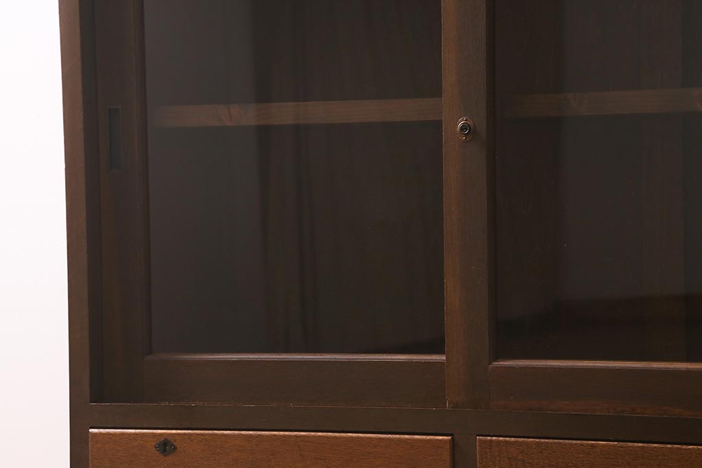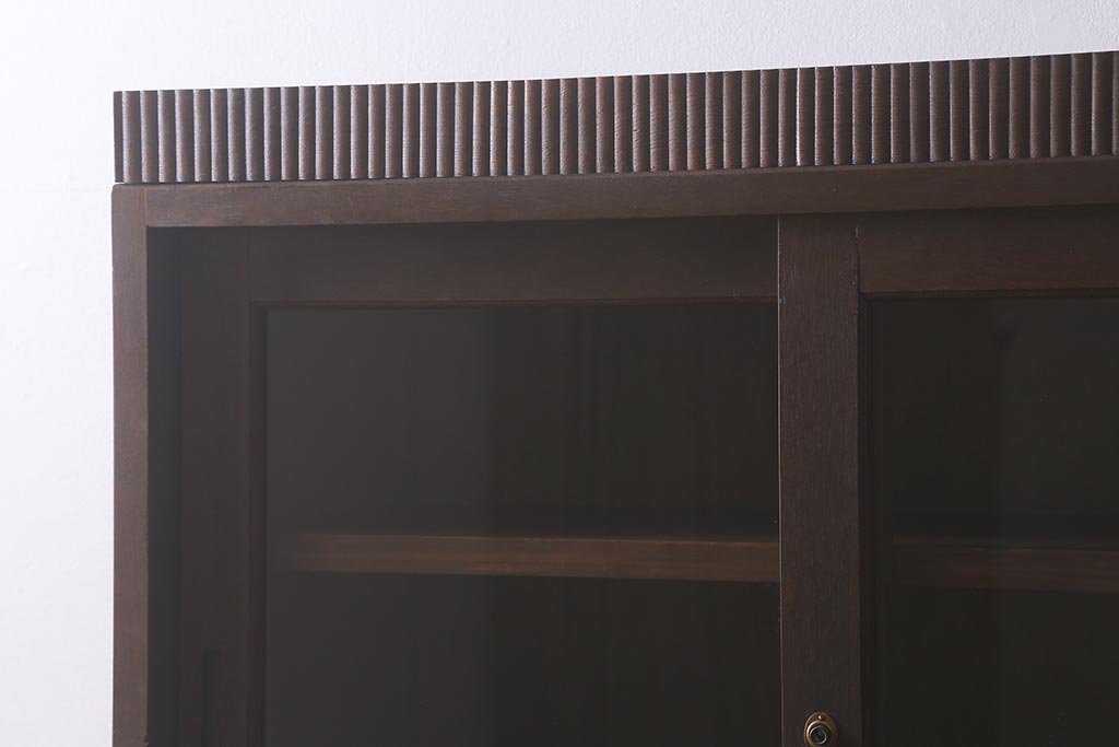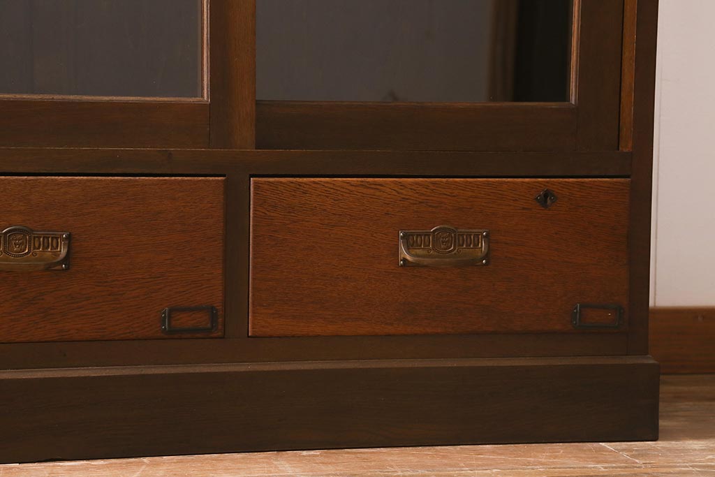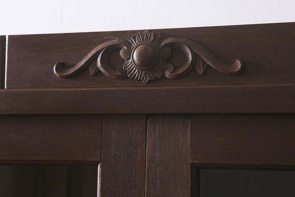 アンティーク家具 上手物! ナラ材 大正ロマン 四枚引き戸 おしゃれな意匠が目を引く重ねガラス戸棚(収納棚、飾り棚、キャビネット)(R-043056)です。