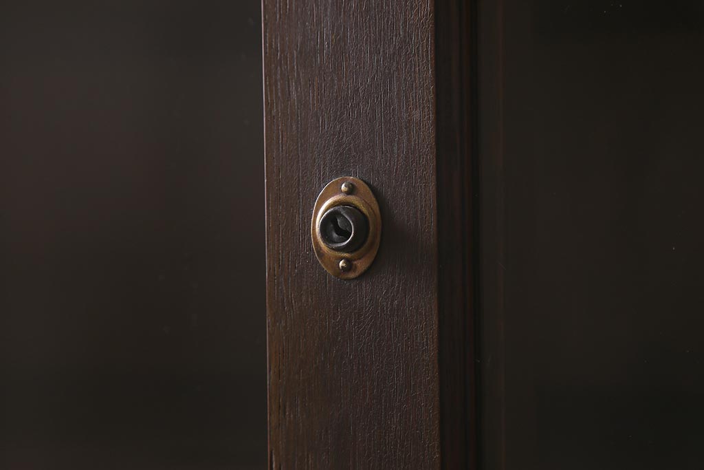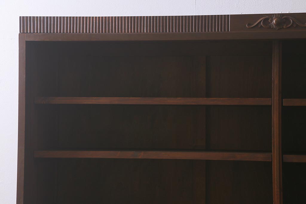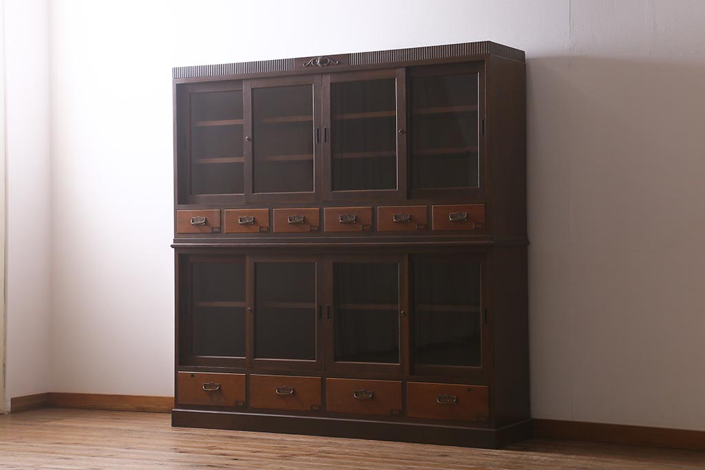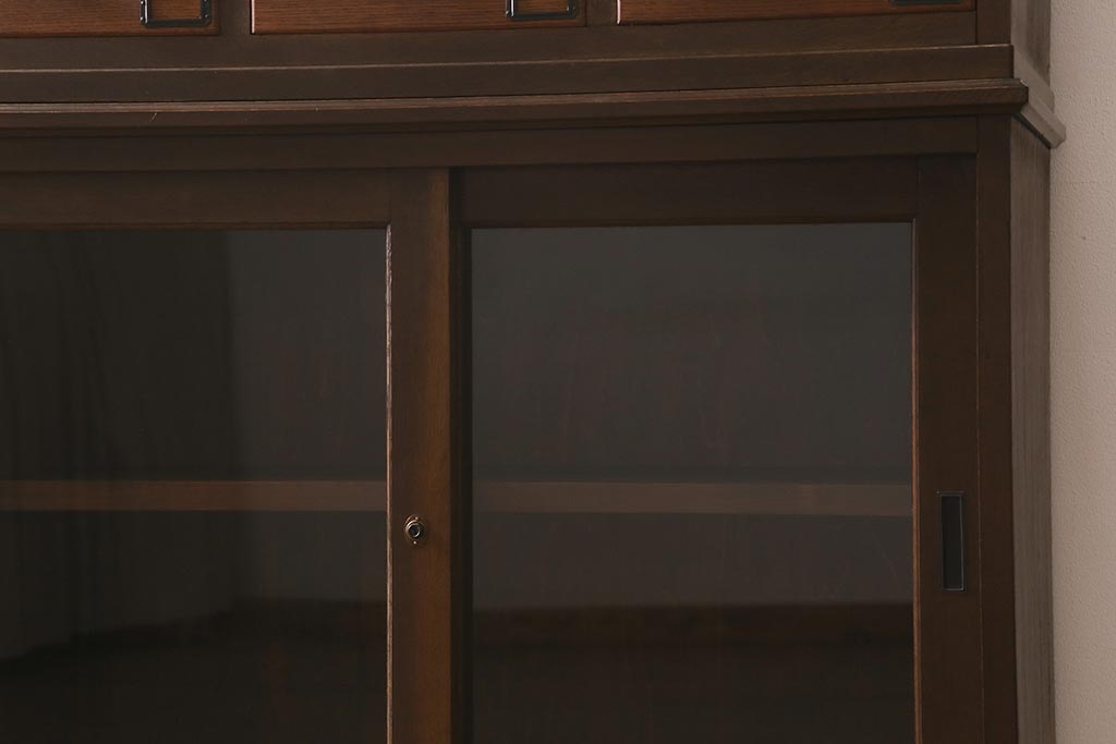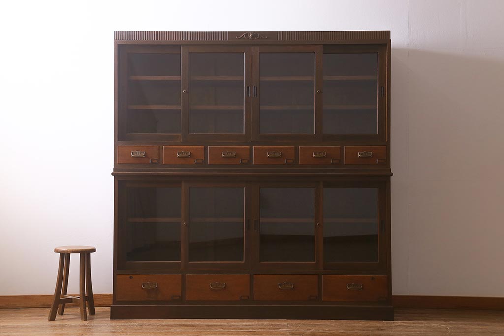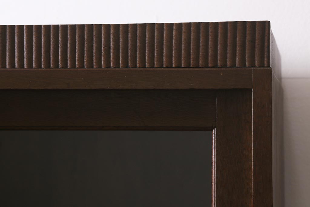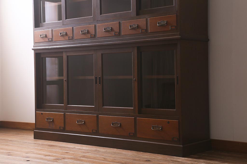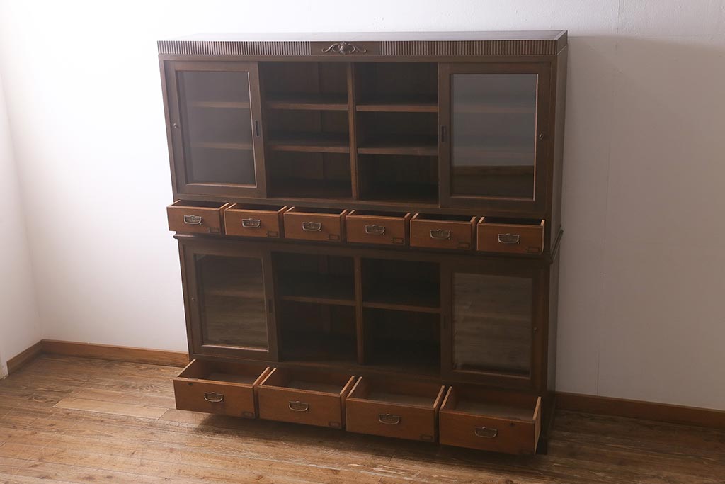 アンティーク家具 上手物! ナラ材 大正ロマン 四枚引き戸 おしゃれな意匠が目を引く重ねガラス戸棚(収納棚、飾り棚、キャビネット)(R-043056)です。