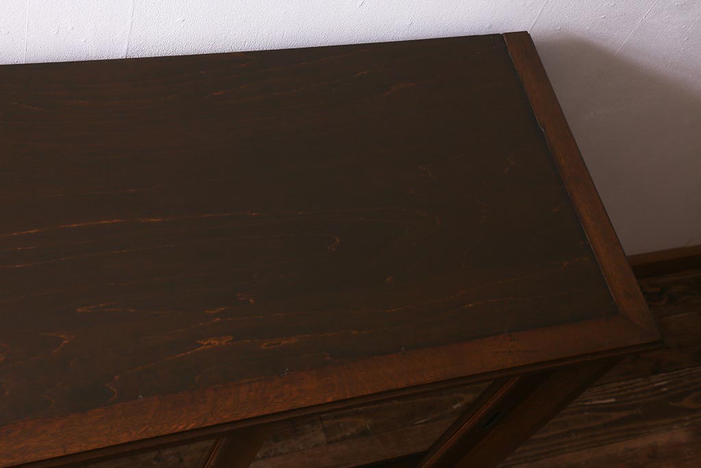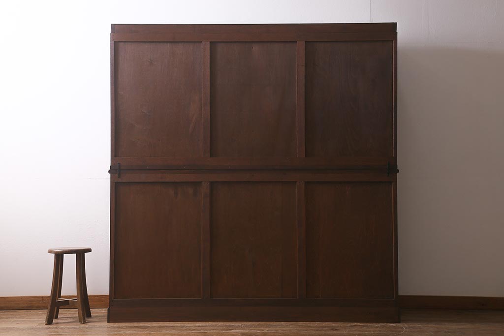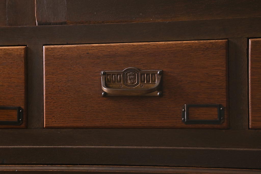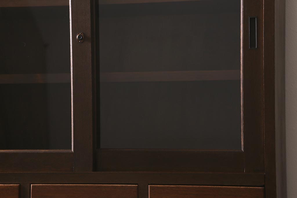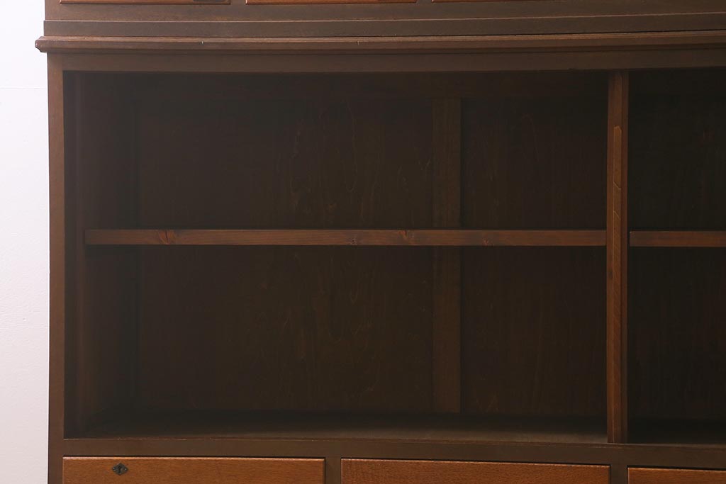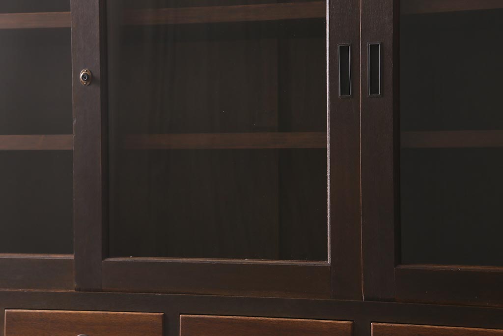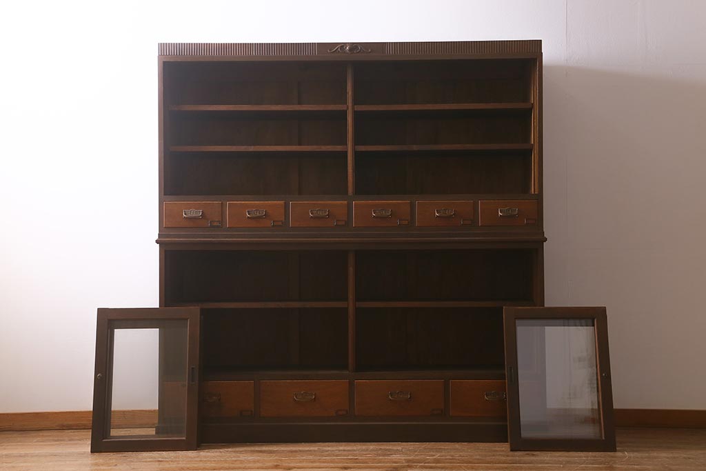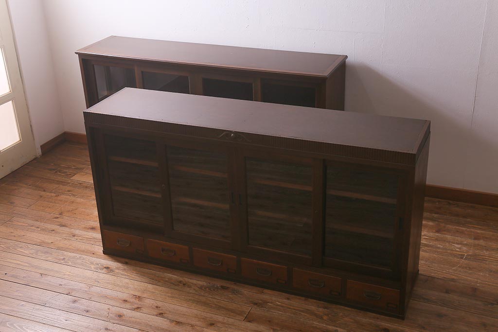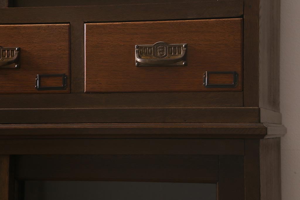 アンティーク家具 上手物! ナラ材 大正ロマン 四枚引き戸 おしゃれな意匠が目を引く重ねガラス戸棚(収納棚、飾り棚、キャビネット)(R-043056)です。