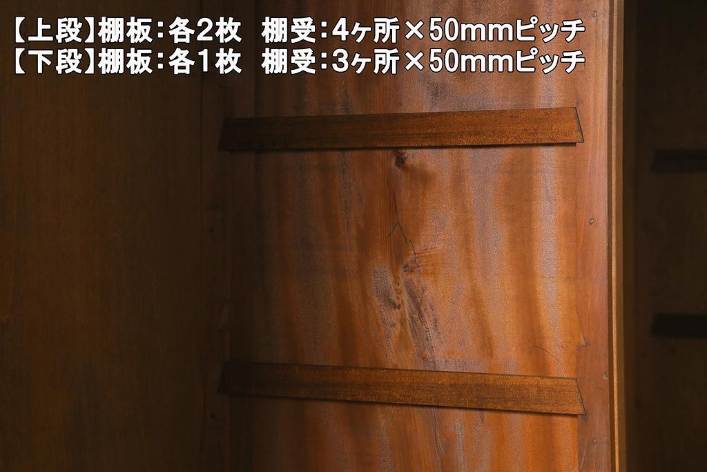 棚板は取り外しできます。棚板は上:各2枚、下:各1枚あります。棚受けは上:4ヶ所、下:3ヶ所、50mmピッチで調整できます。棚幅サイズのものが1枚の作りです。