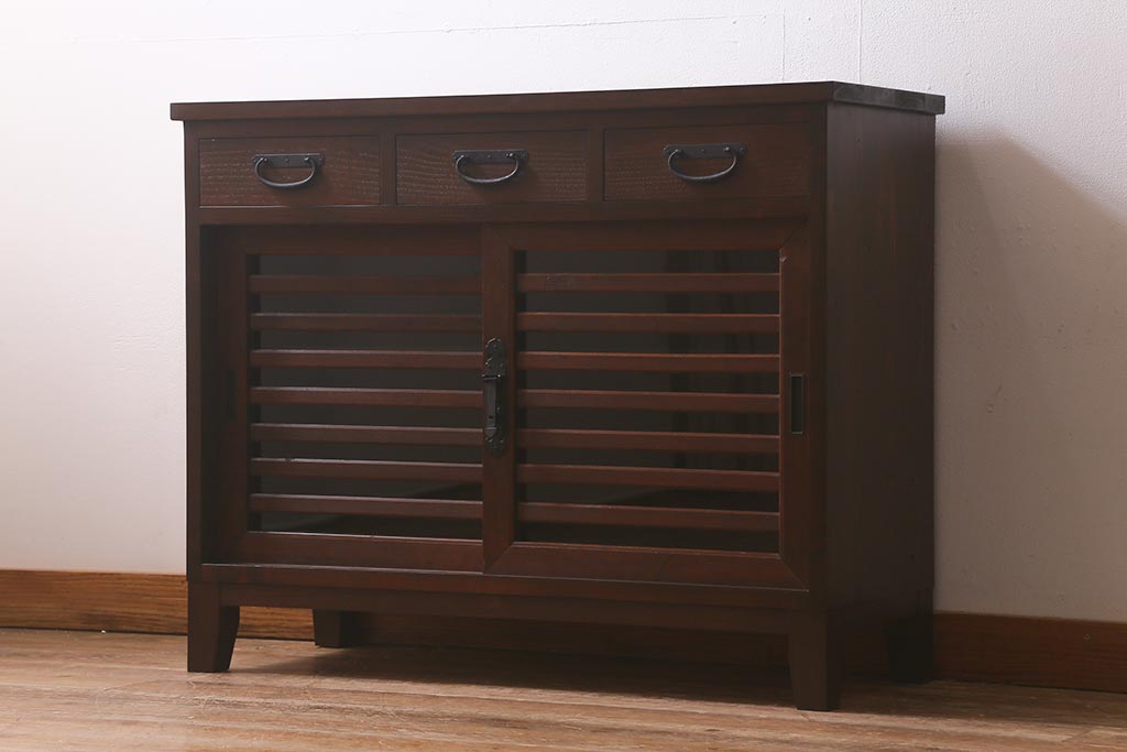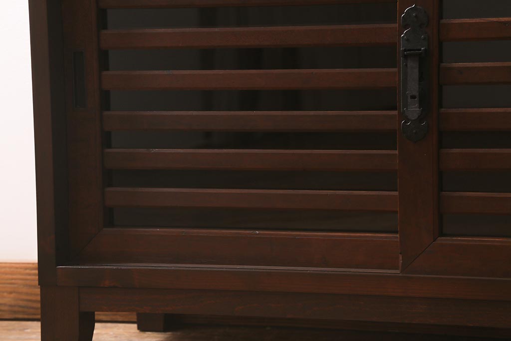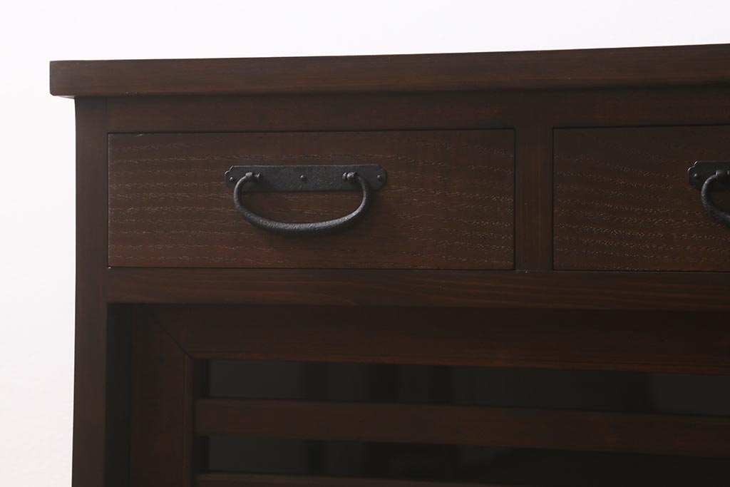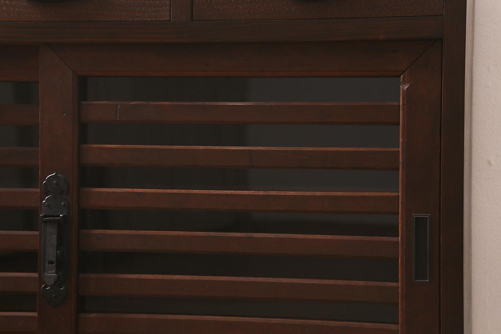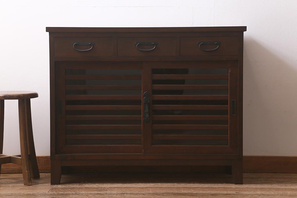 ラフジュ工房> キャビネット・戸棚> サイドボード > ラフジュ工房オリジナル 古建具リメイク 脚付き 上品な和の風情感じる引き出し付きローボード(戸棚、収納棚、テレビボード)(R-043220)