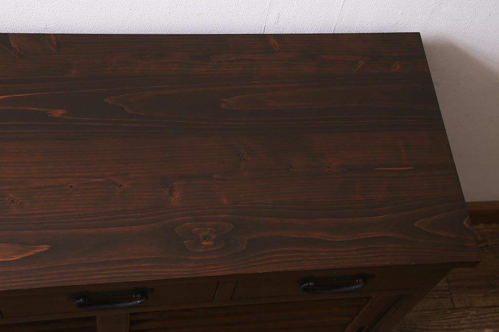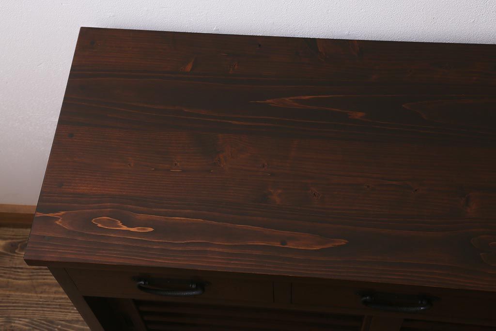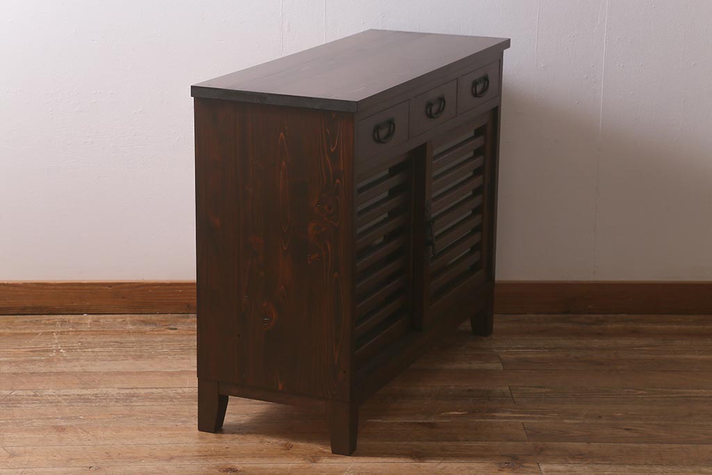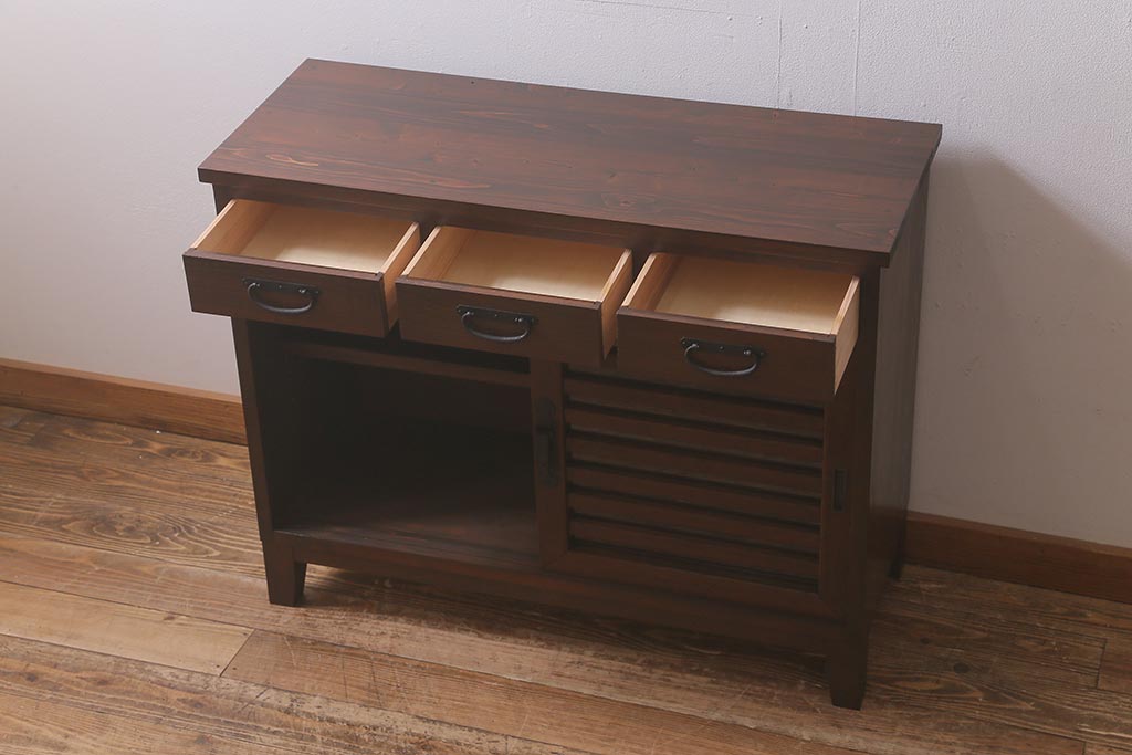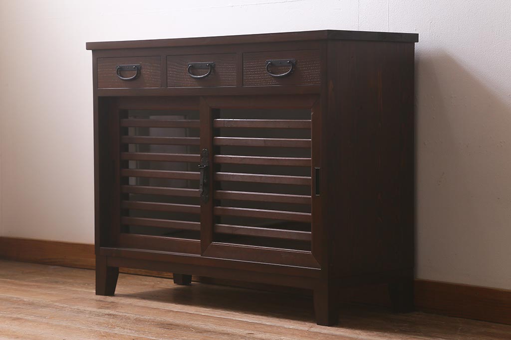 ラフジュ工房> キャビネット・戸棚> サイドボード > ラフジュ工房オリジナル 古建具リメイク 脚付き 上品な和の風情感じる引き出し付きローボード(戸棚、収納棚、テレビボード)(R-043220)