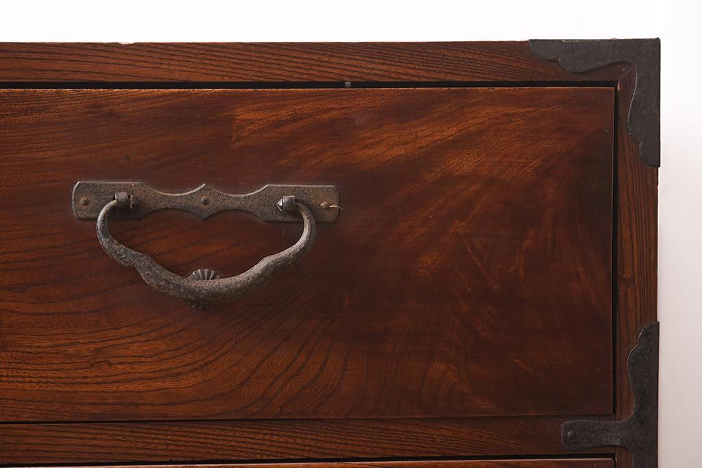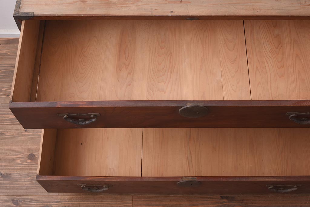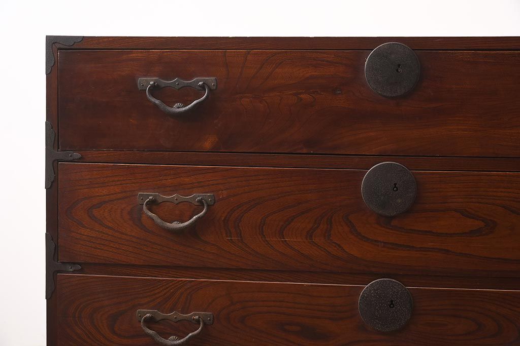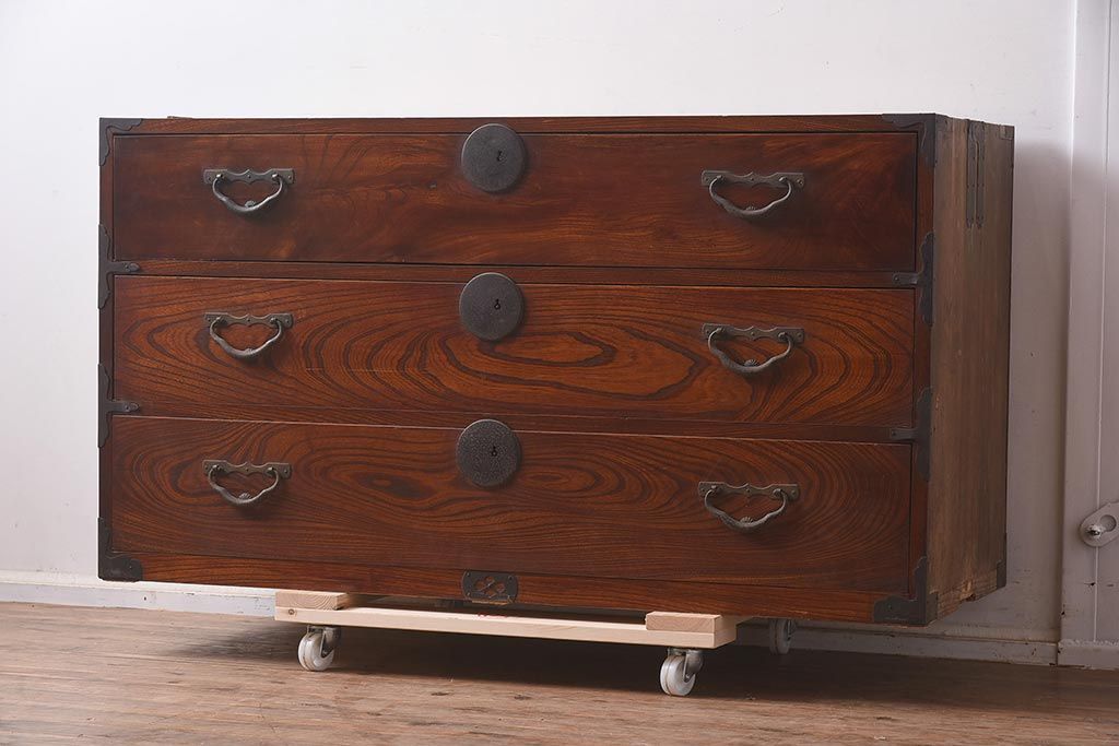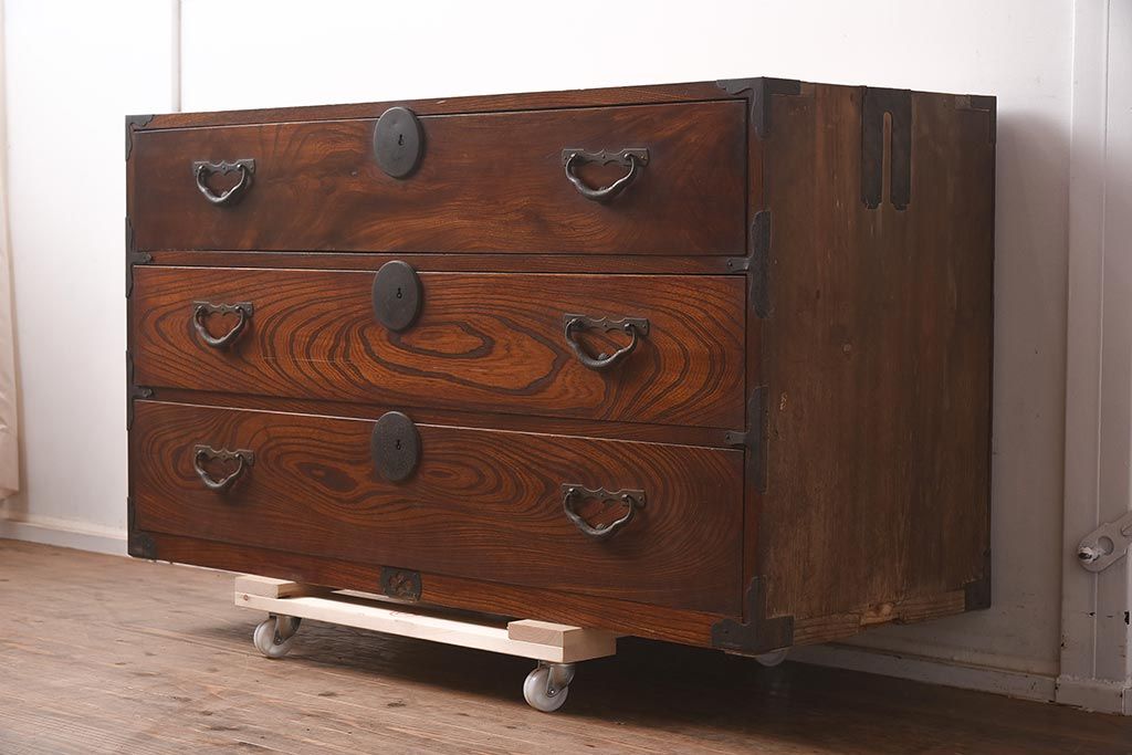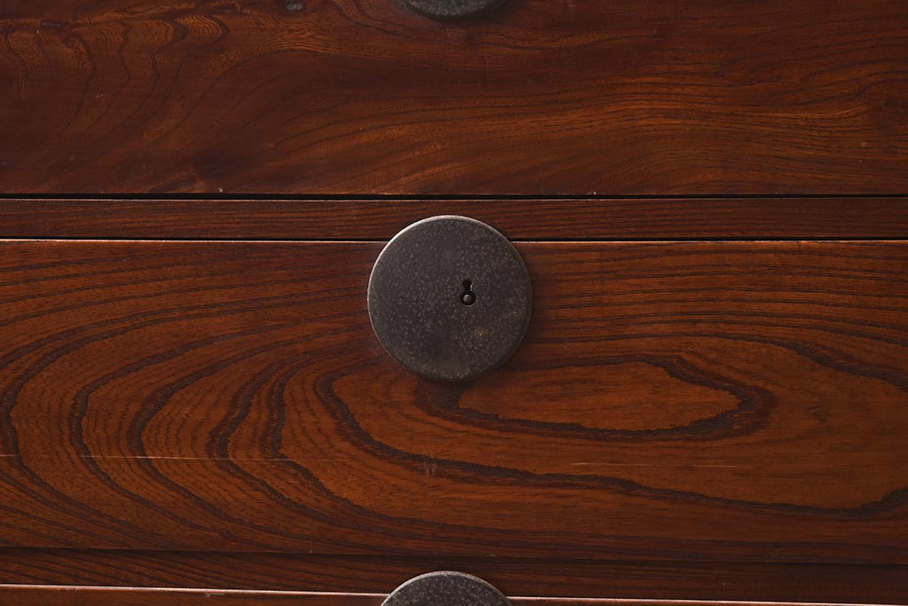 和箪笥> 衣装箪笥 > アンティーク家具 前面ケヤキ材 引き出し3杯 漆塗り 木瓜引き手 レトロや和モダンスタイルにおすすめな衣装箪笥(ローチェスト、ローボード)(R-042934)