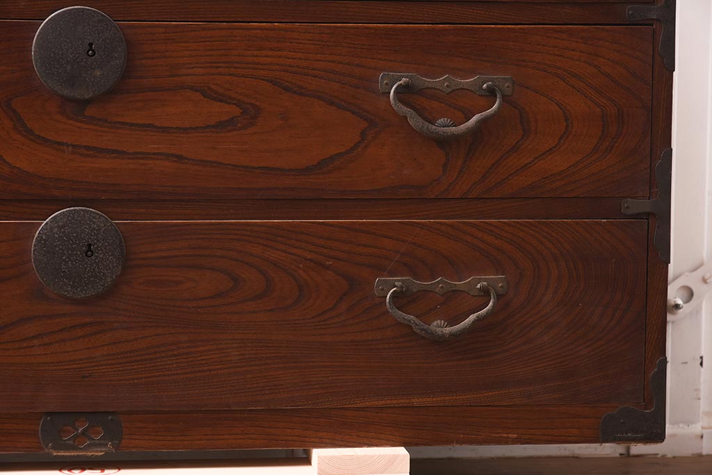 キャビネット・戸棚> テレビ台・ローボード > アンティーク家具 前面ケヤキ材 引き出し3杯 漆塗り 木瓜引き手 レトロや和モダンスタイルにおすすめな衣装箪笥(ローチェスト、ローボード)(R-042934)