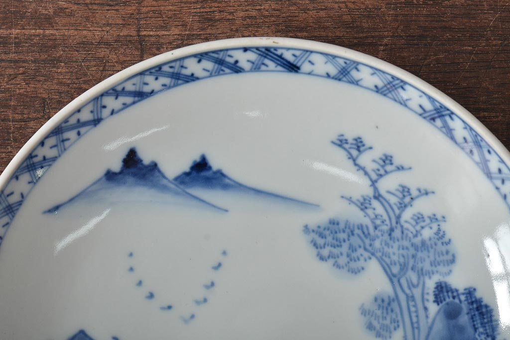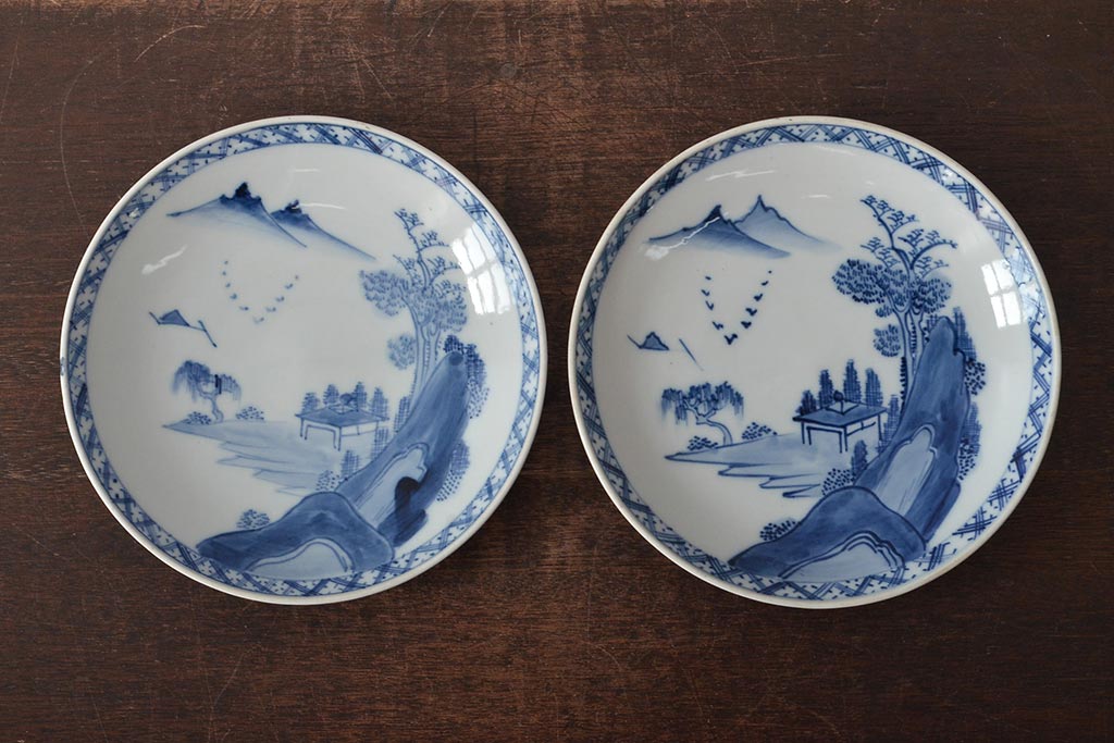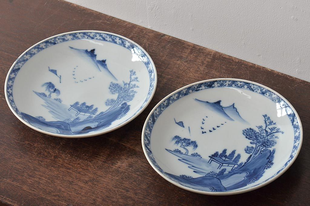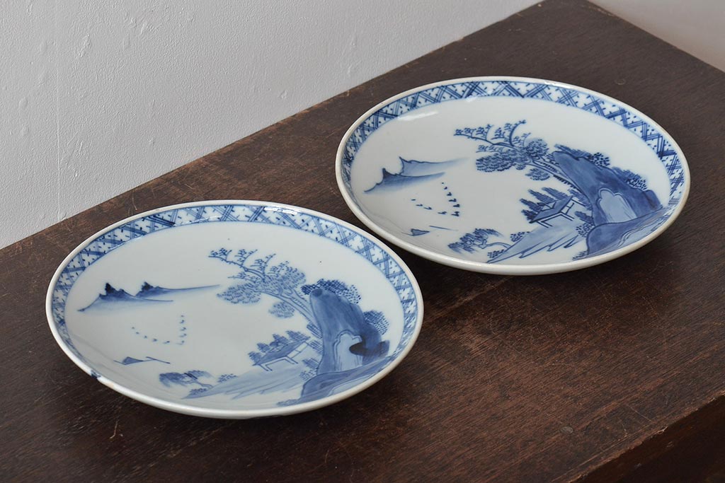 アンティーク雑貨 明治期 山水図 九谷 8寸染付皿2枚セット(和食器)(R-043223)