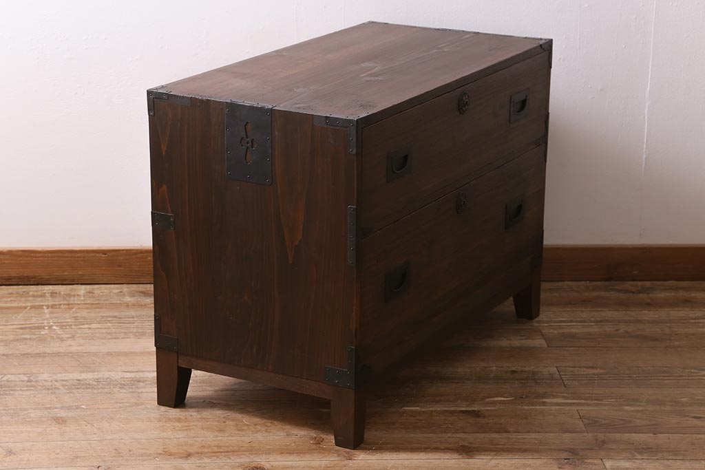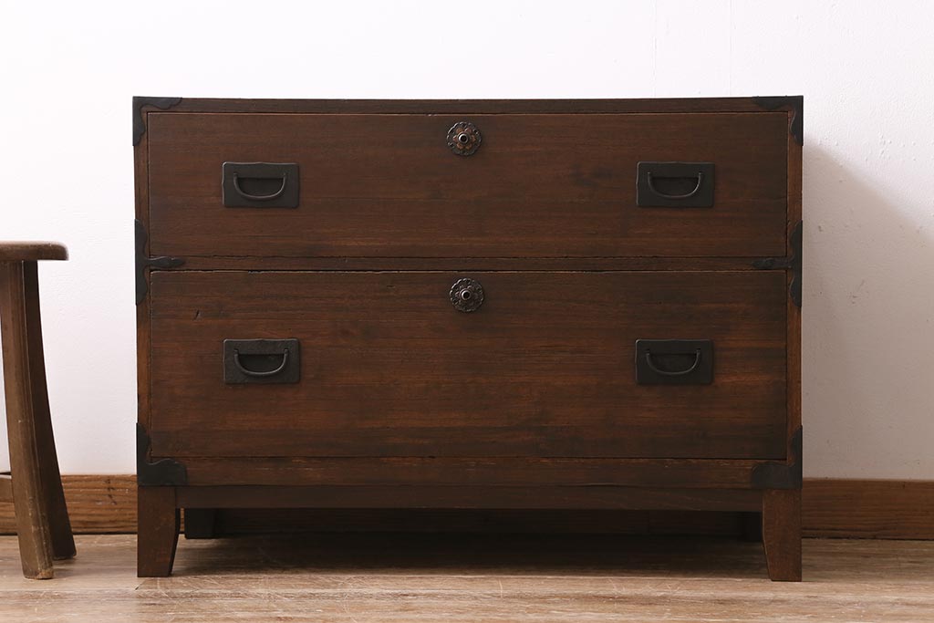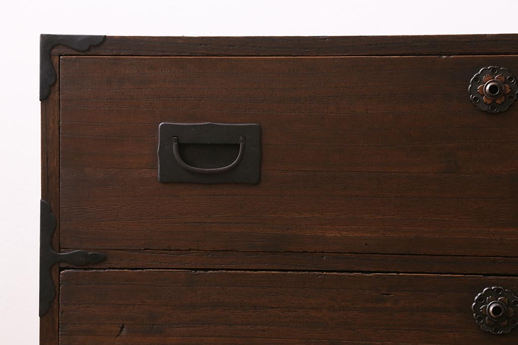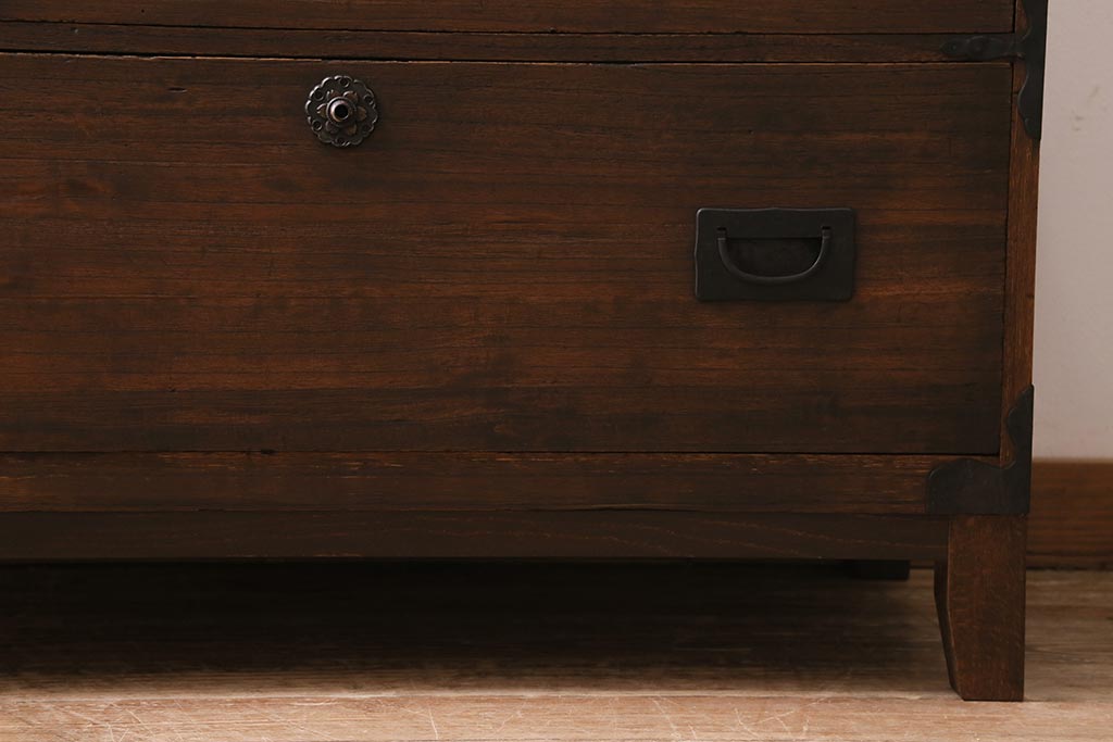 和箪笥> 衣装箪笥 > アンティーク家具 昭和初期 脚付きリメイク 前面桐材 モダンな取っ手が目を引く箪笥ローボード(テレビ台、ローチェスト、引き出し)(R-043325)