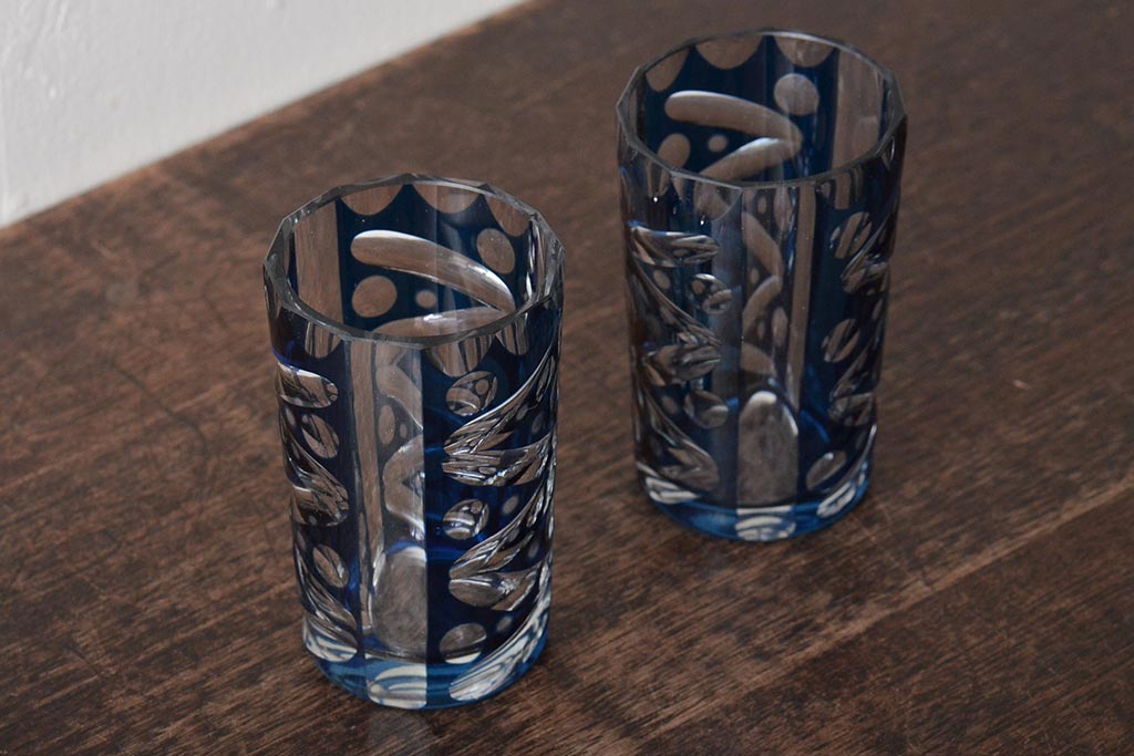 アンティーク雑貨 昭和初期 青切子グラス2個セット(コップ、色被せ、和ガラス)(R-043401)