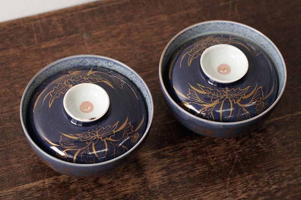 ラフジュ工房> 和食器・茶道具> お椀・茶碗 > 江戸期 古伊万里 瑠璃金彩花文蓋茶碗2客セット(和食器)(R-042744)