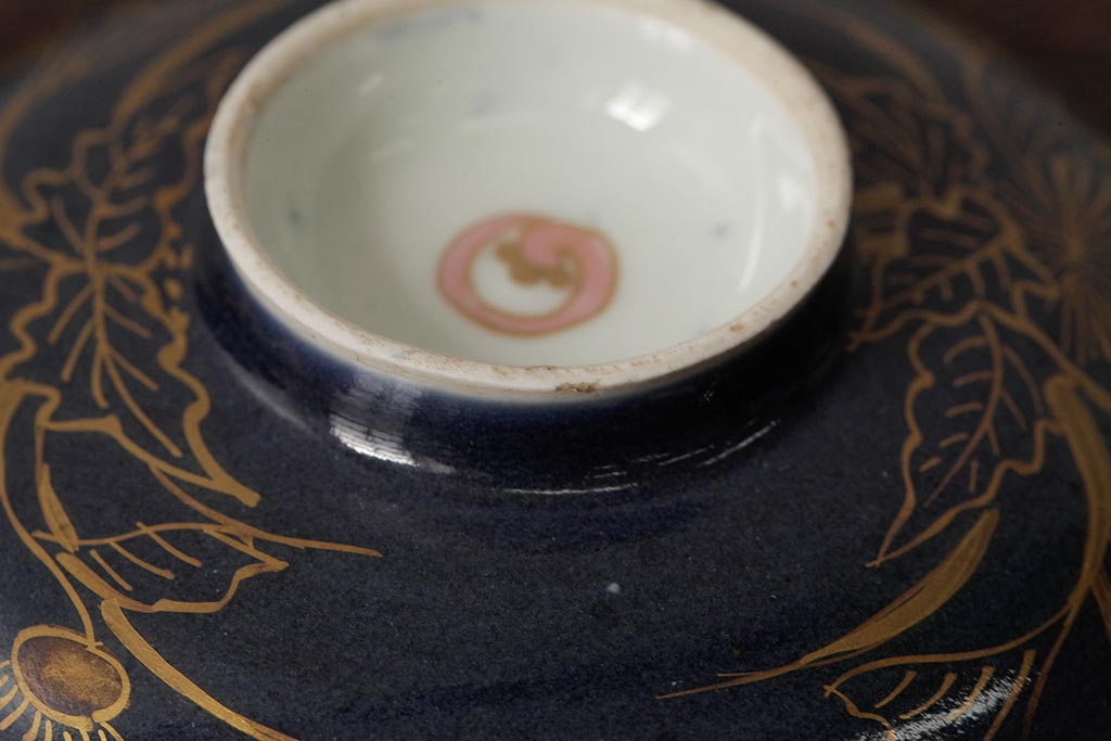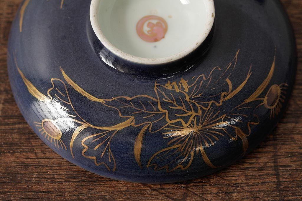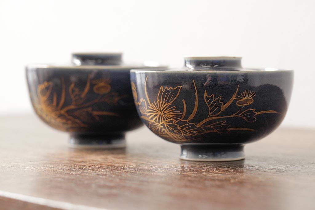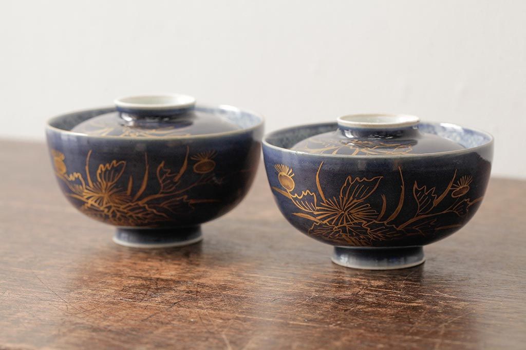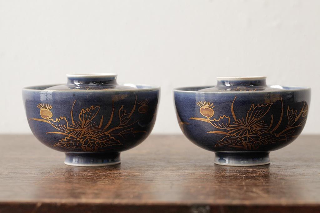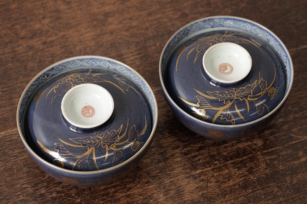 ラフジュ工房> 和食器・茶道具> お椀・茶碗 > 江戸期 古伊万里 瑠璃金彩花文蓋茶碗2客セット(和食器)(R-042746)