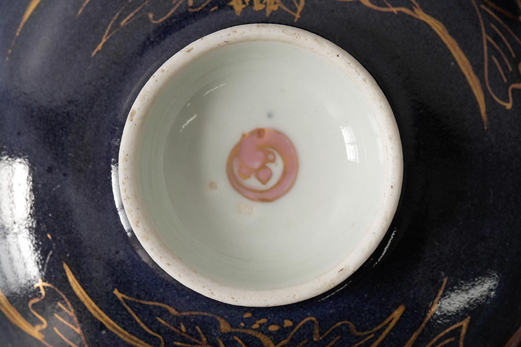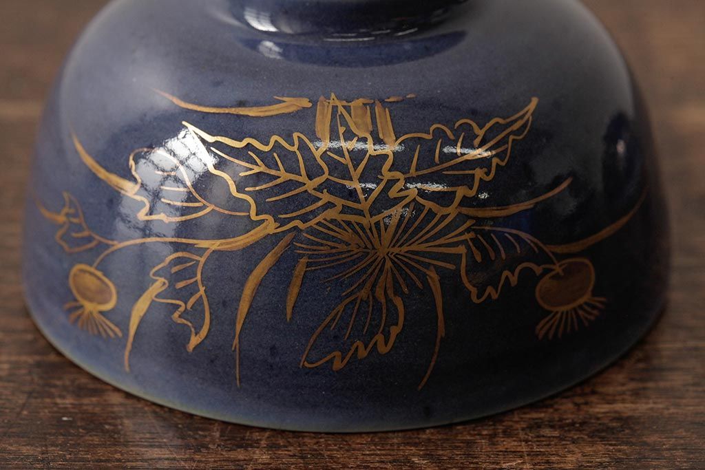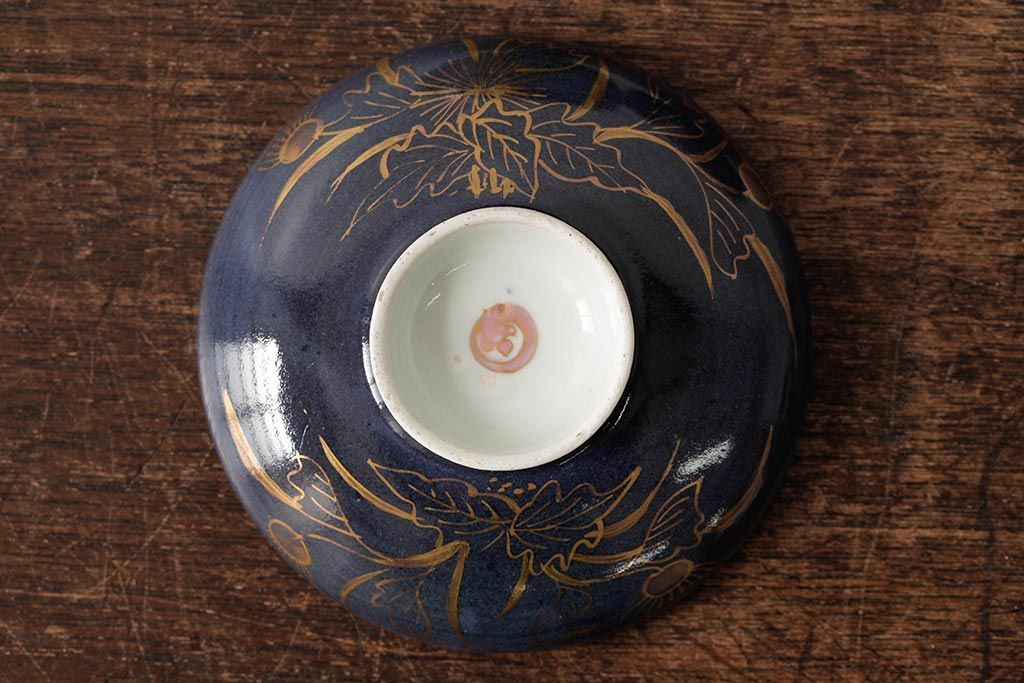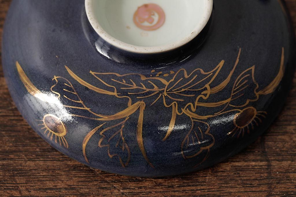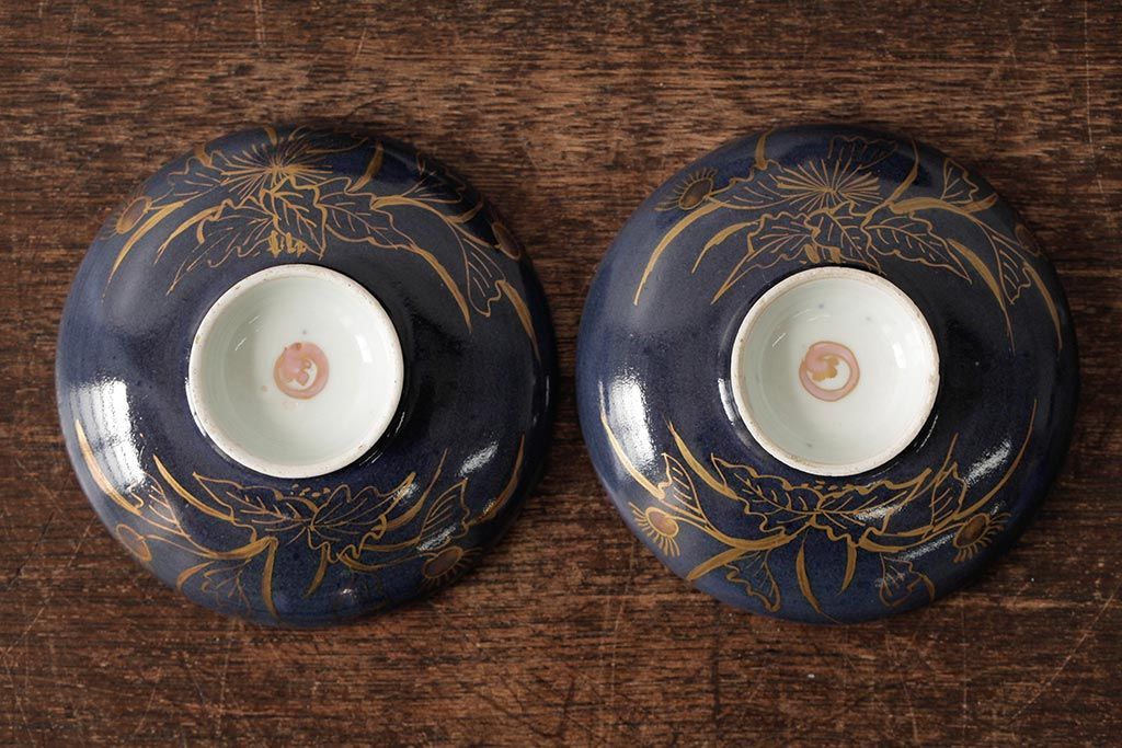 江戸期 古伊万里 瑠璃金彩花文蓋茶碗2客セット(和食器)(R-042746)