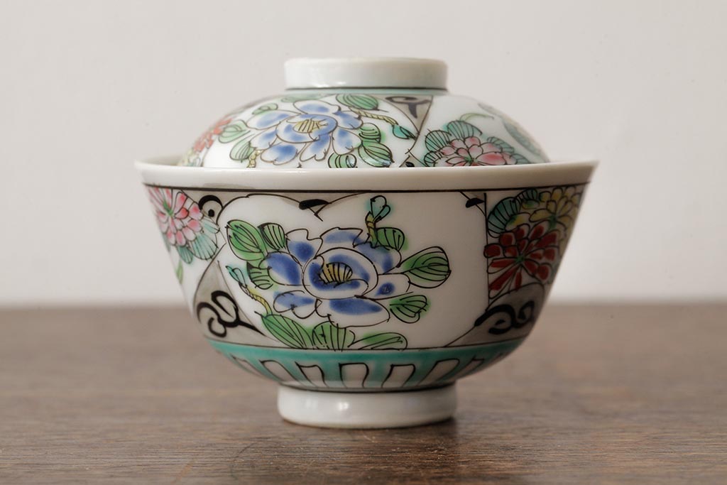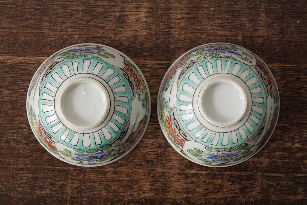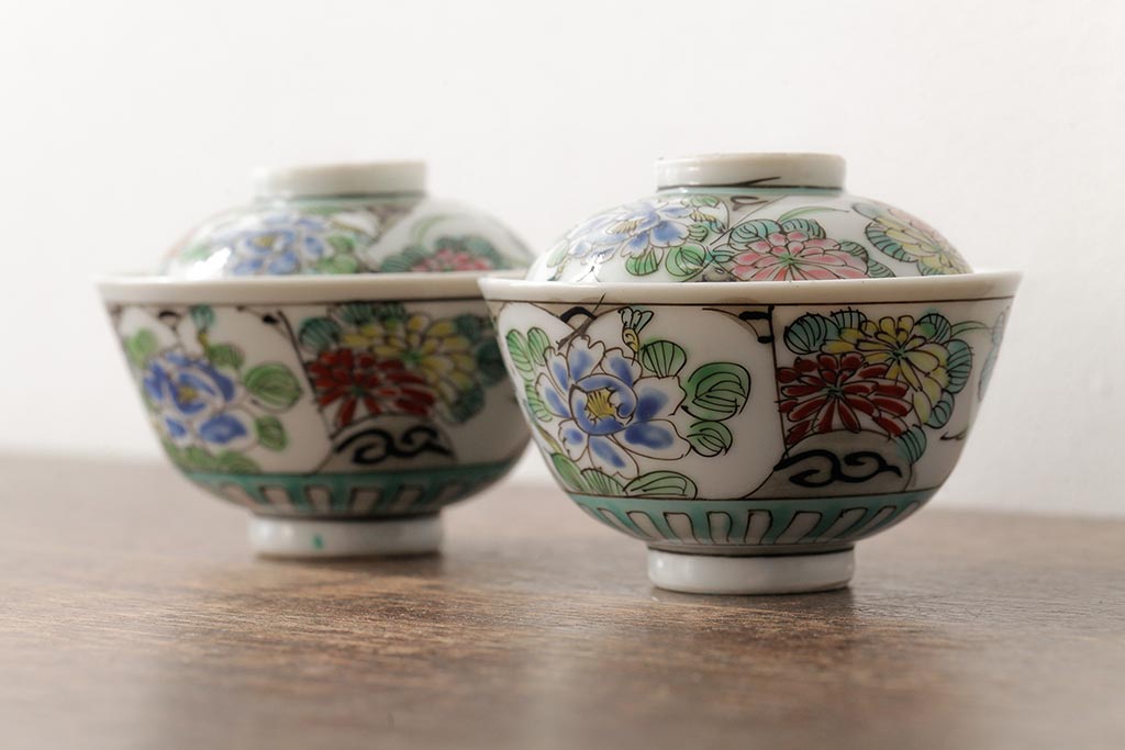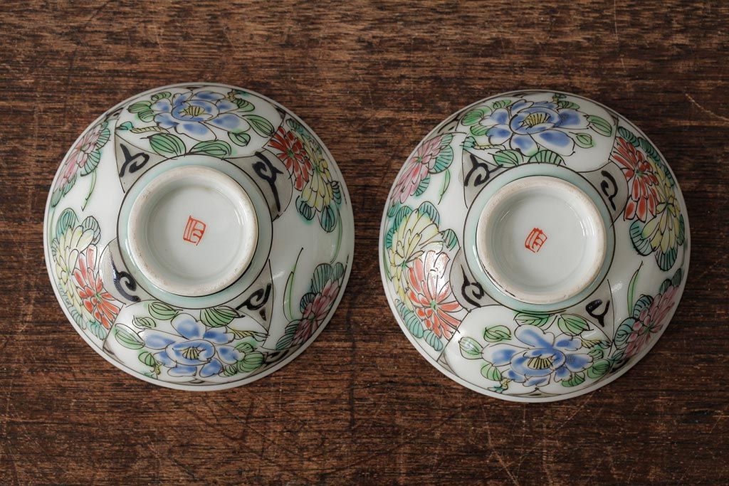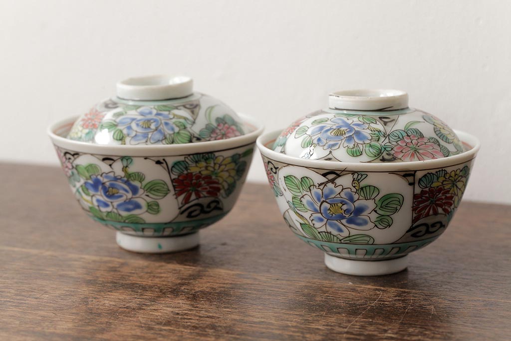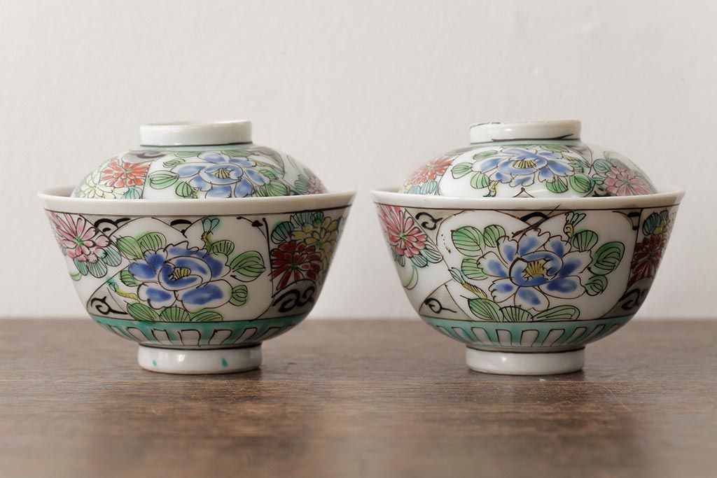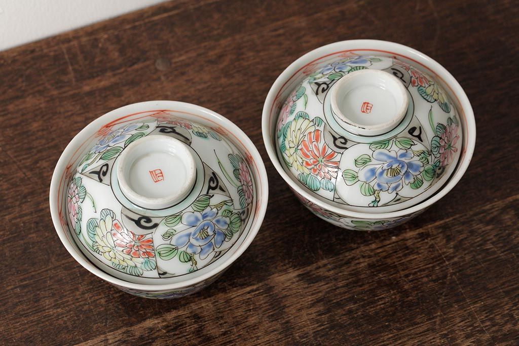 明治大正期 色絵染付蓋茶碗2客セット(和食器)(R-042810)