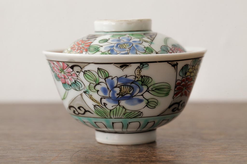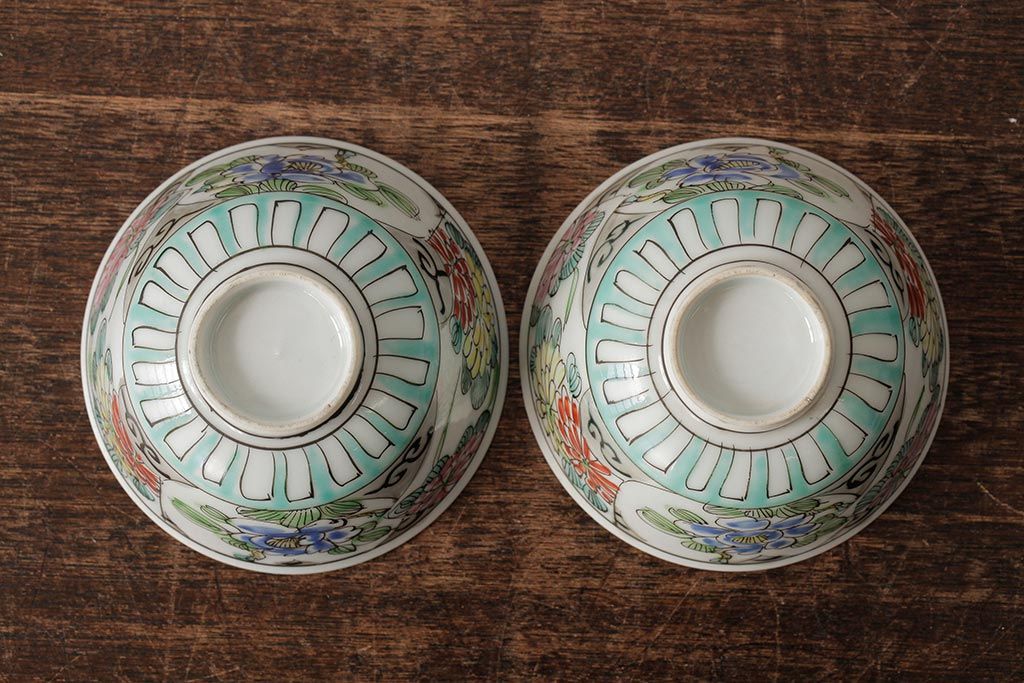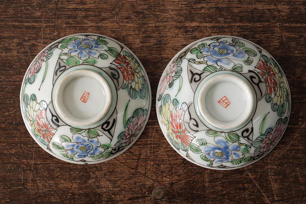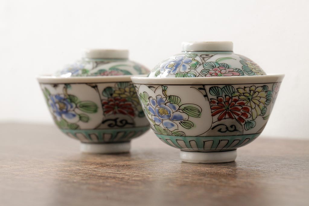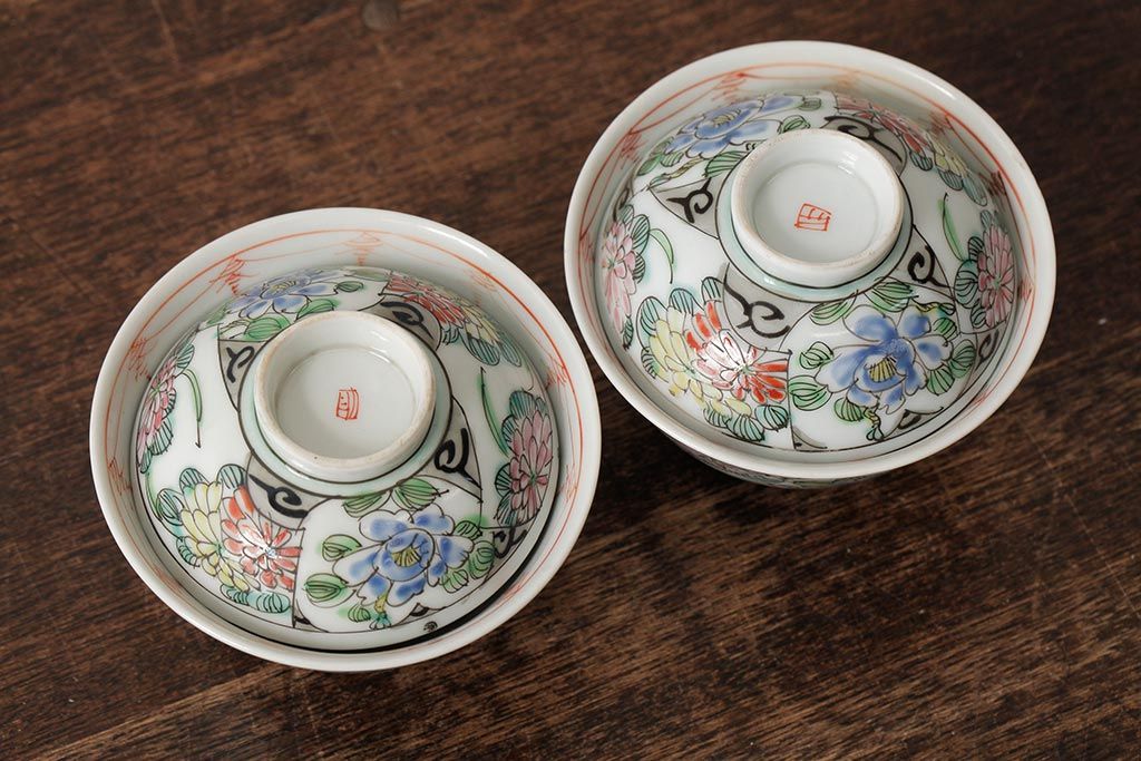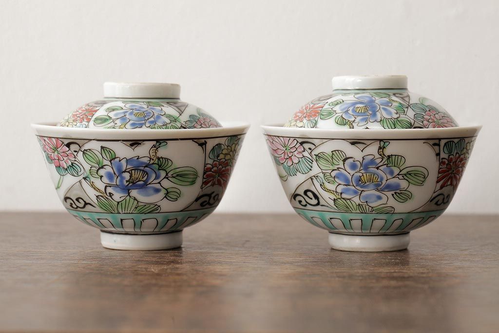 明治大正期 色絵染付蓋茶碗2客セット(和食器)(R-042811)