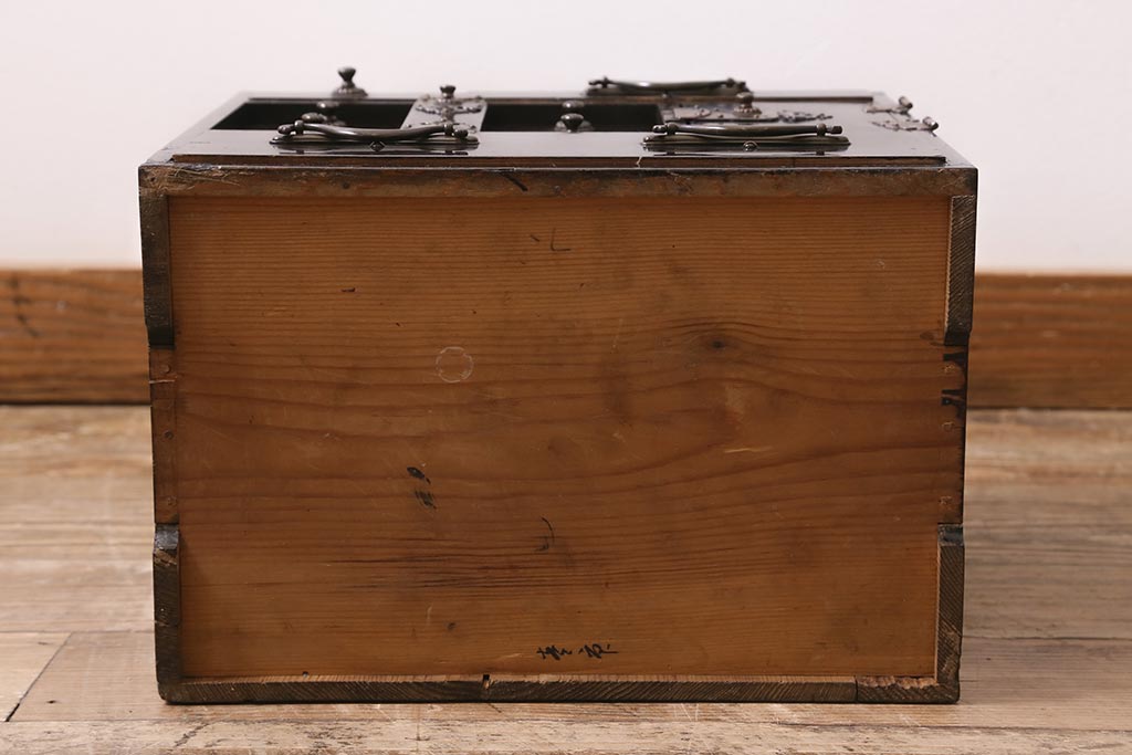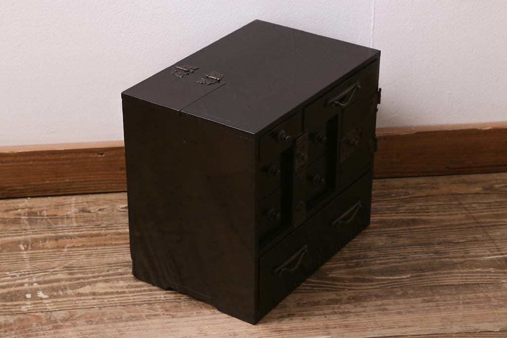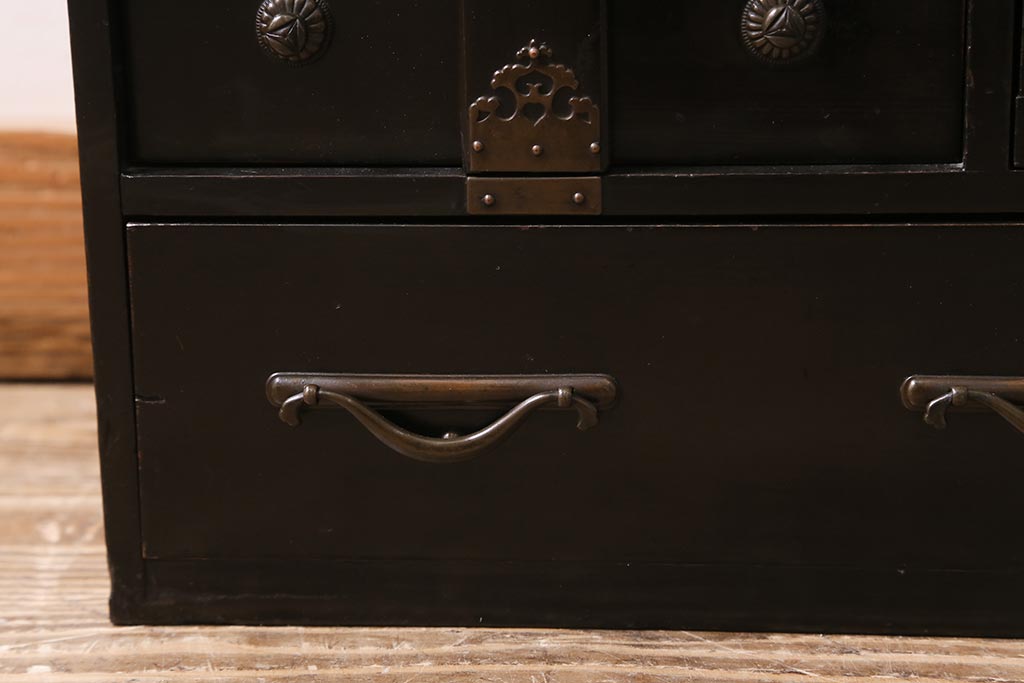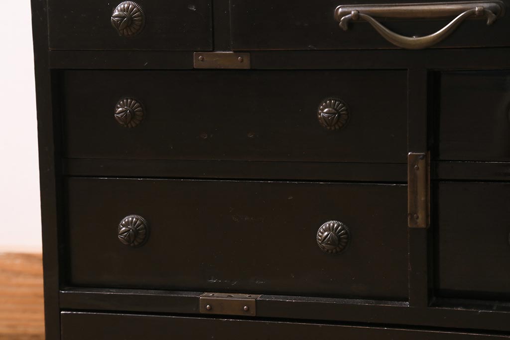 ラフジュ工房> 小物収納・トランク> 小引き出し > アンティーク家具 工芸家具 桐材 黒漆 凝った真鍮金具が高級感漂う上手物の裁縫箱(小引き出し)(R-043322)