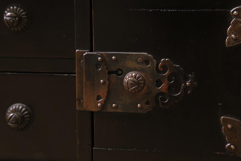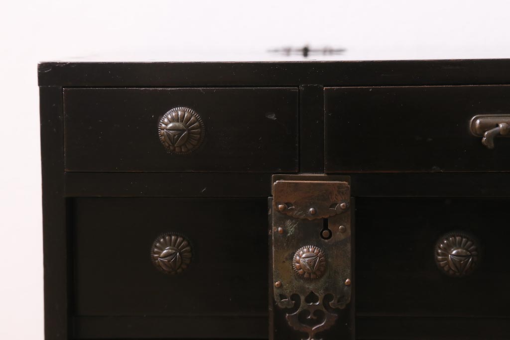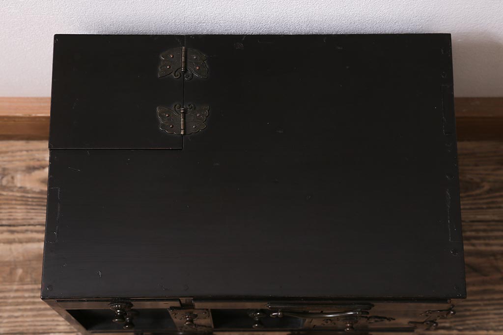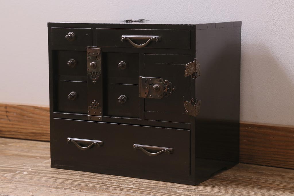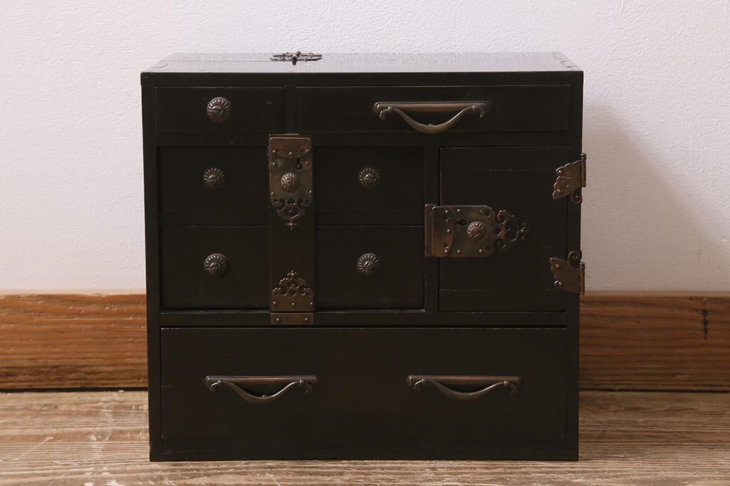 ラフジュ工房> 小物収納・トランク> 小引き出し > アンティーク家具 工芸家具 桐材 黒漆 凝った真鍮金具が高級感漂う上手物の裁縫箱(小引き出し)(R-043322)