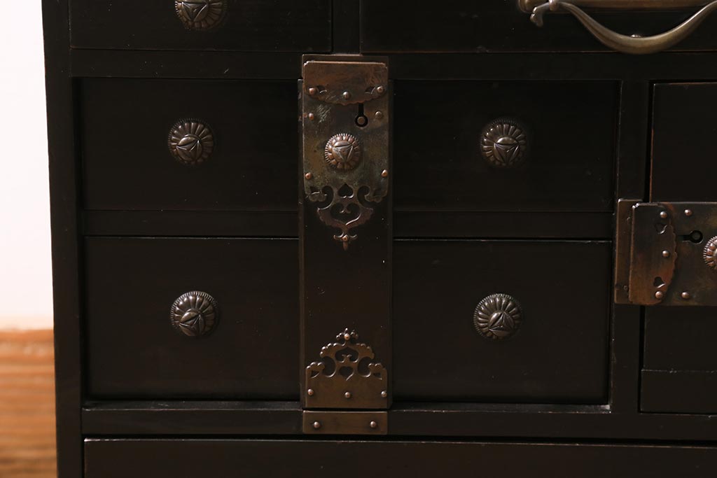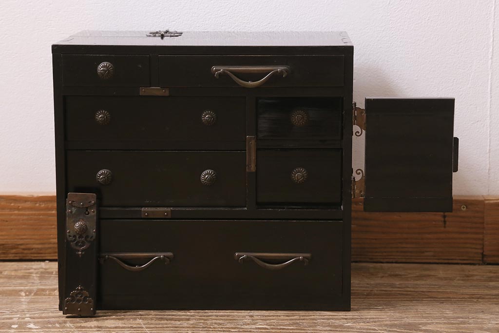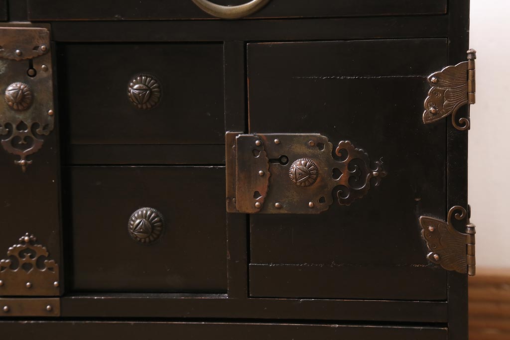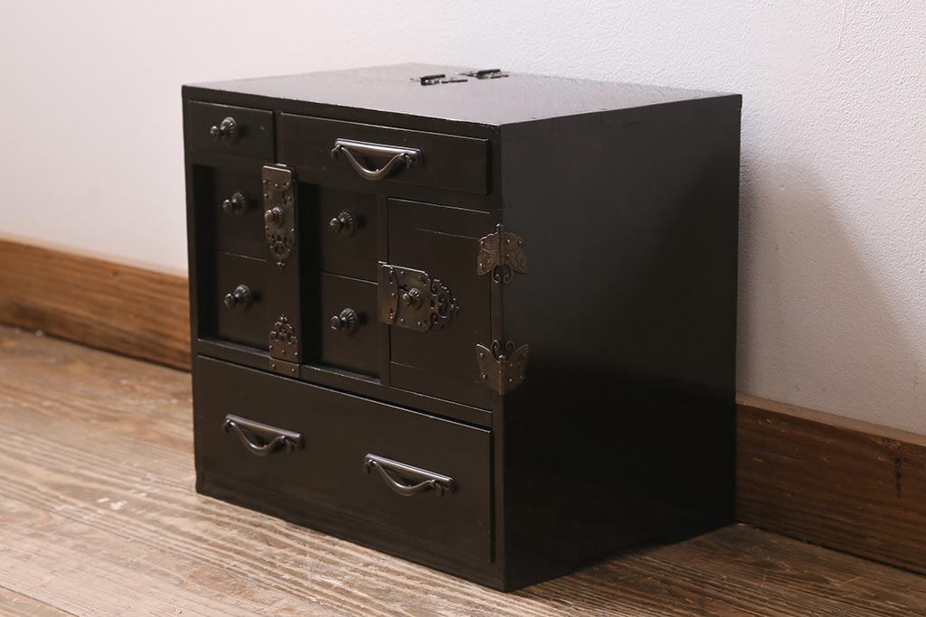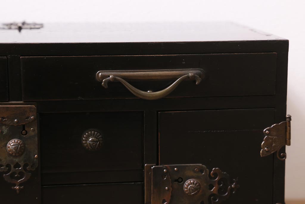 ラフジュ工房> 小物収納・トランク > アンティーク家具 工芸家具 桐材 黒漆 凝った真鍮金具が高級感漂う上手物の裁縫箱(小引き出し)(R-043322)