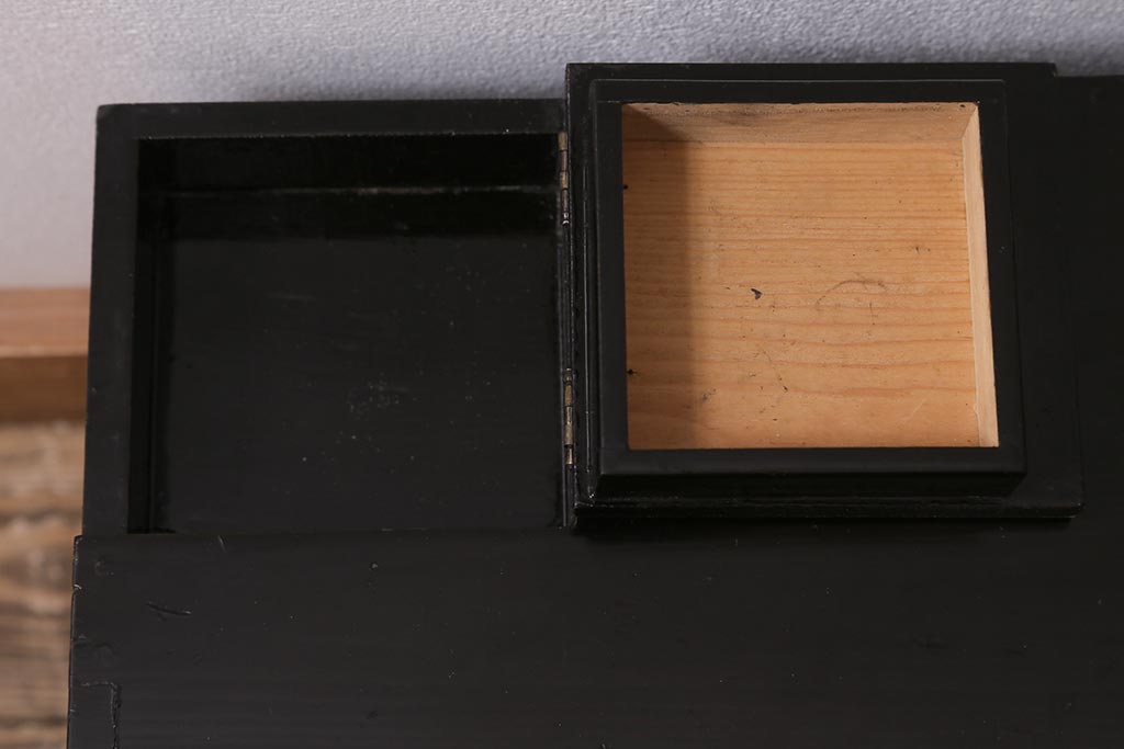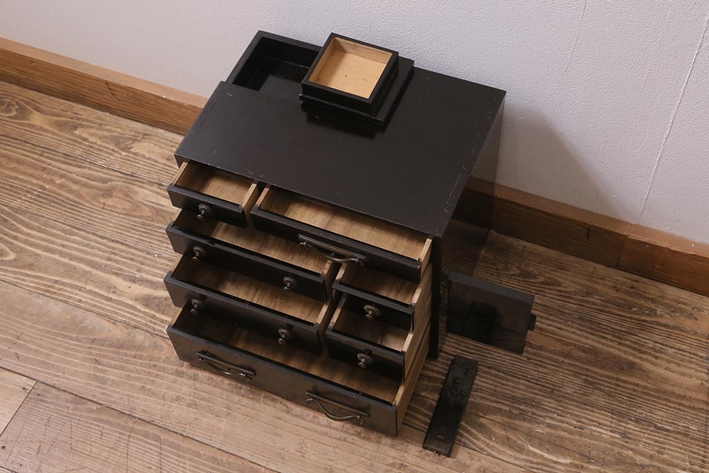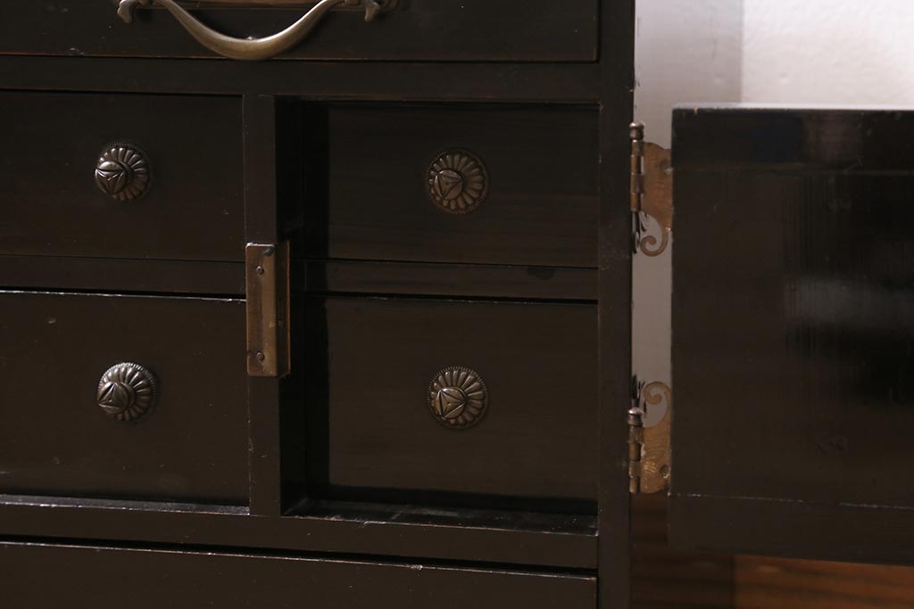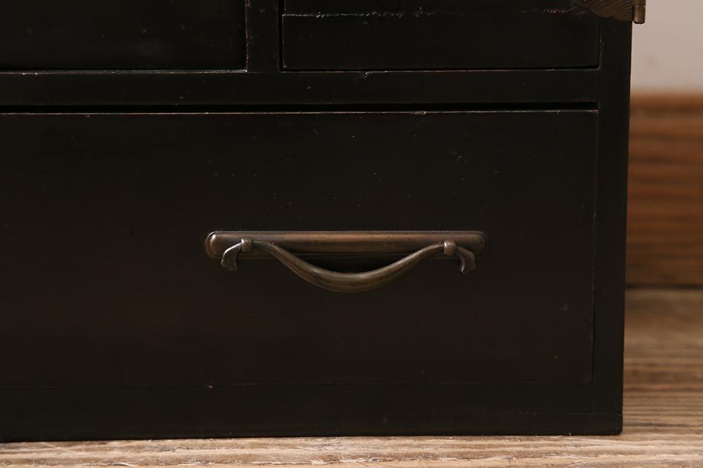 アンティーク家具 工芸家具 桐材 黒漆 凝った真鍮金具が高級感漂う上手物の裁縫箱(小引き出し)(R-043322)