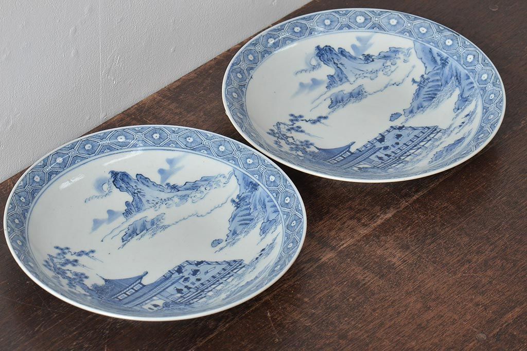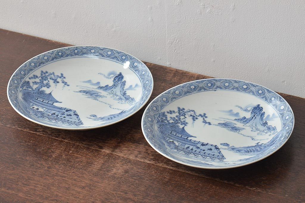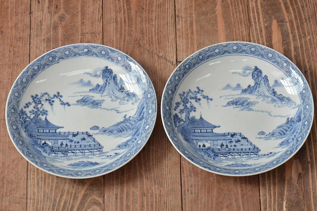アンティーク雑貨 明治期 楼閣・山水・人物図 染付 八寸皿2枚セット(中皿、伊万里)(R-043070)