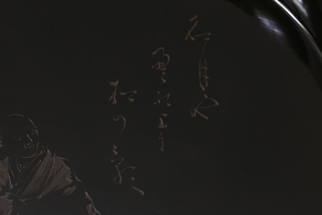 ラフジュ工房> 骨董・美術品> 骨董-漆器 > アンティーク雑貨 工芸品 大正昭和初期 俳句 名月や〜 彫刻 上手物! 漆塗り 木製お盆(漆器、トレー、丸盆)(R-043041)