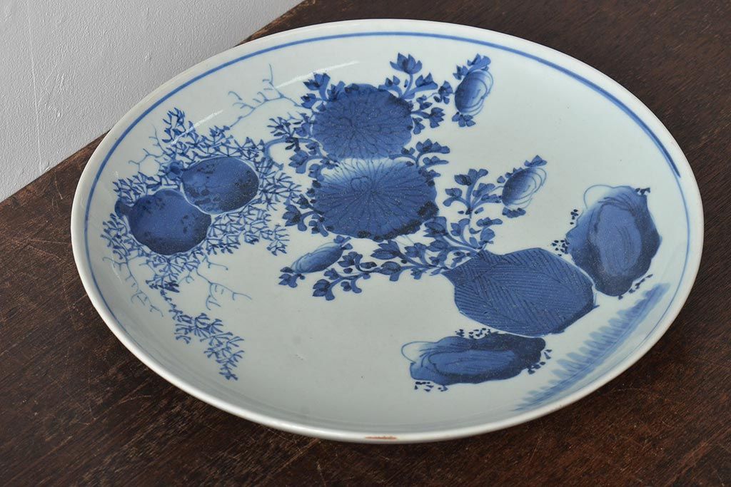 ラフジュ工房> 骨董・美術品> 骨董-陶磁器 > アンティーク雑貨 江戸期 古伊万里 花籠図 染付 尺皿(大皿)(R-043067)