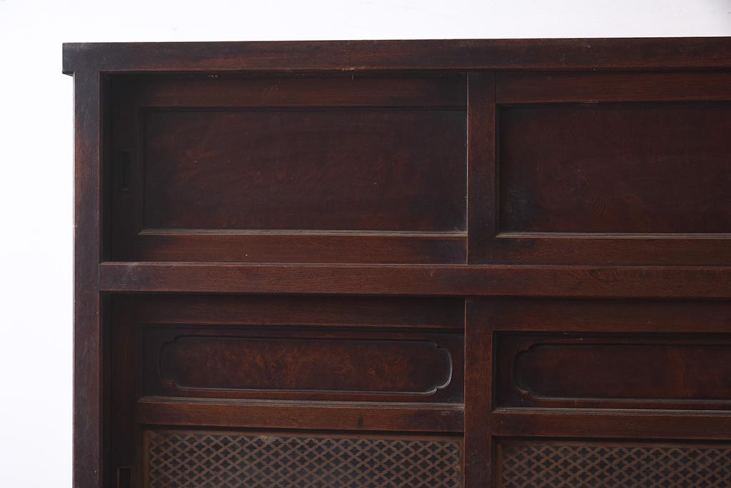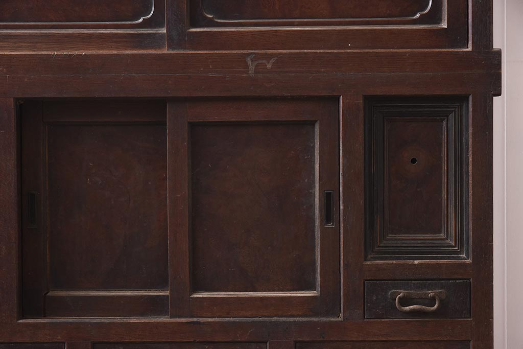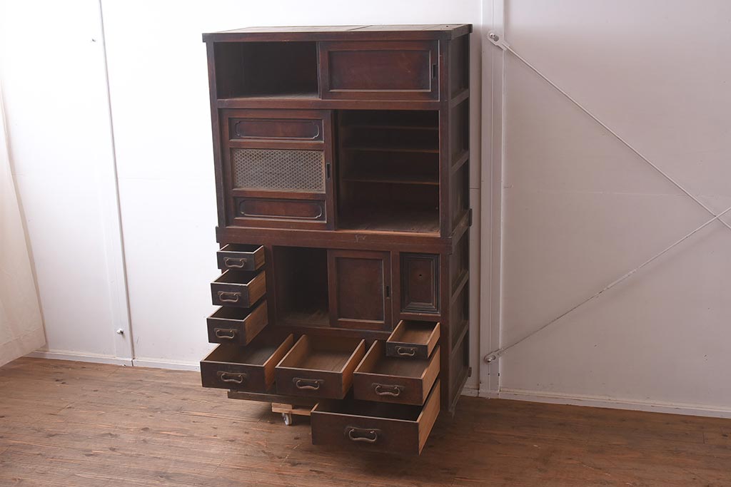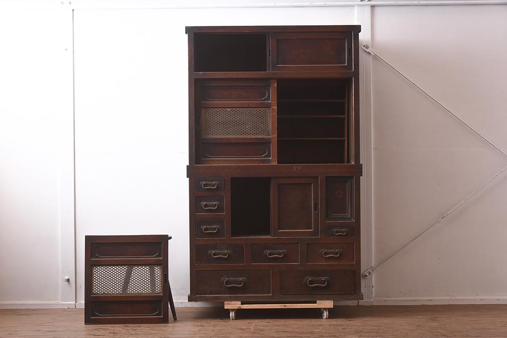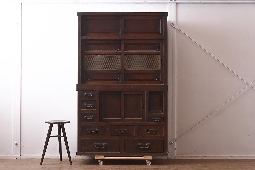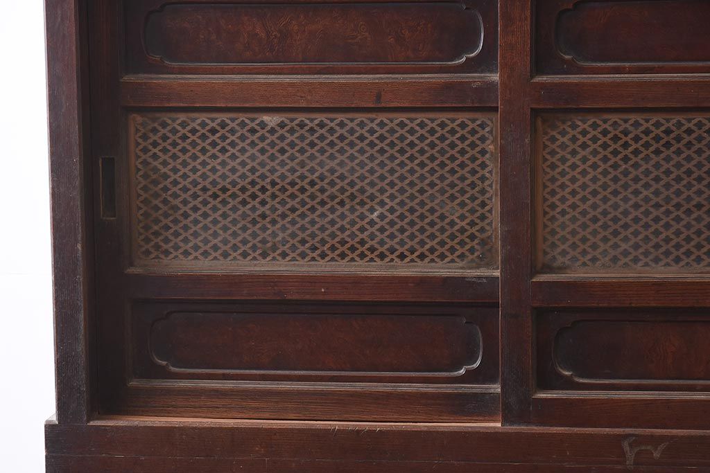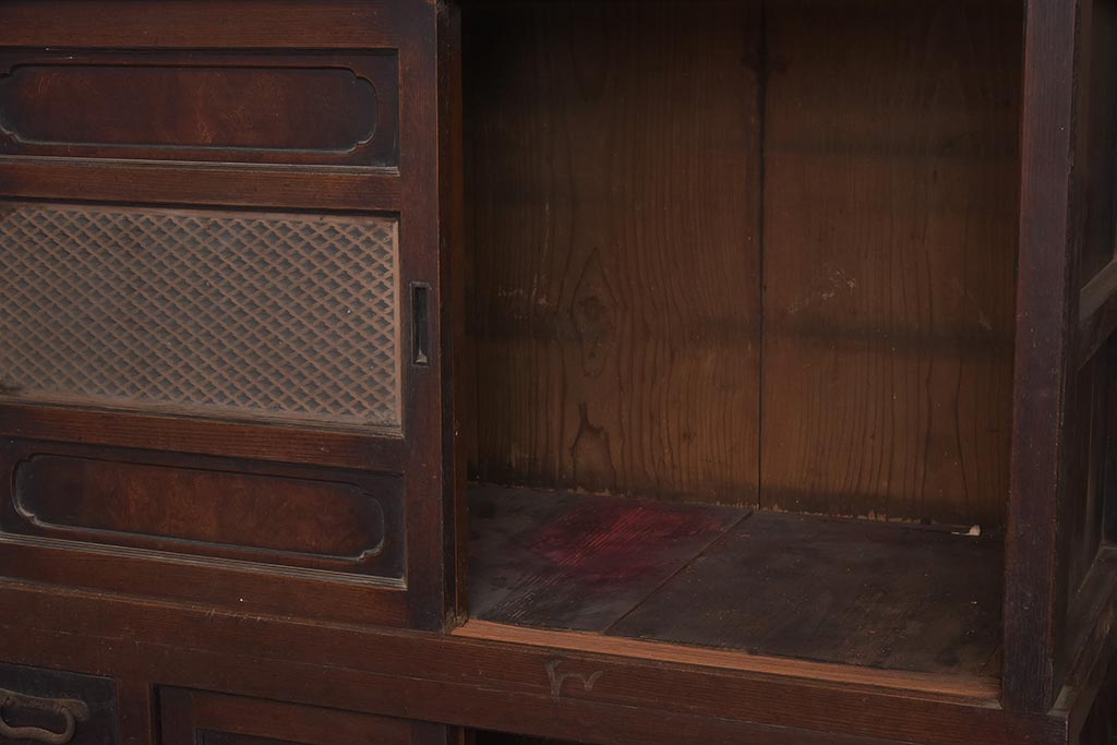 ラフジュ工房> 和箪笥 > アンティーク家具 上手物! 明治大正期 前面欅(ケヤキ)・玉杢材 3尺 組子入り引き戸の関東水屋箪笥(茶箪笥、重ね戸棚、収納棚)(R-043277)