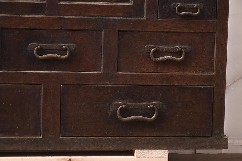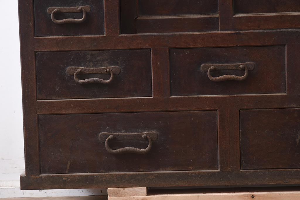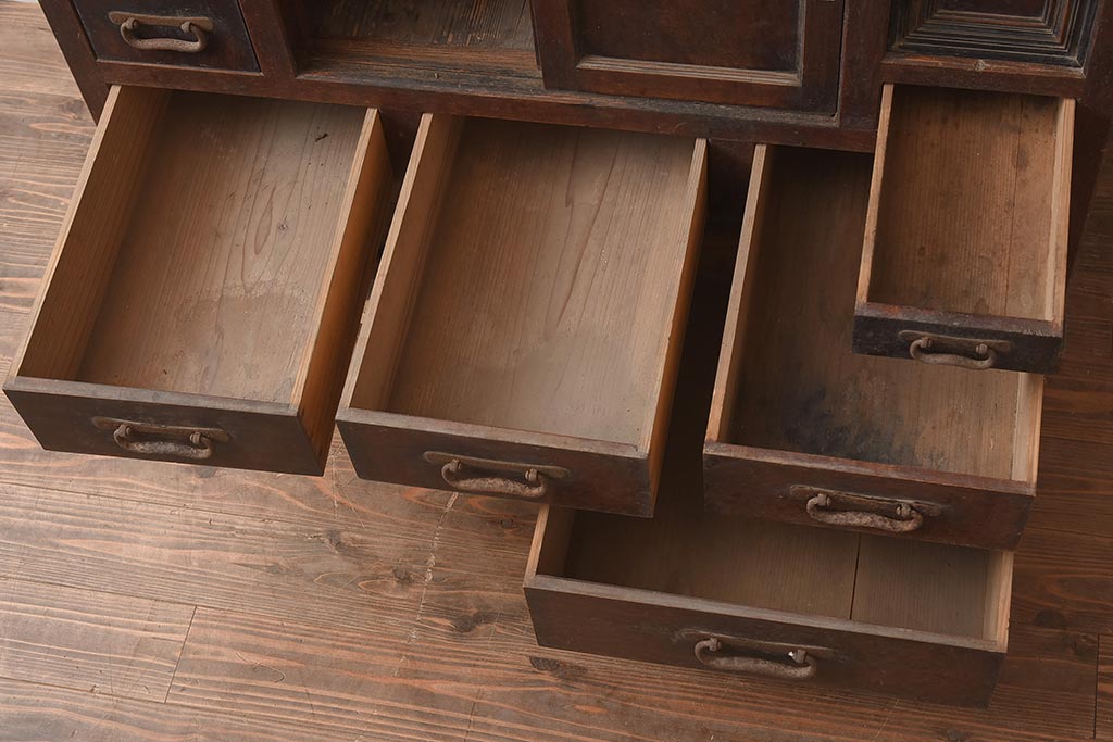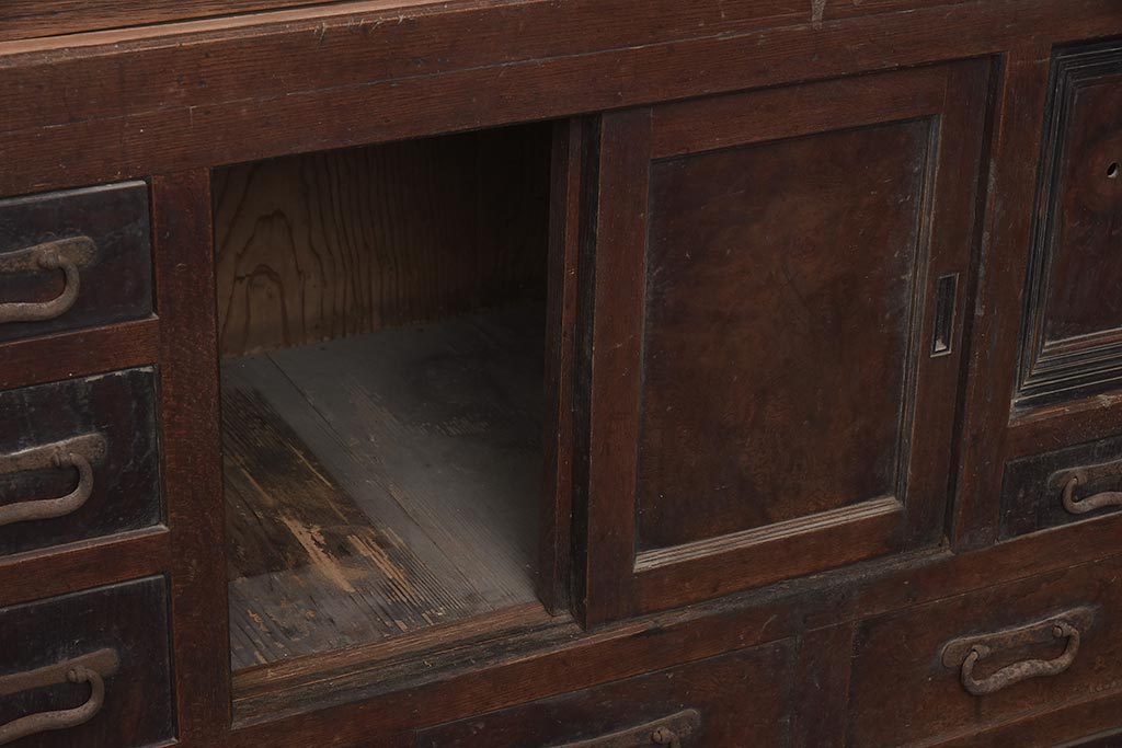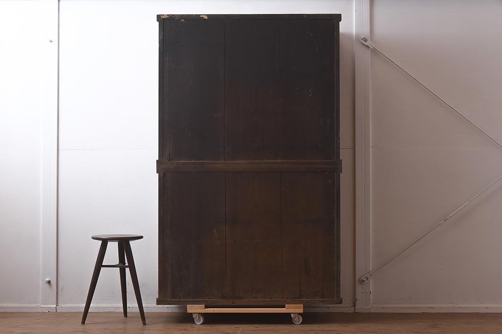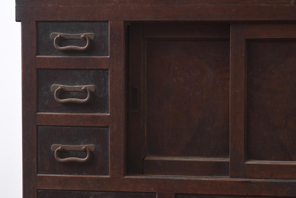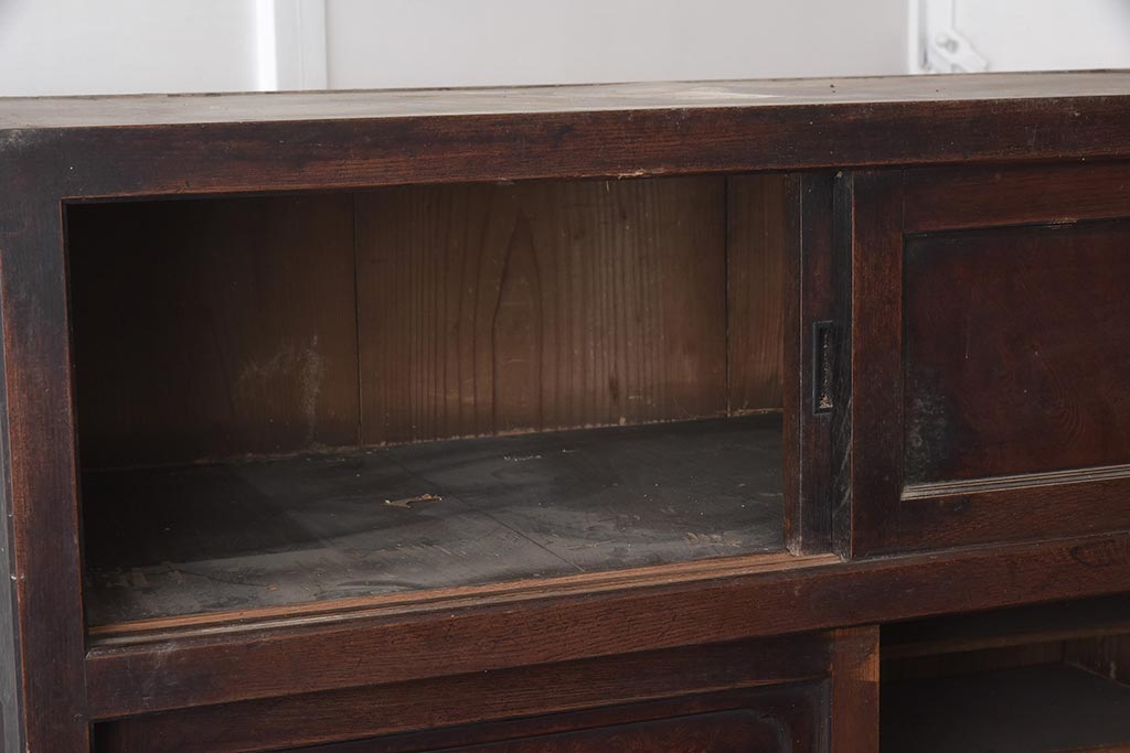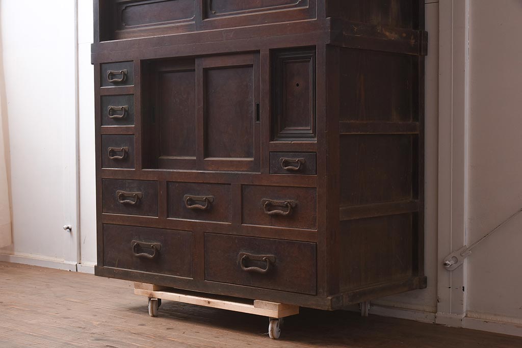 ラフジュ工房> 和箪笥 > アンティーク家具 上手物! 明治大正期 前面欅(ケヤキ)・玉杢材 3尺 組子入り引き戸の関東水屋箪笥(茶箪笥、重ね戸棚、収納棚)(R-043277)