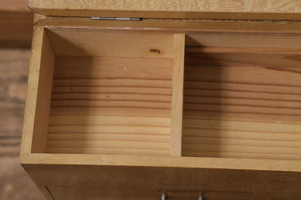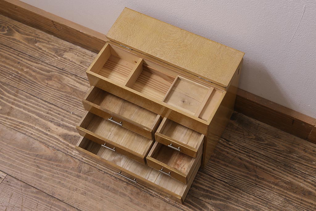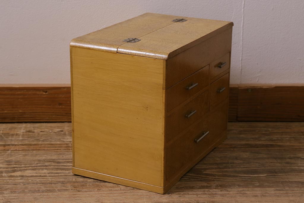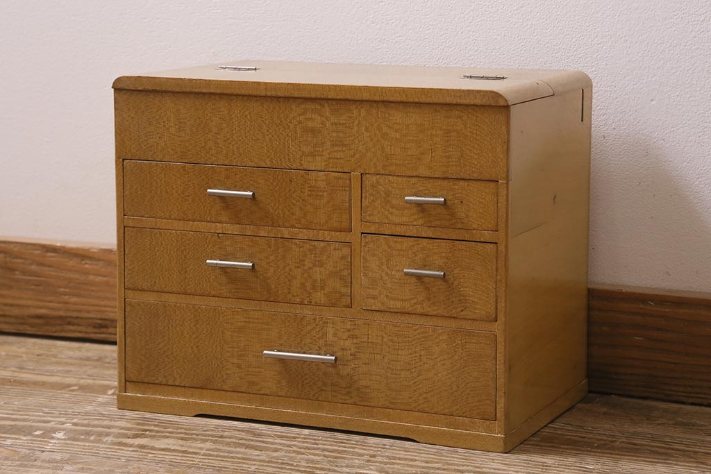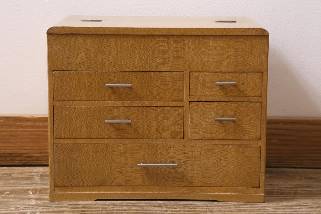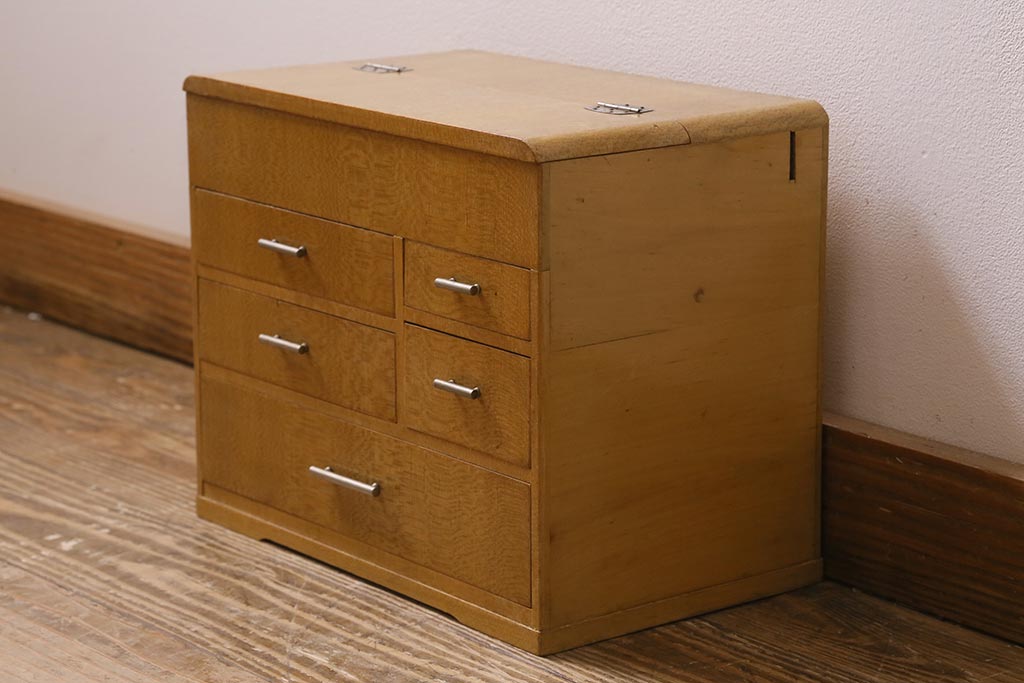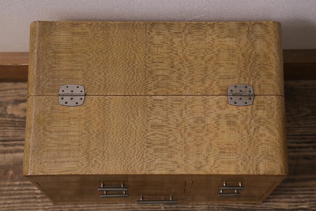 レトロ家具 美品 杢目が素敵な昭和期の裁縫箱(ソーイングボックス、小引き出し)(R-043459)