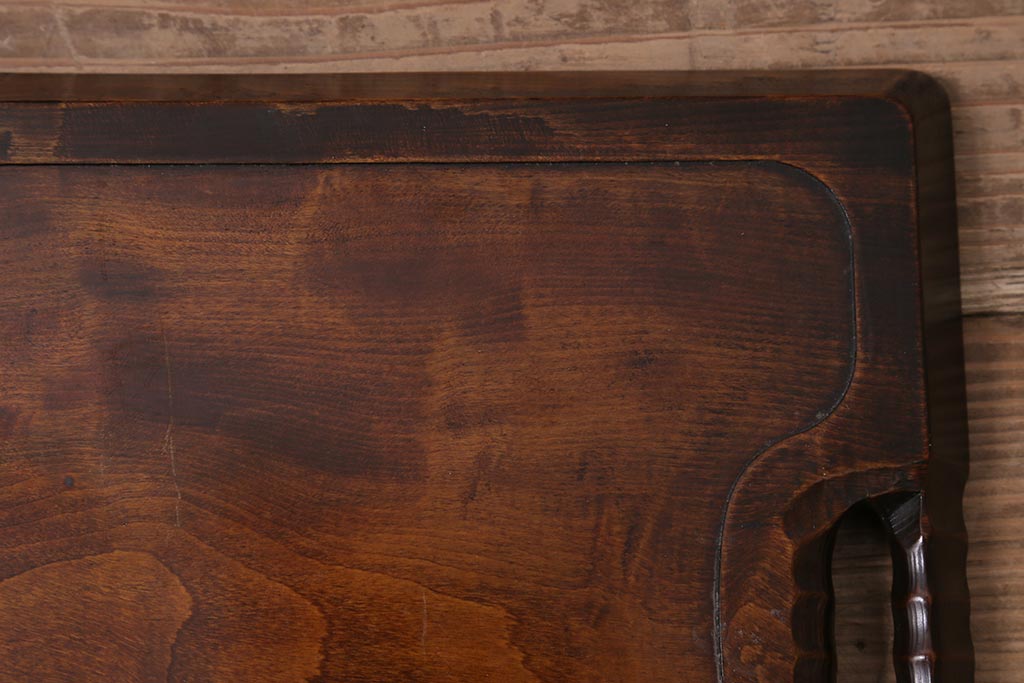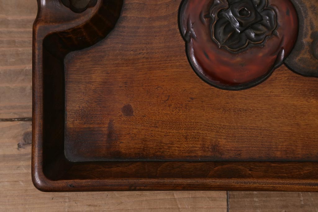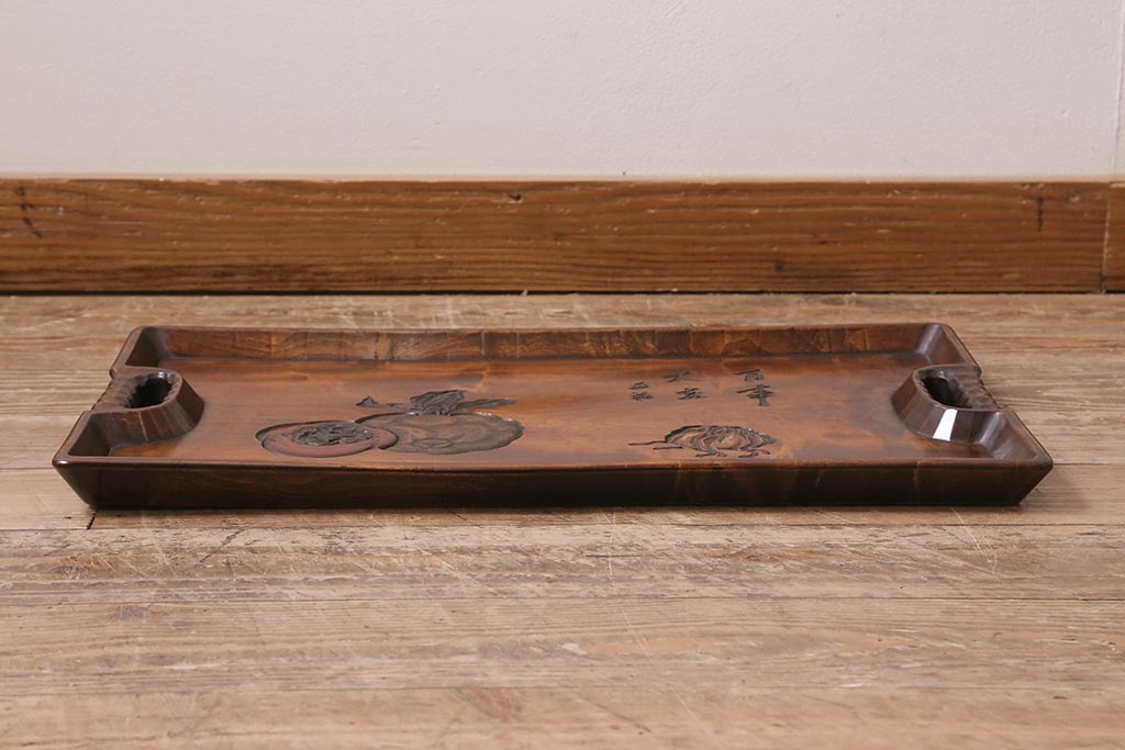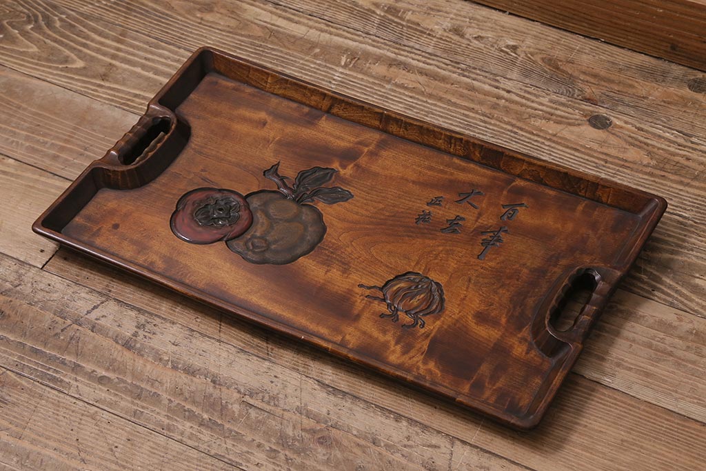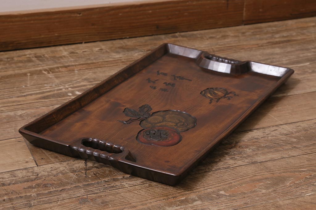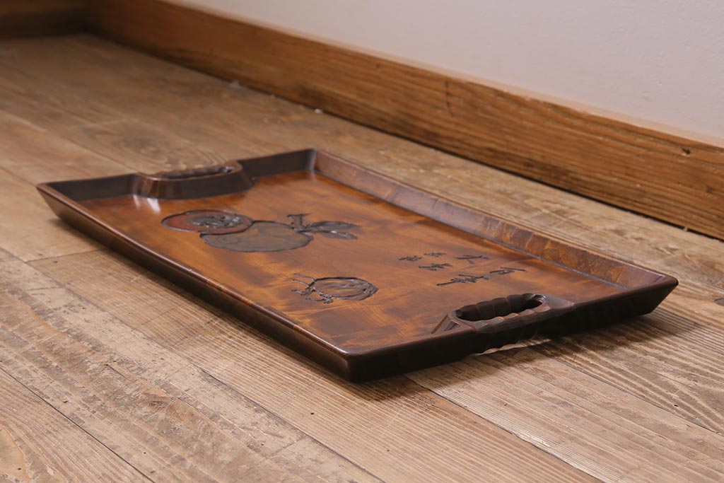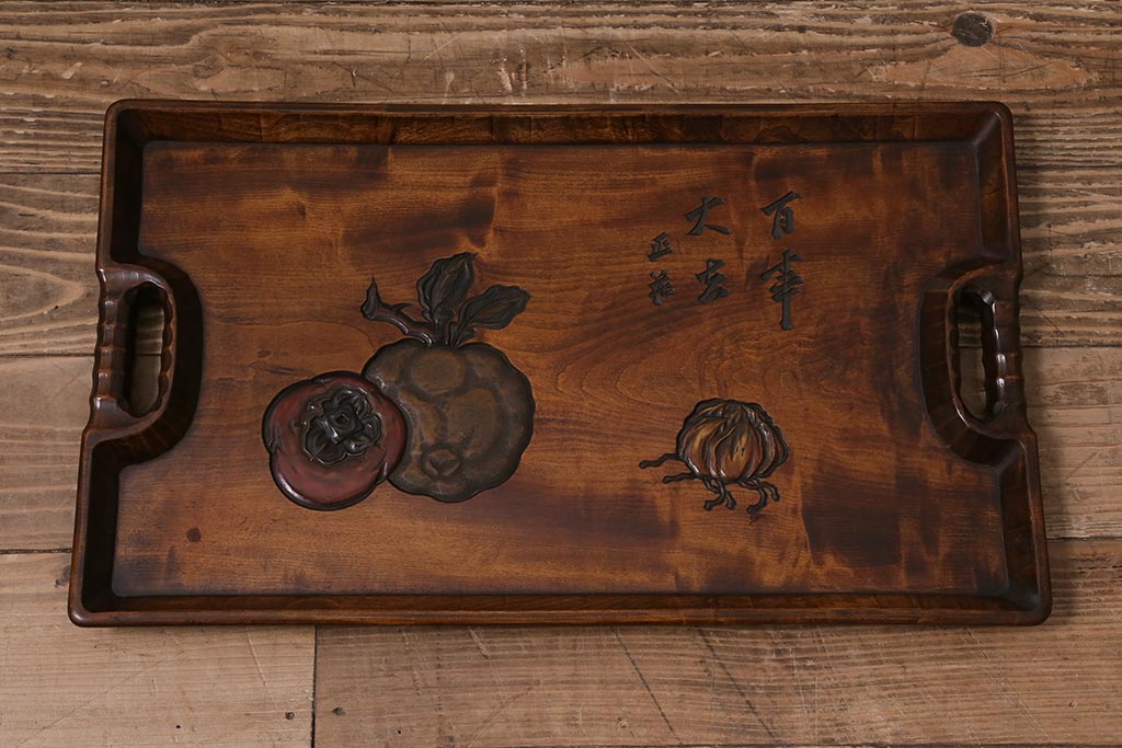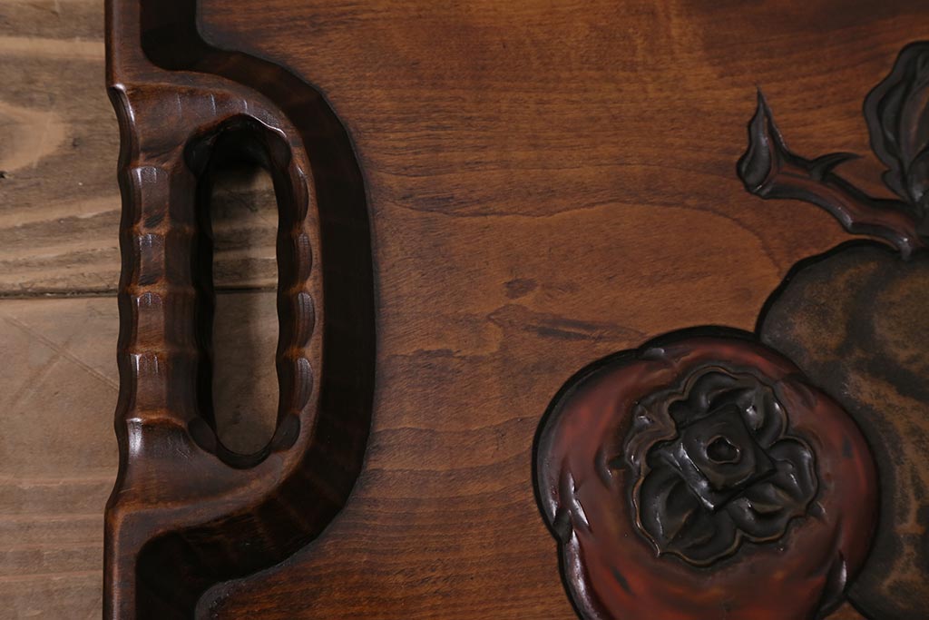 中古 烏城彫り 栃 拭き漆 果物・野菜の図 角膳尺8 手付(盆)(R-043474)