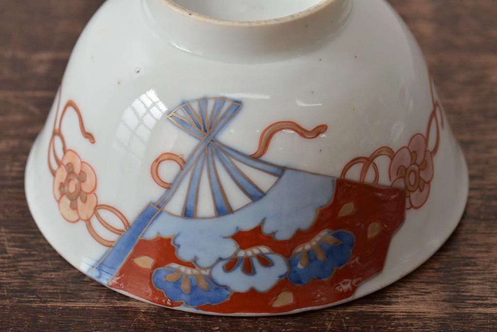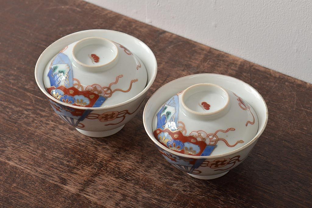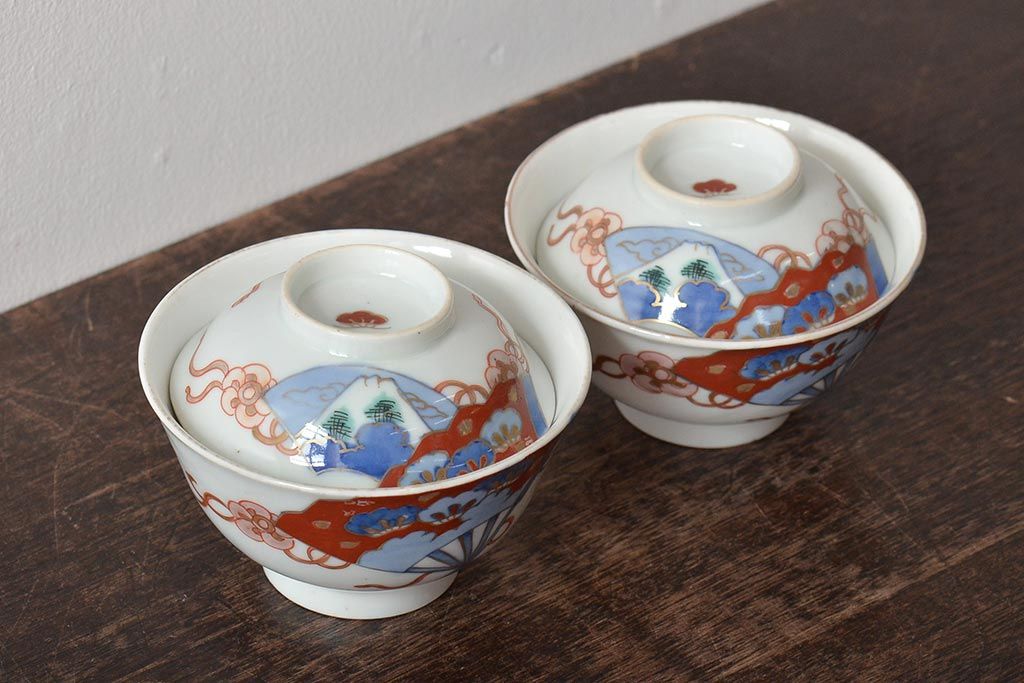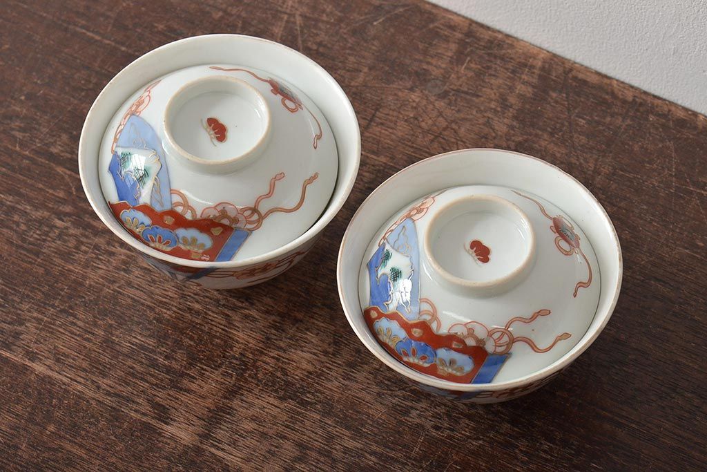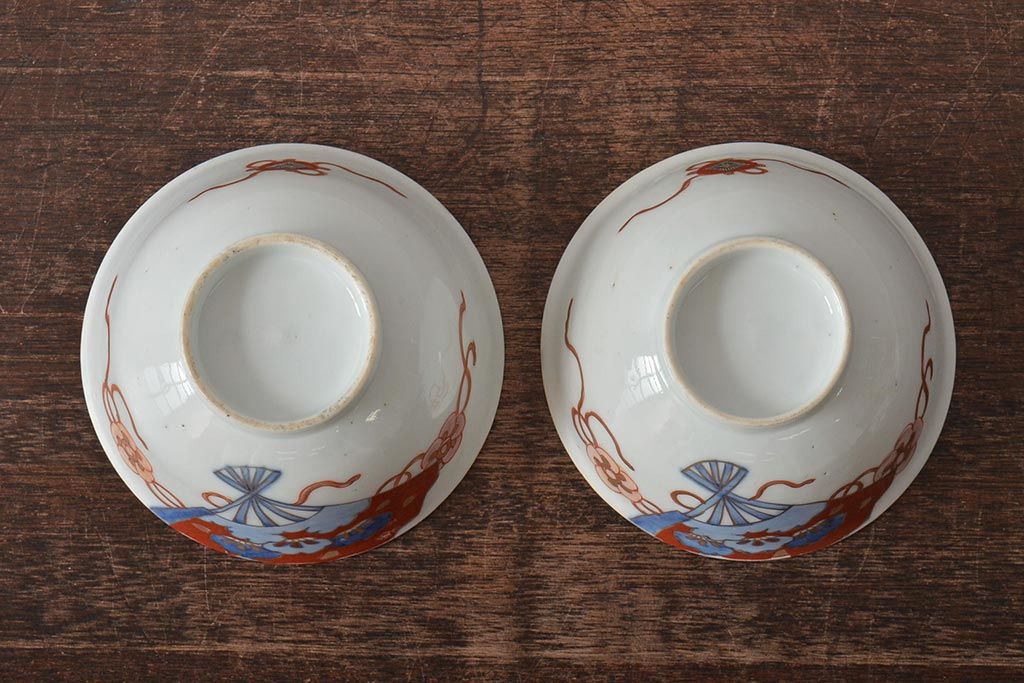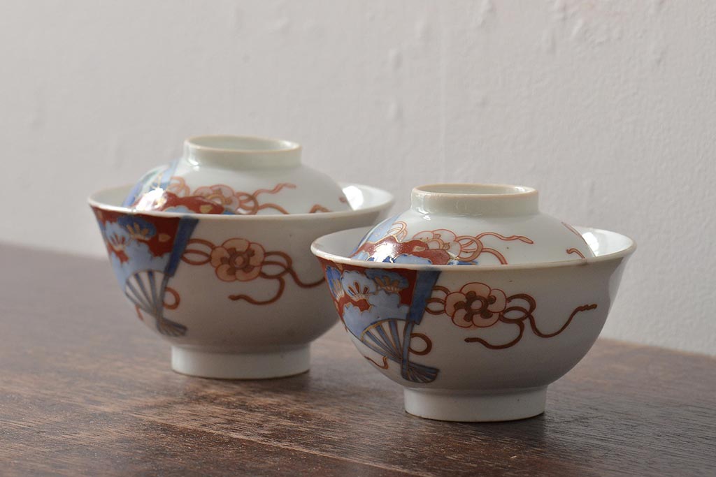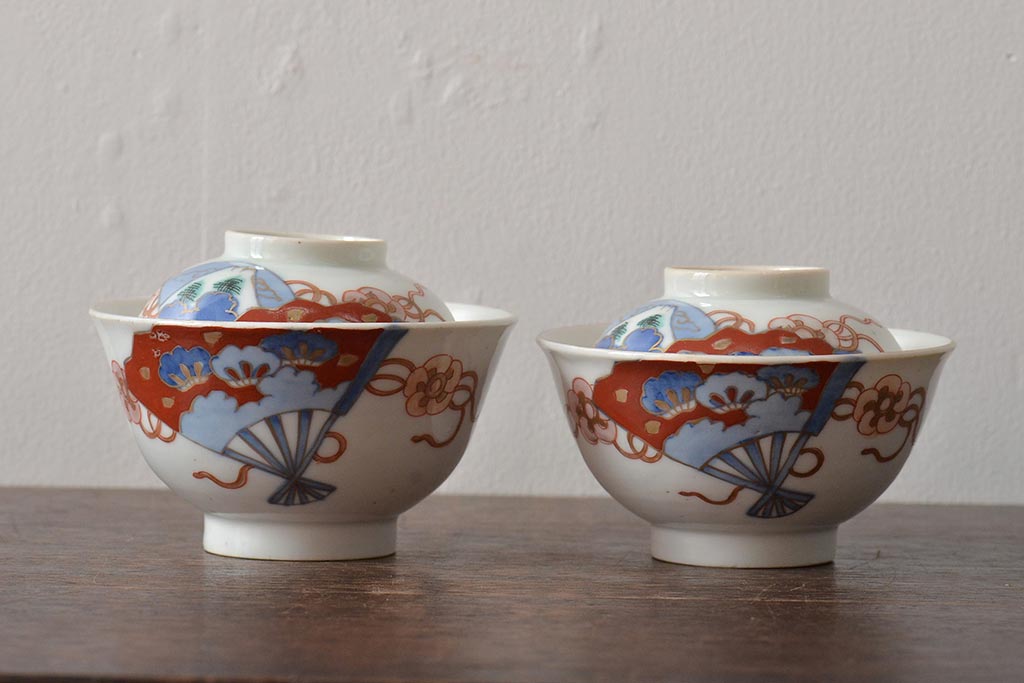 アンティーク雑貨 明治大正期 扇面図色絵蓋茶碗2客セット(和食器)(R-043334)