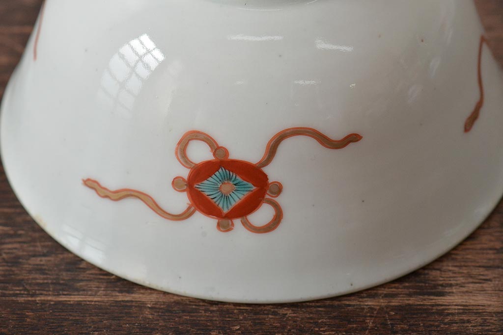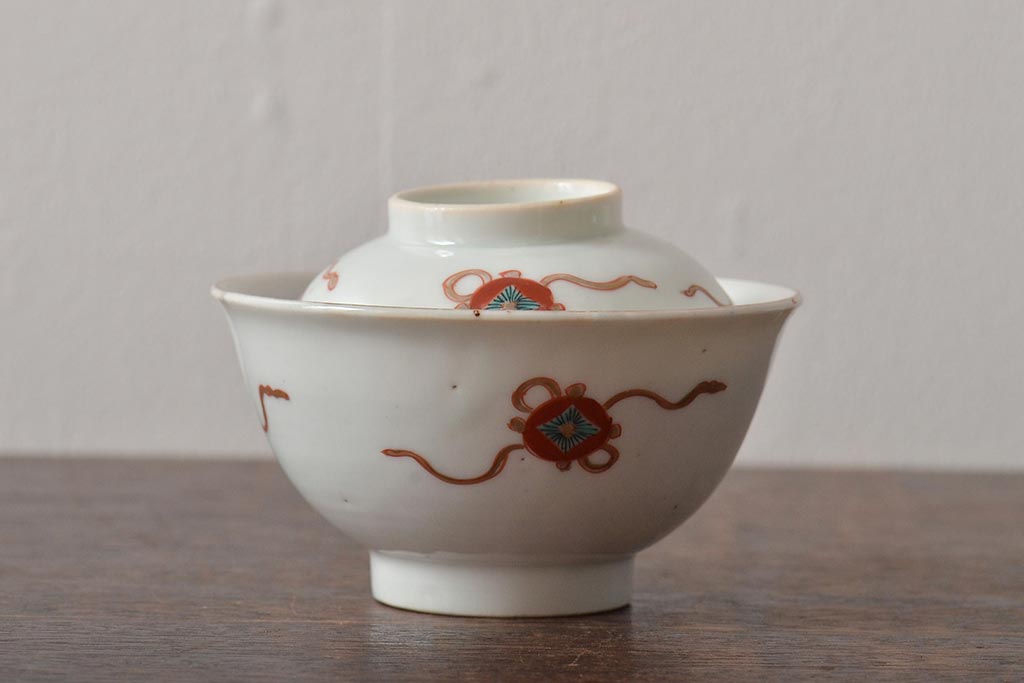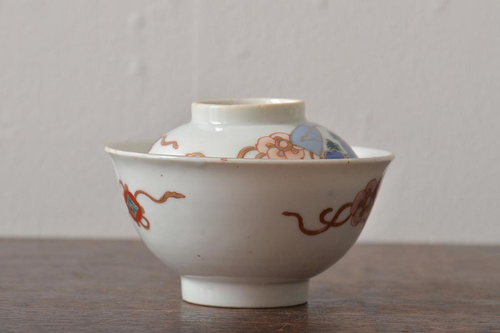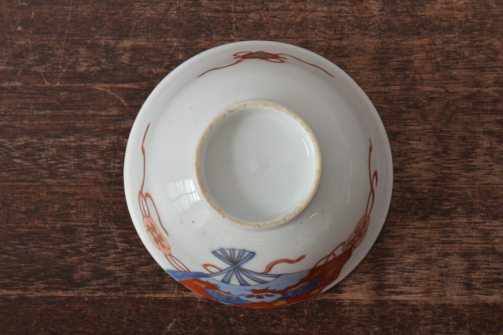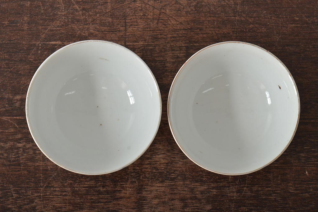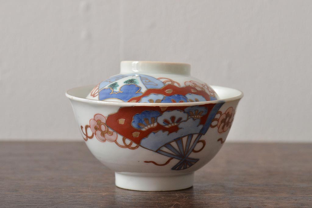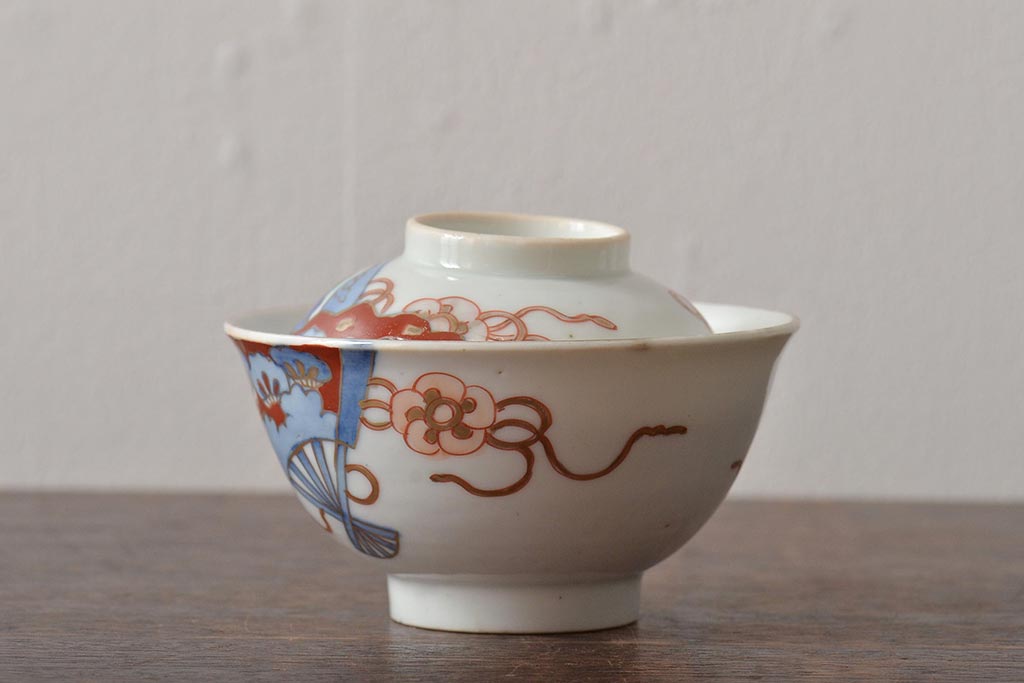 アンティーク雑貨 明治大正期 扇面図色絵蓋茶碗2客セット(和食器)(R-043334)