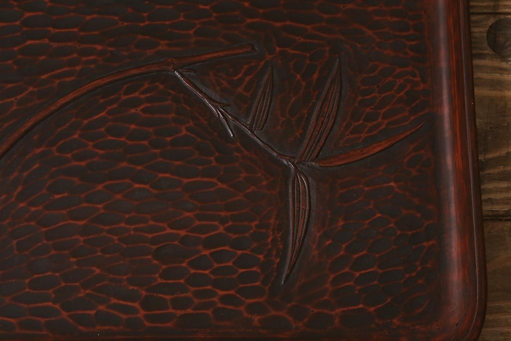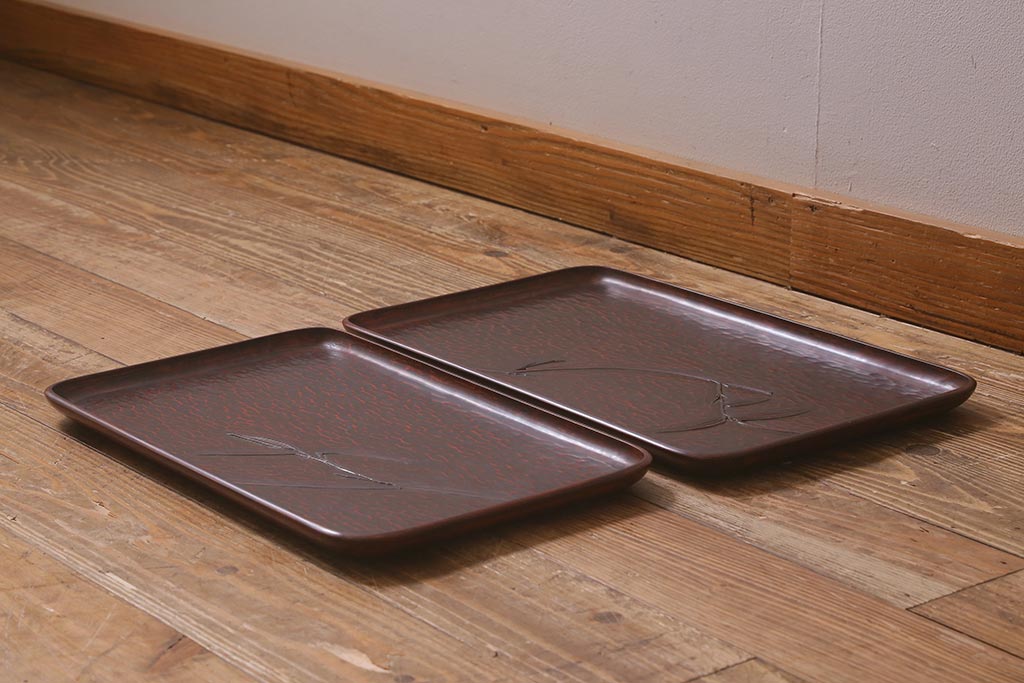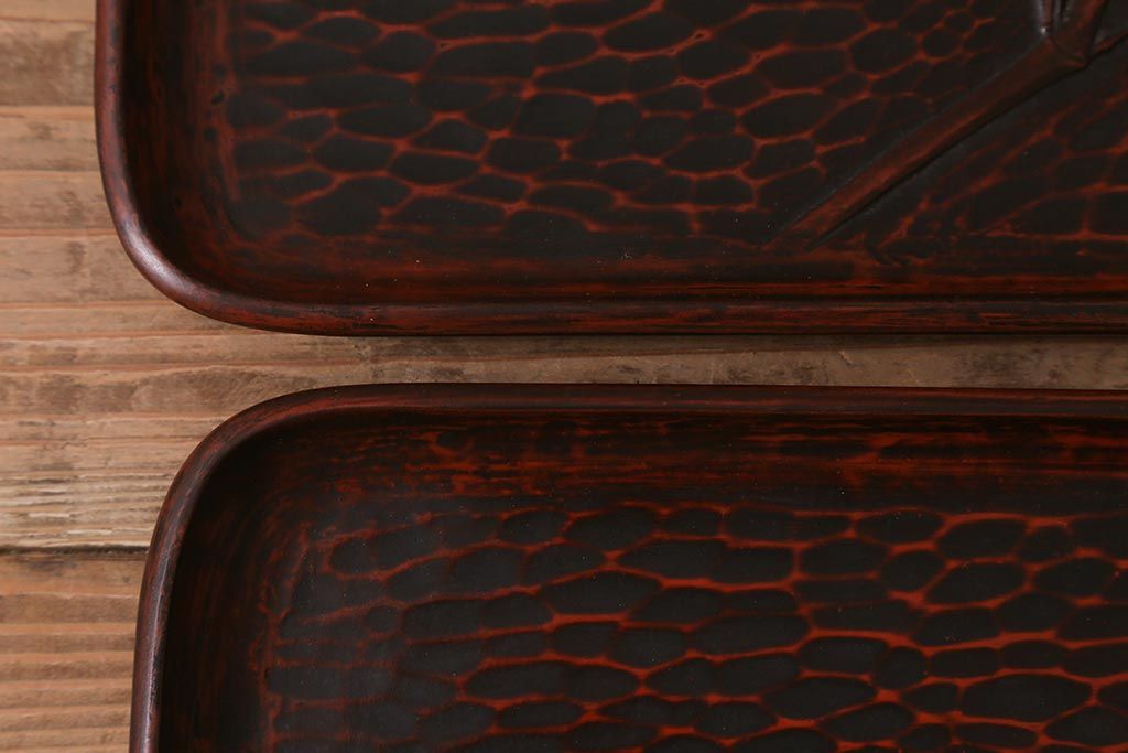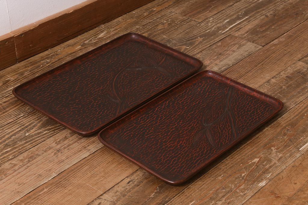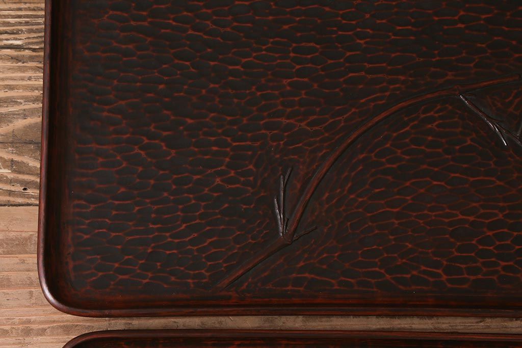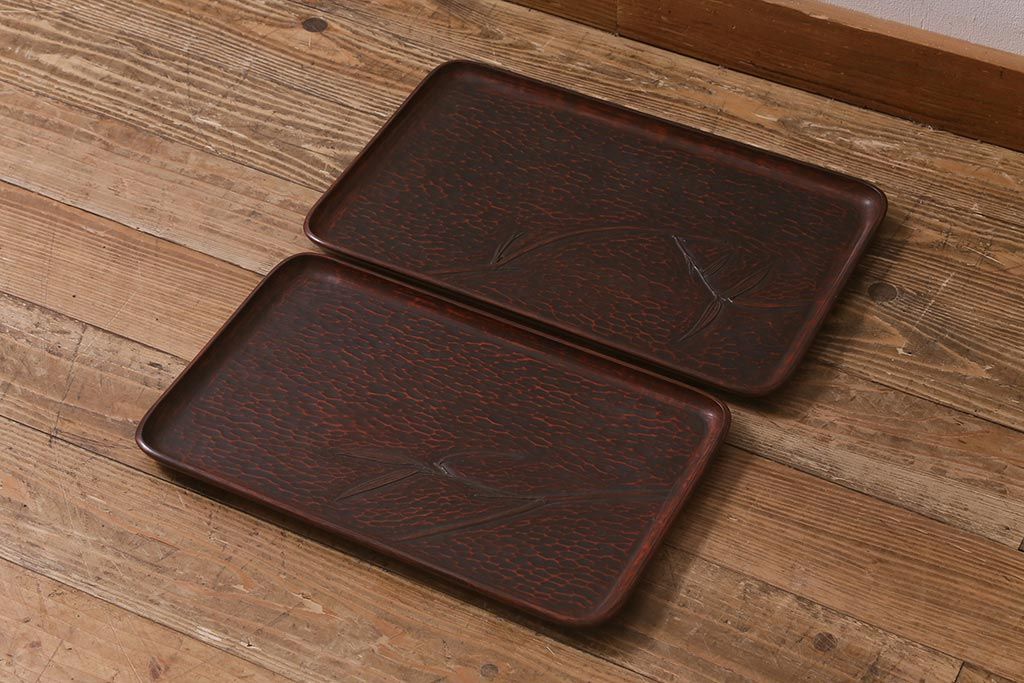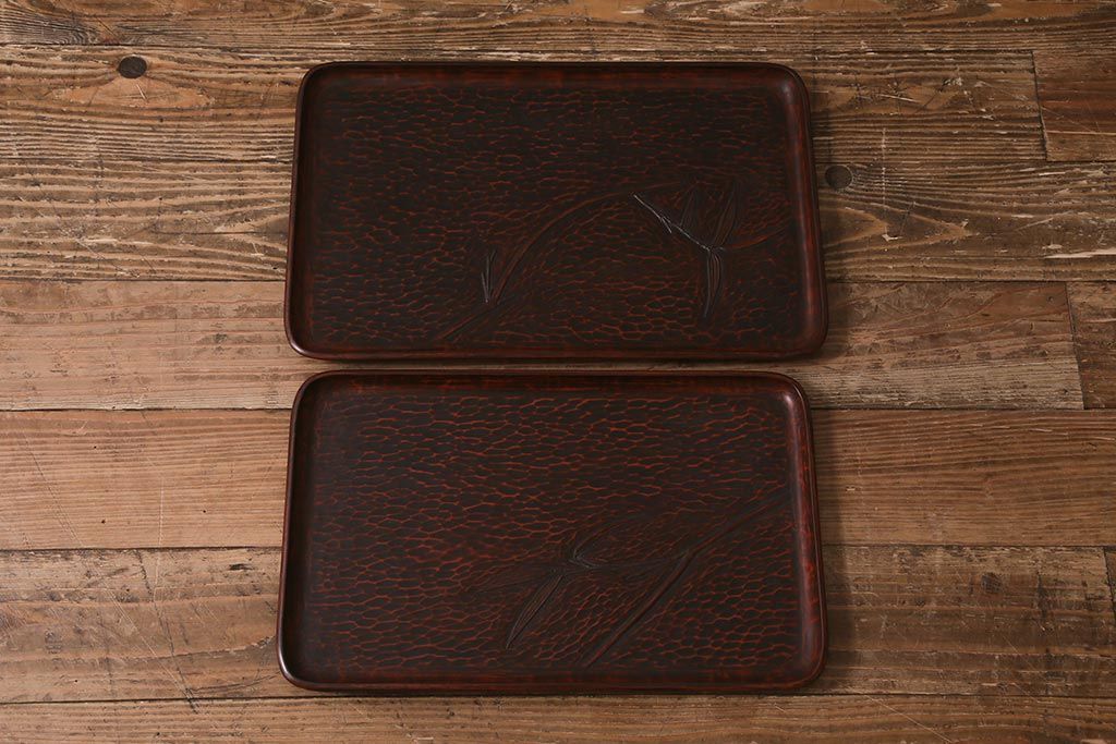 昭和初期 伝統工芸 古い鎌倉彫り 花○堂 笹 お盆2枚セット(角盆、漆器)(R-043005)