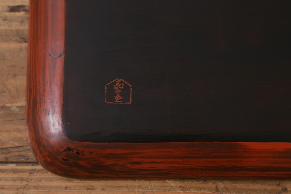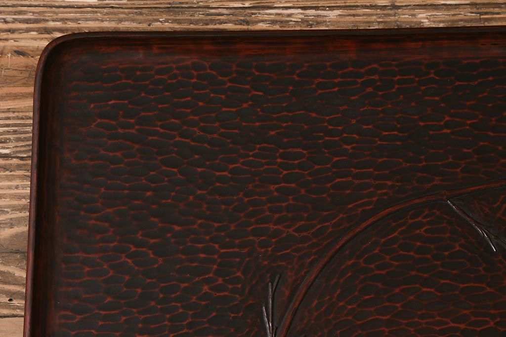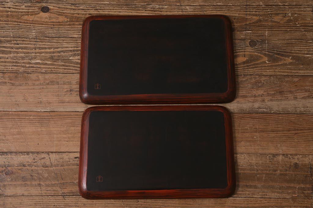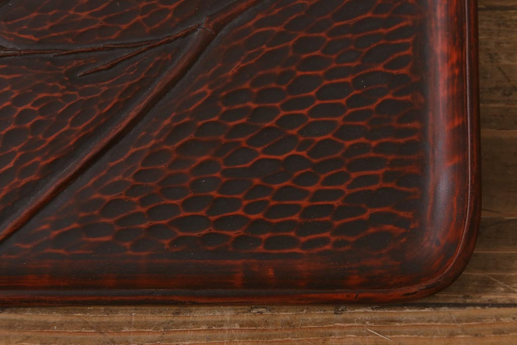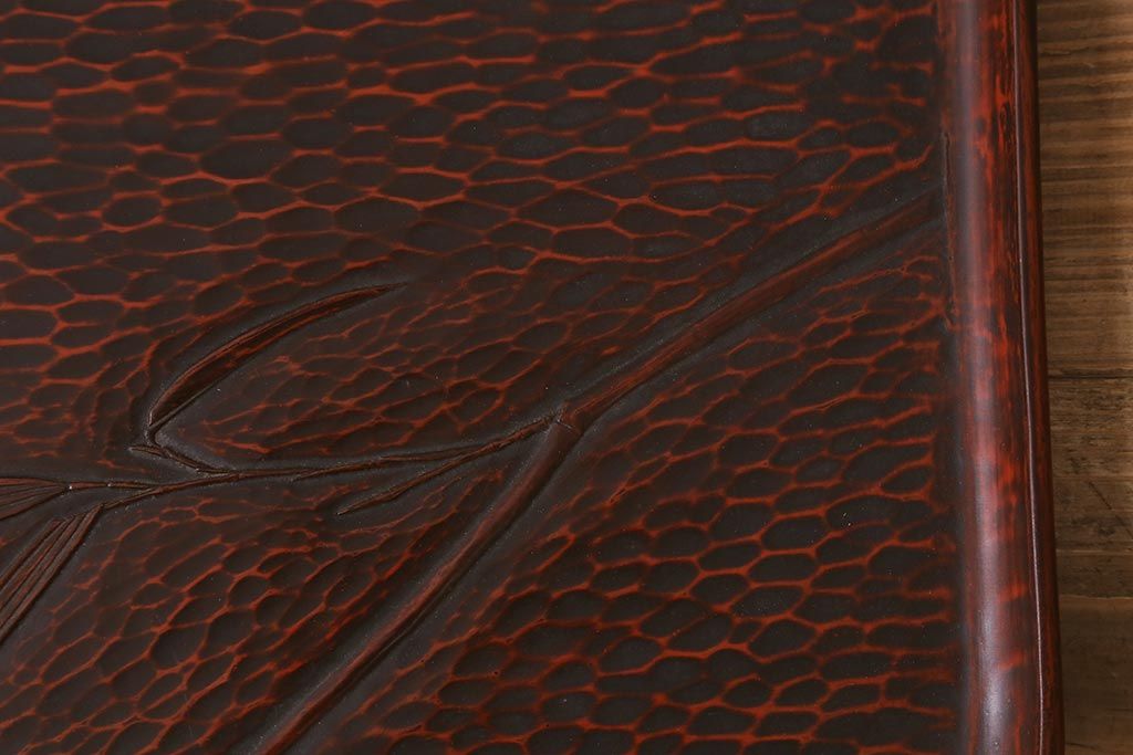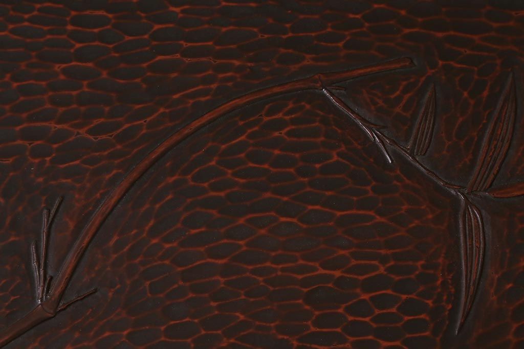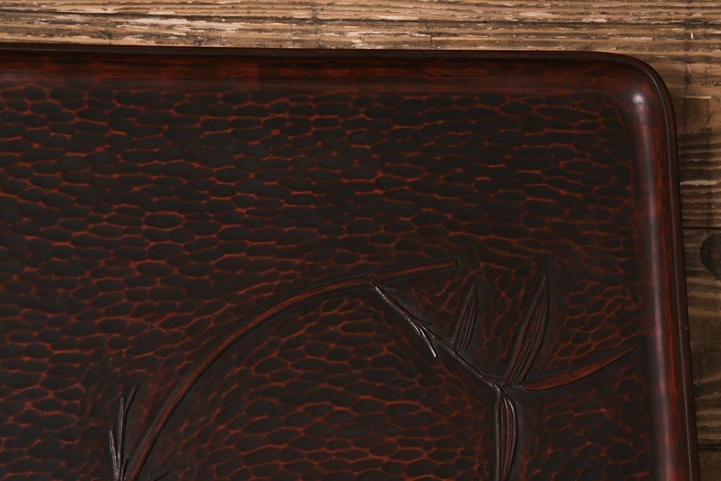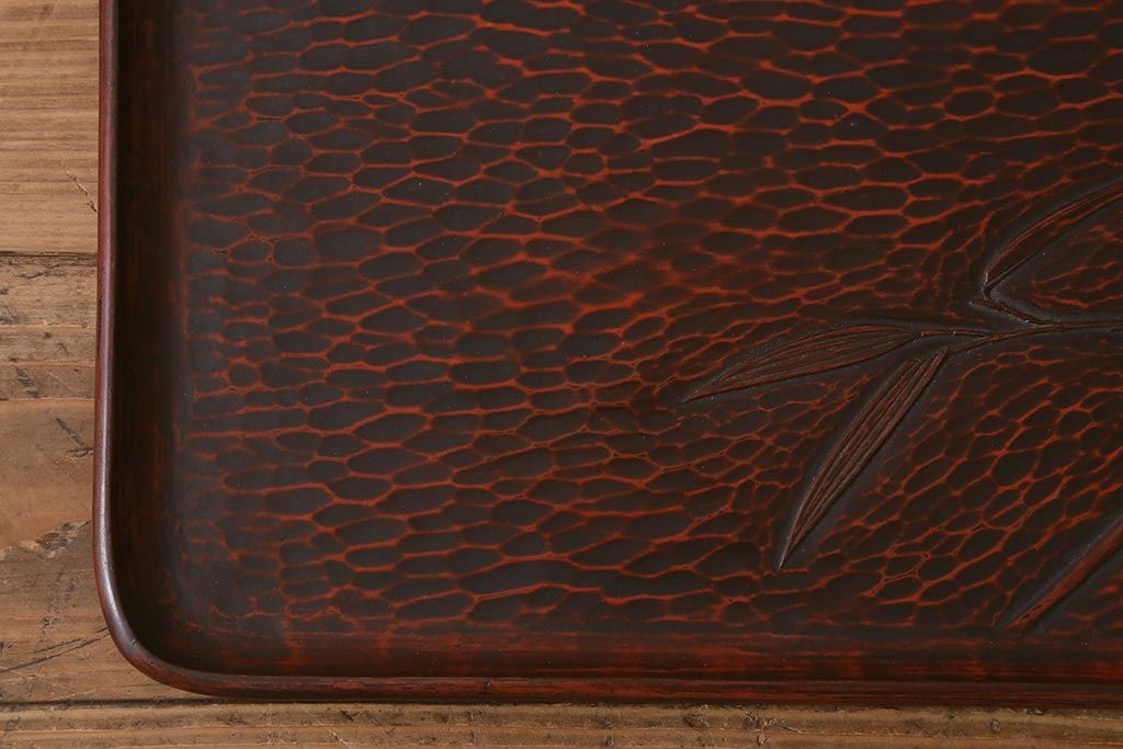 昭和初期 伝統工芸 古い鎌倉彫り 花○堂 笹 お盆2枚セット(角盆、漆器)(R-043005)