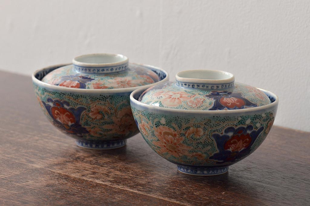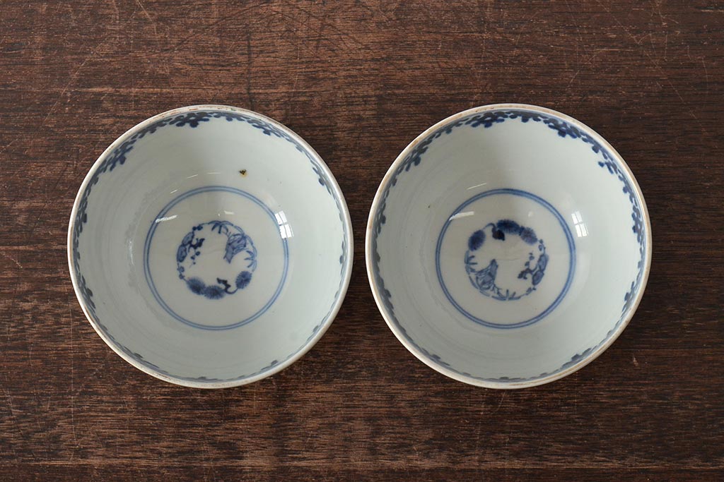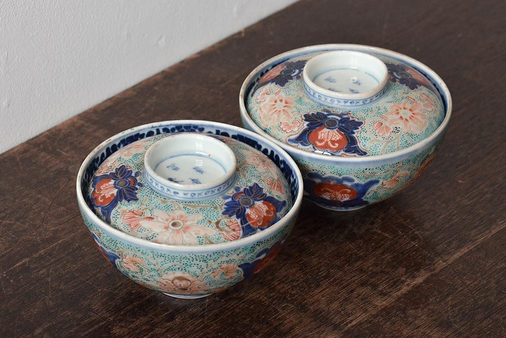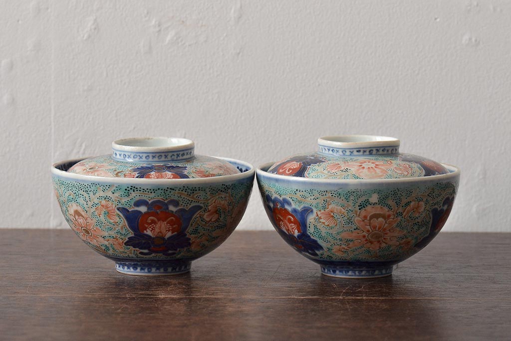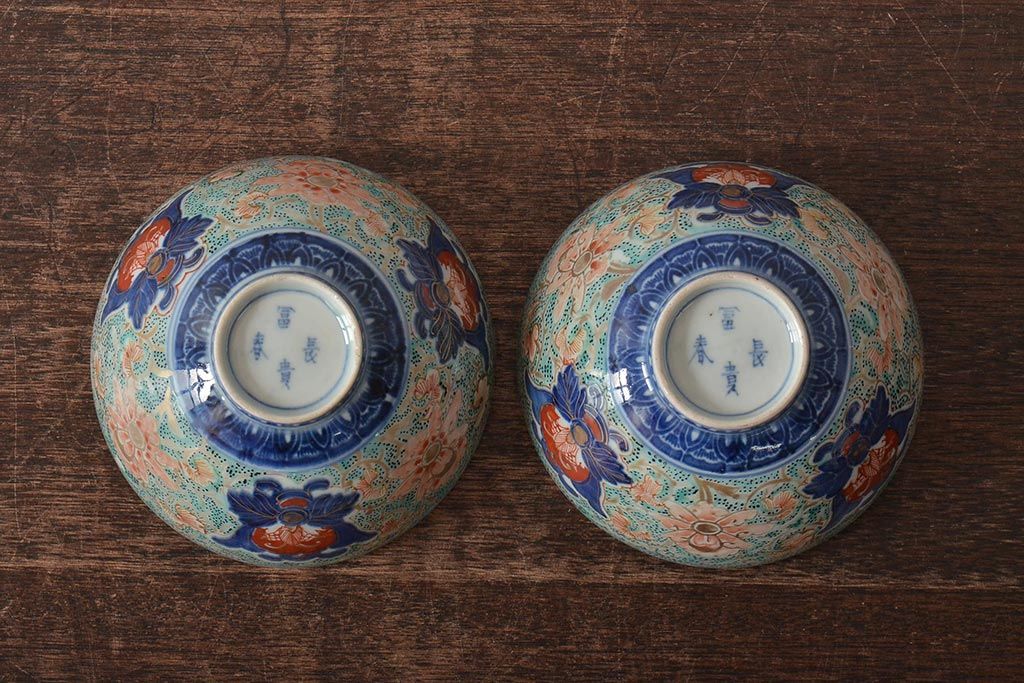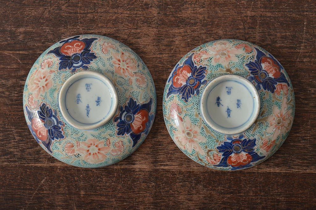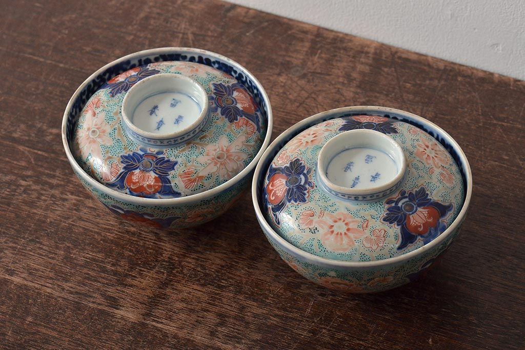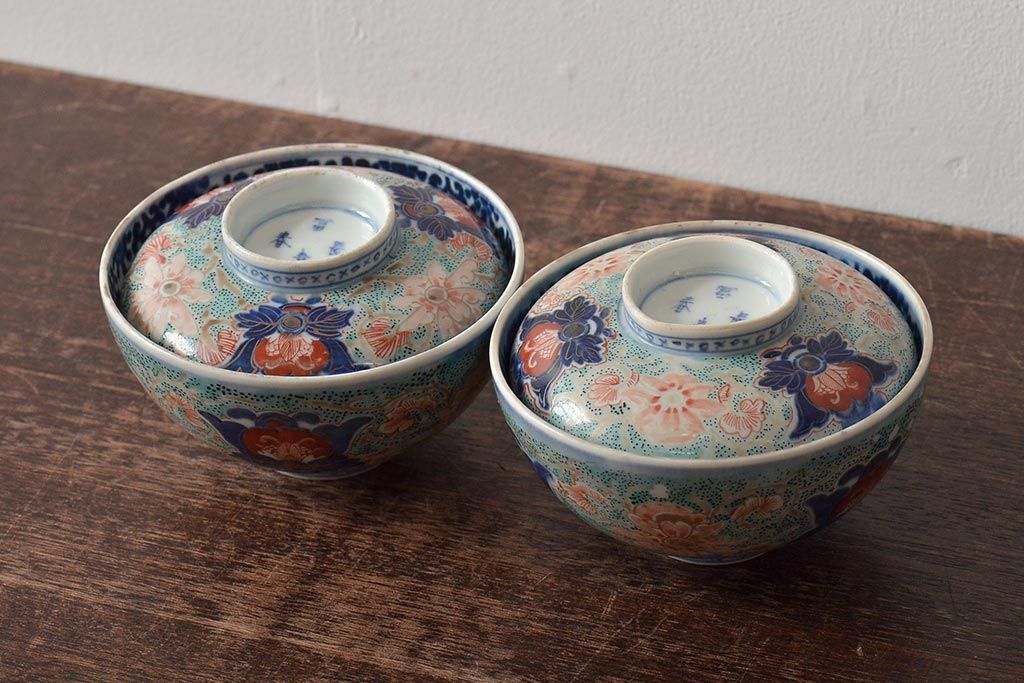 アンティーク雑貨 幕末〜明治 富長貴春銘 色絵染付蓋茶碗2客セット(和食器)(R-043102)