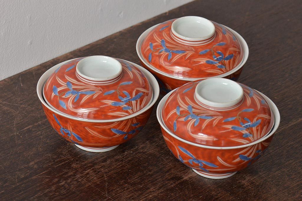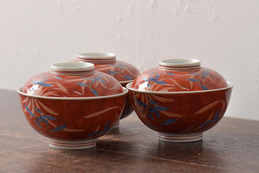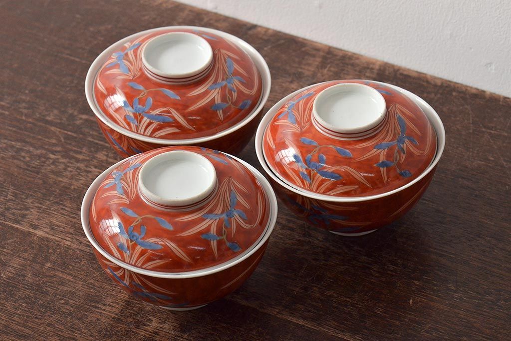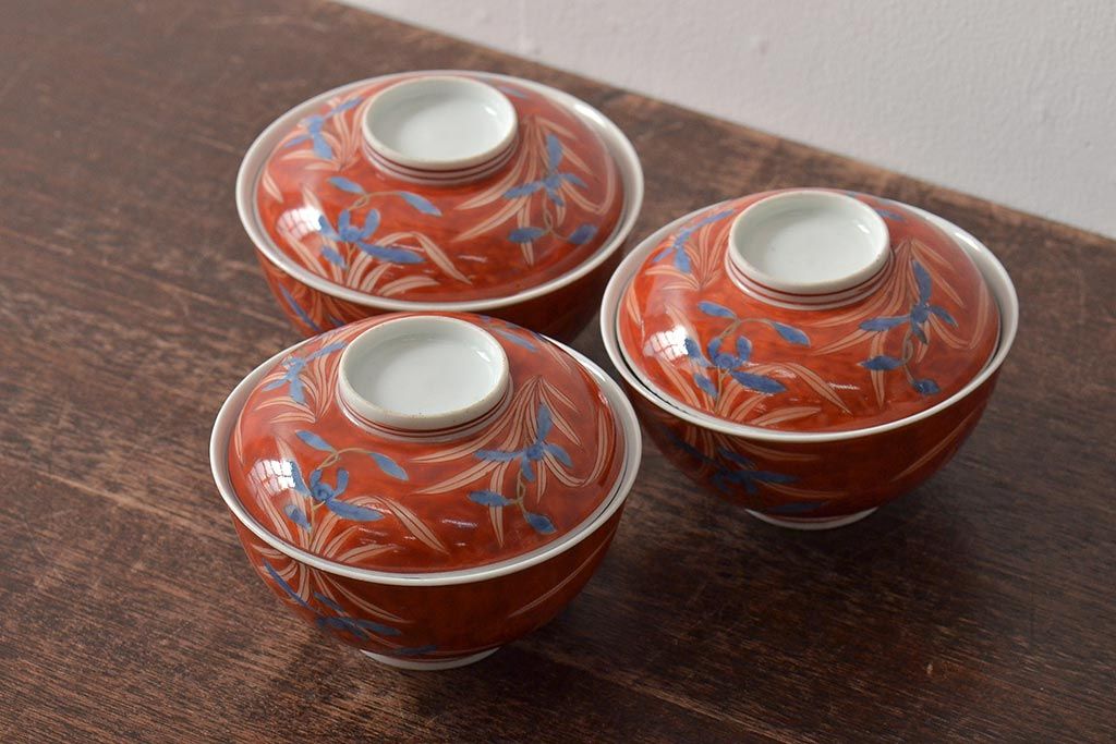 ラフジュ工房> 和食器・茶道具> お椀・茶碗 > アンティーク雑貨 江戸期 古伊万里 赤絵蘭模様蓋茶碗3客セット(和食器)(R-043103)