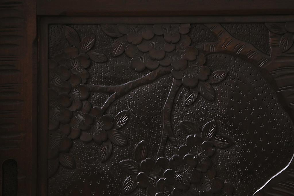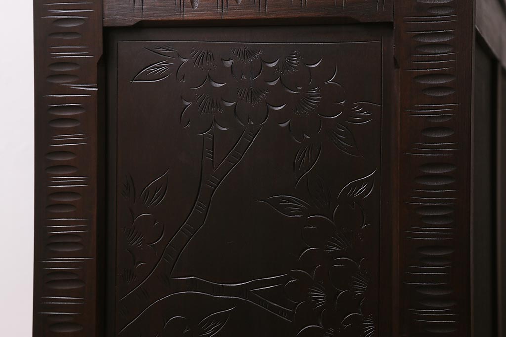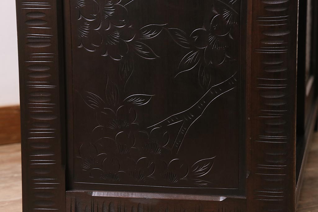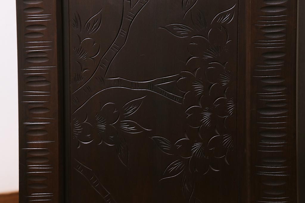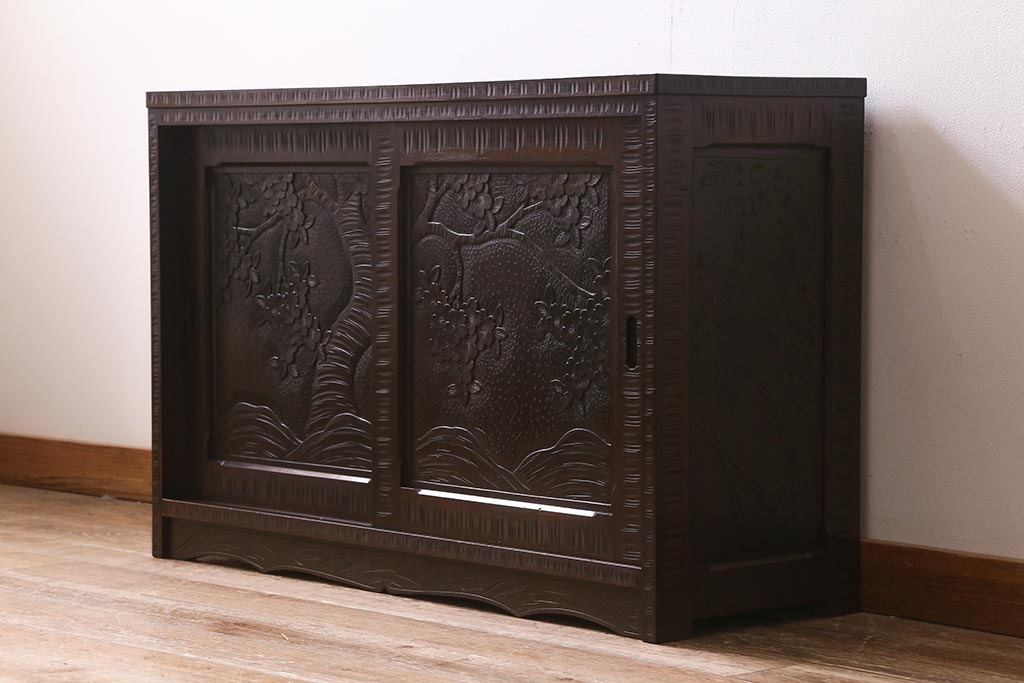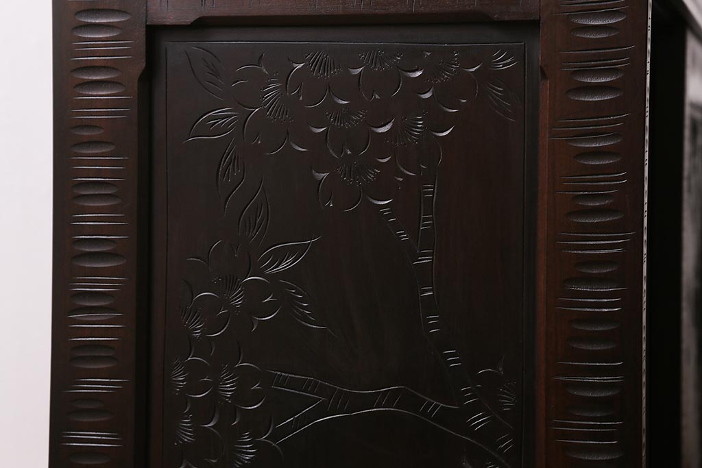 中古 美品 軽井沢彫り 美しい桜の意匠が散りばめられた戸棚(収納棚、キャビネット)(R-043502)